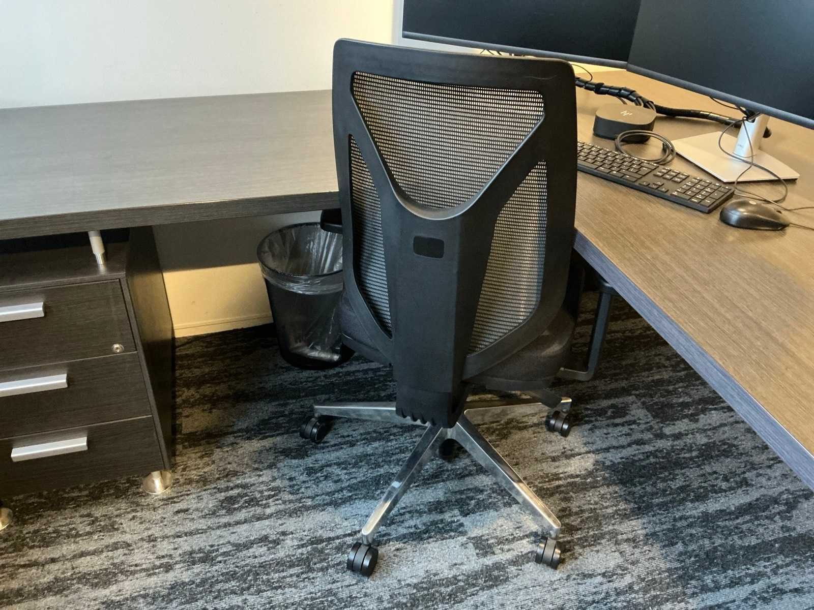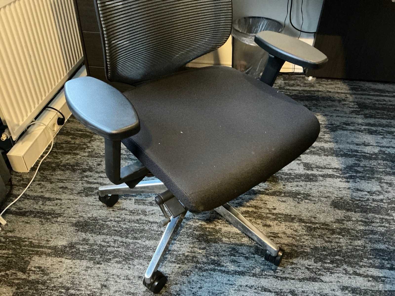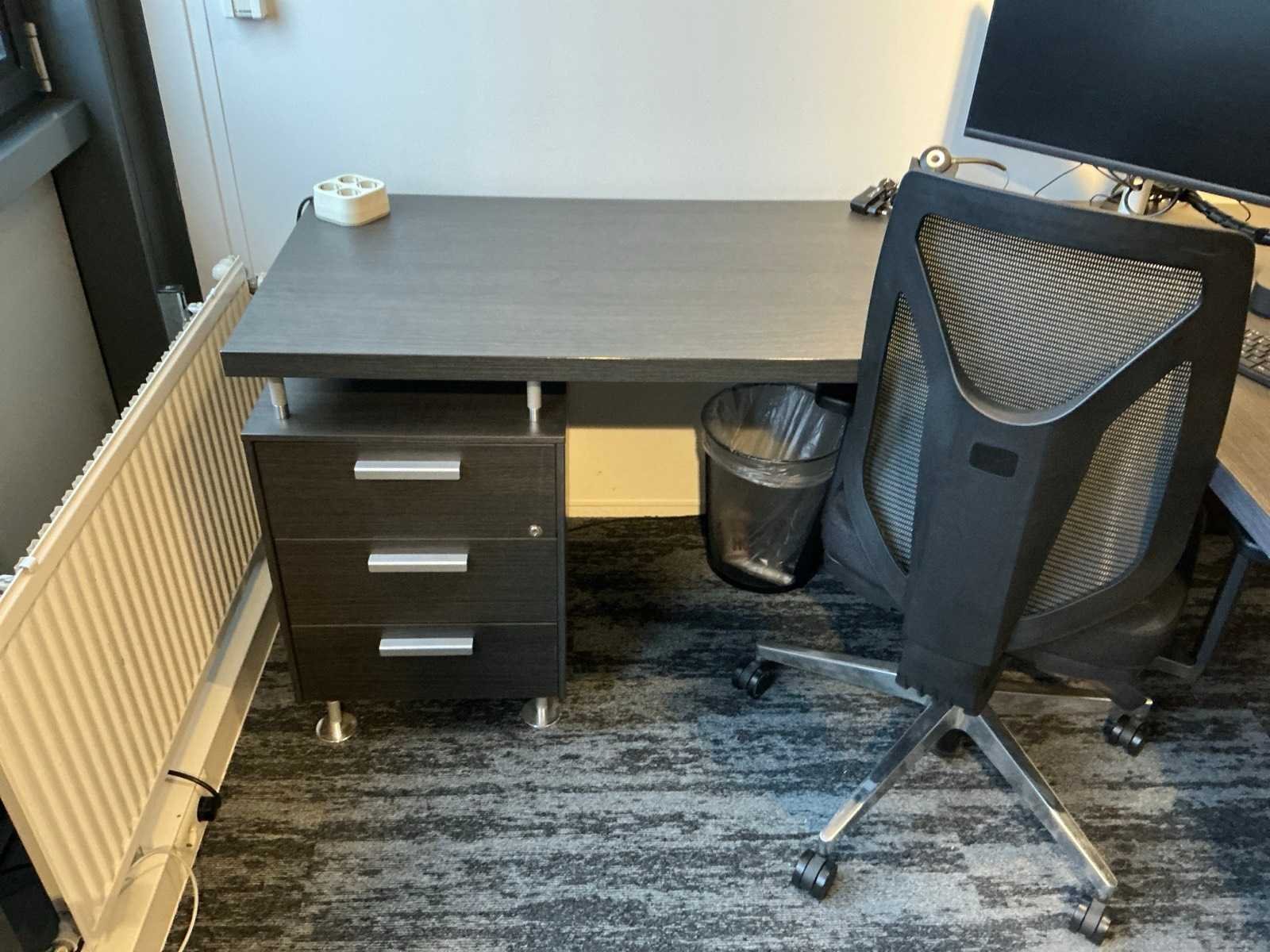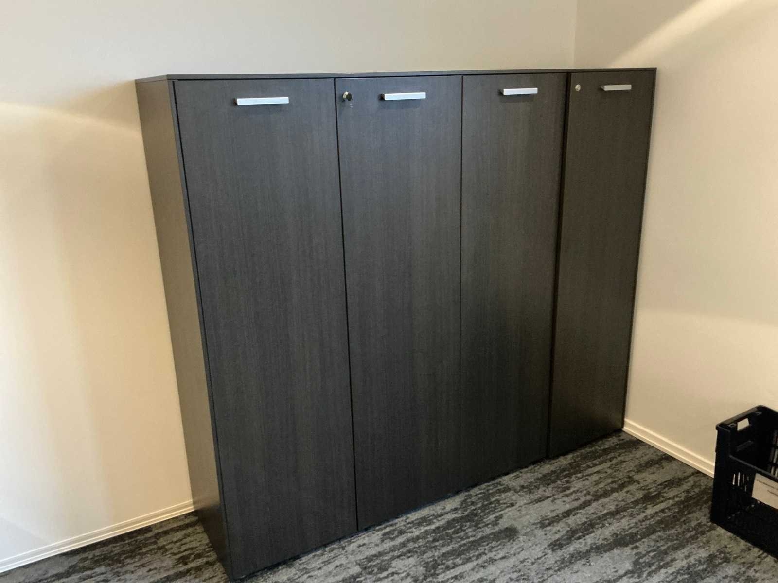 Inhoud van 1 kantoorruimte, bestaande uit een vergadertafel 180x90cm met 4 slede stoelen v.v. lederen bekleding, 1 Hoekbureau 210x200x74cm met ladeblok en bureaustoel, een 4deurs kast 183x46x157cm, 1 hanglamp 3 lichts met stoffen kap.