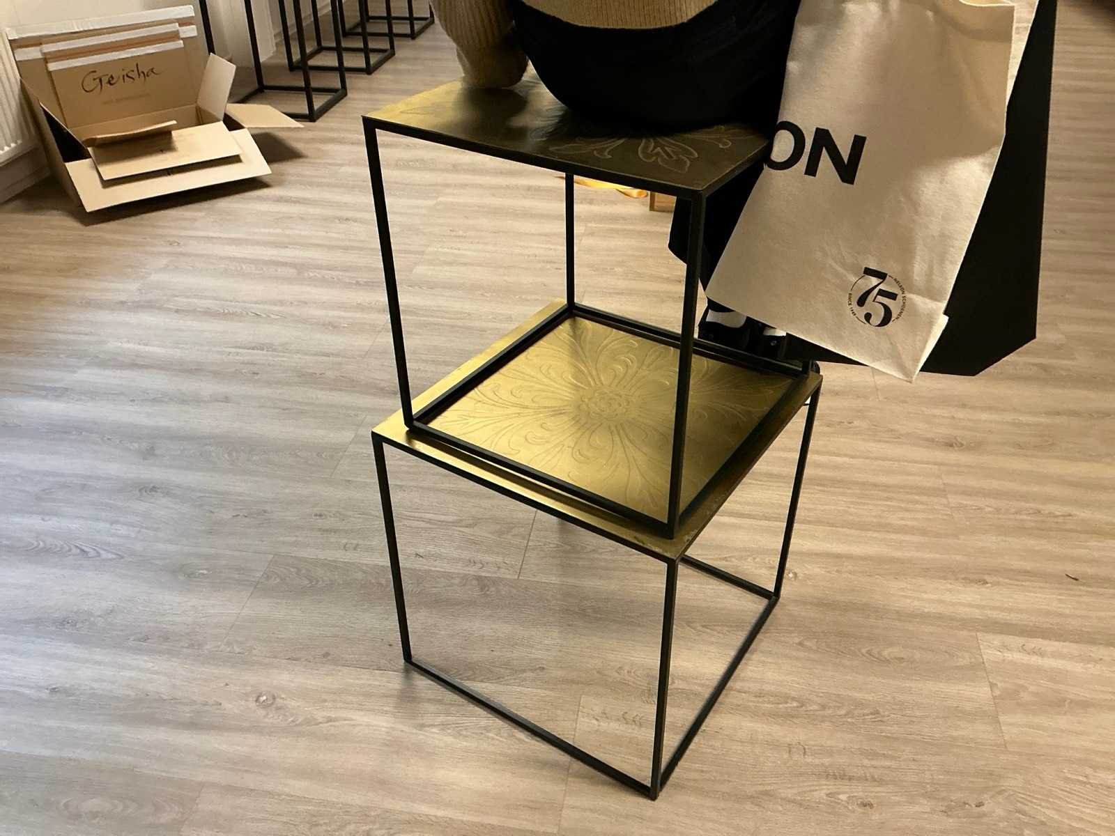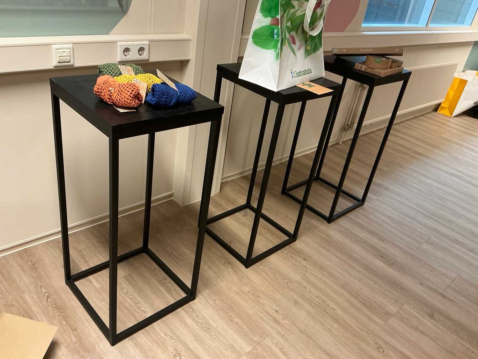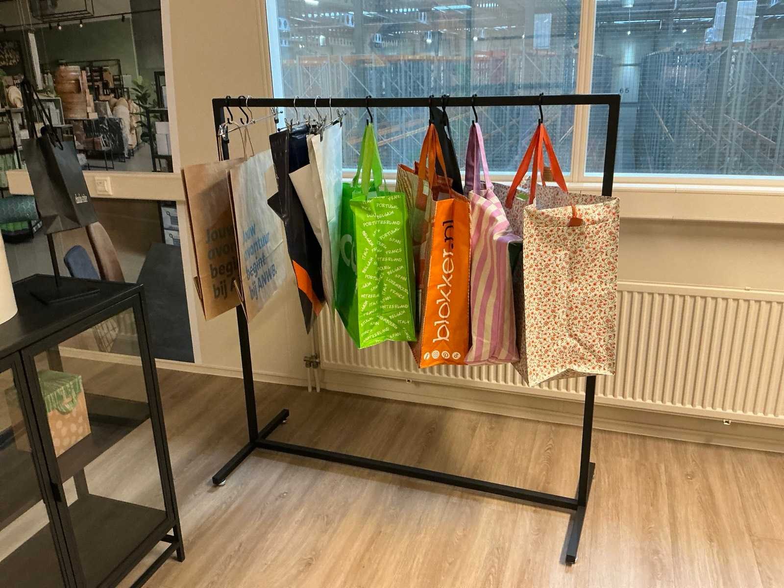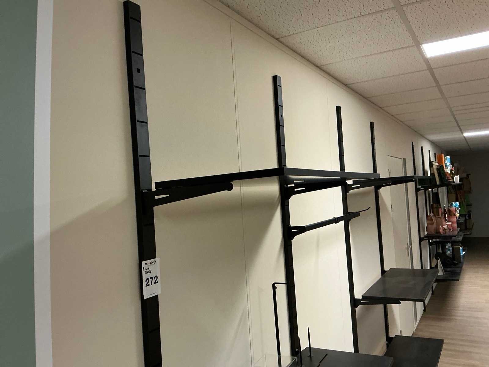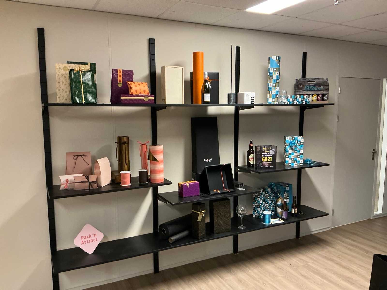 9x sectie wandstelling 100x47x240cm, vitrinekast 153x35x86cm, kledingrek, 6 zuilen (metaal met houten top) 41x41x91cm.
