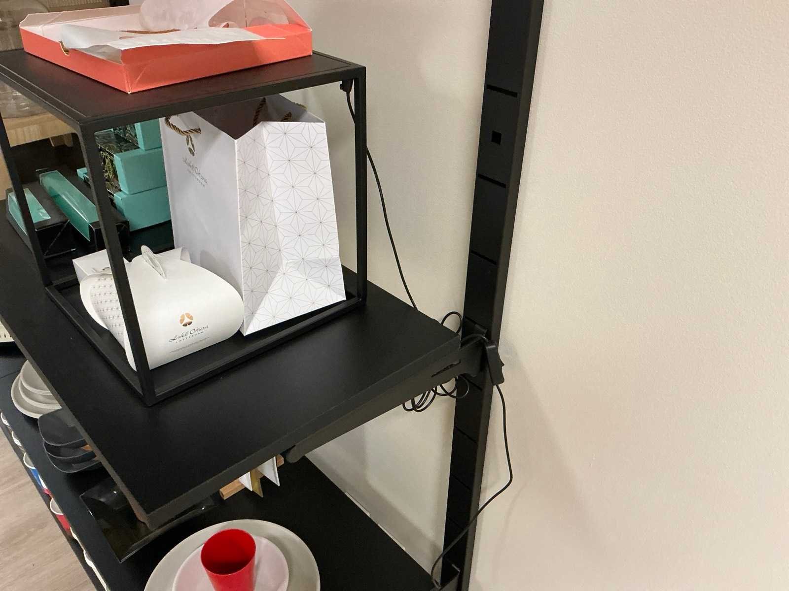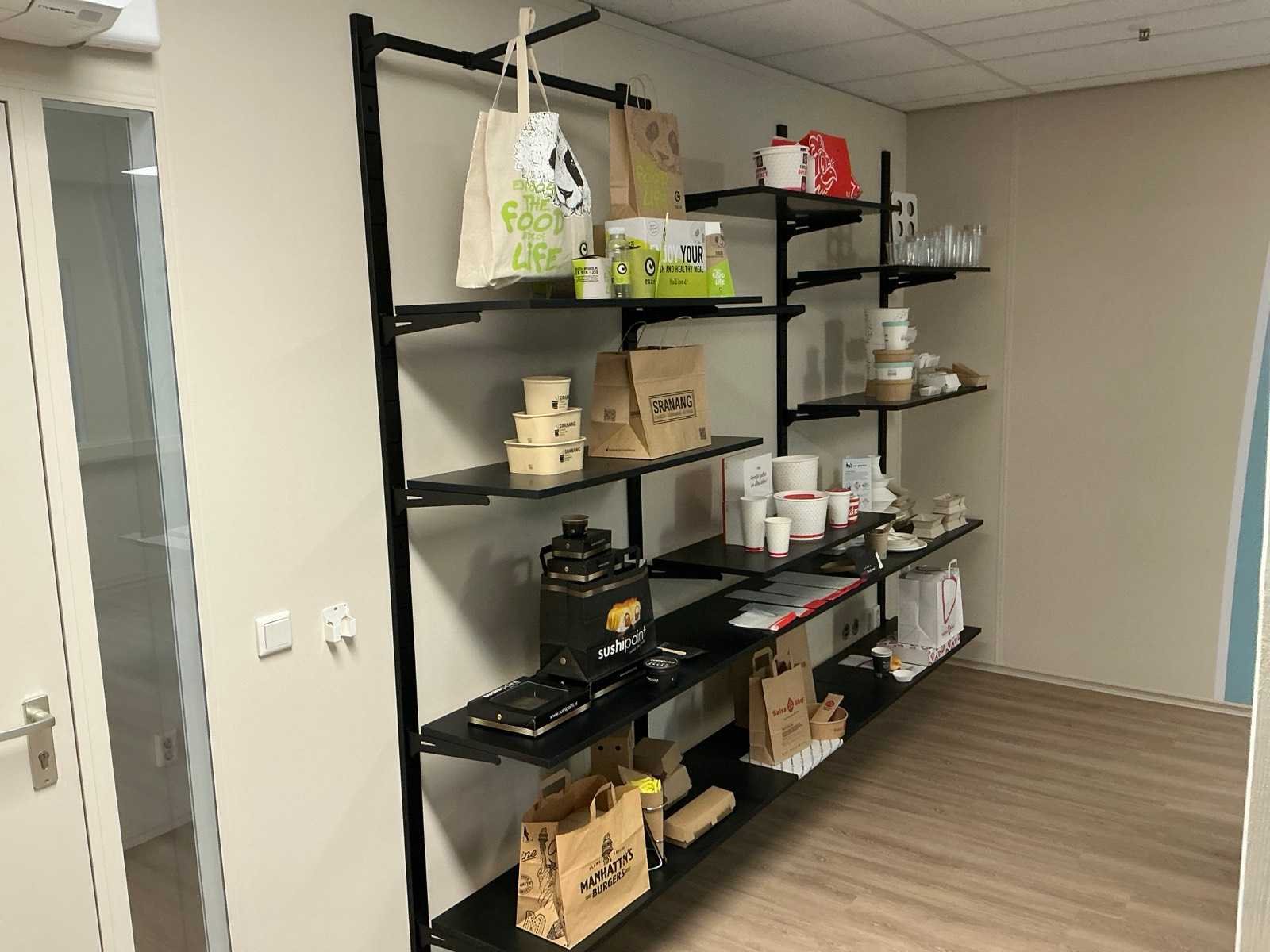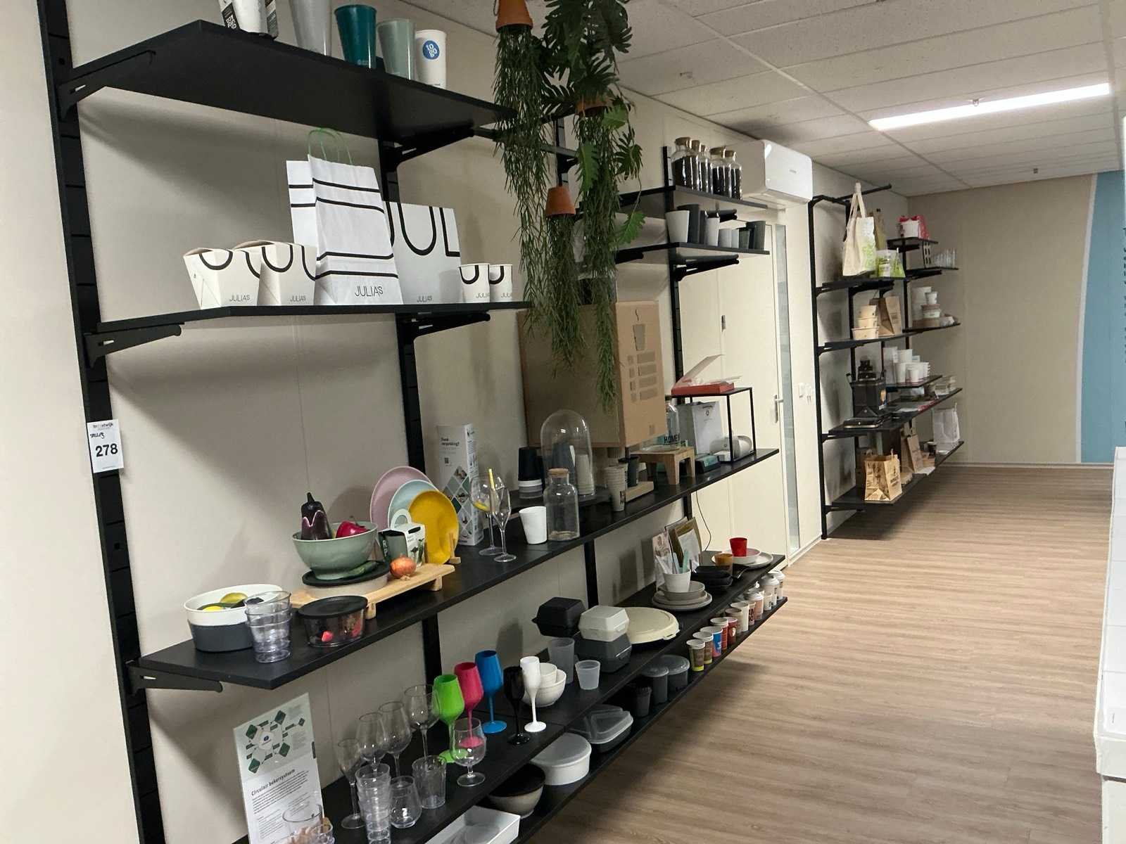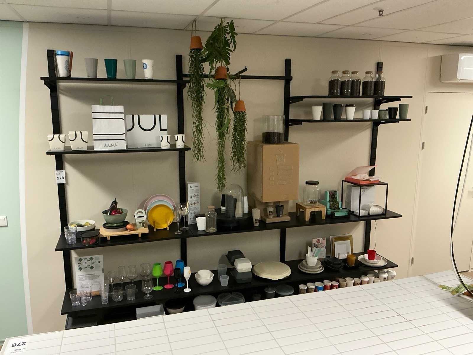 Kavel bestaat uit 7 secties wandstelling met legborden. Afmeting per sectie 100x48x240cm