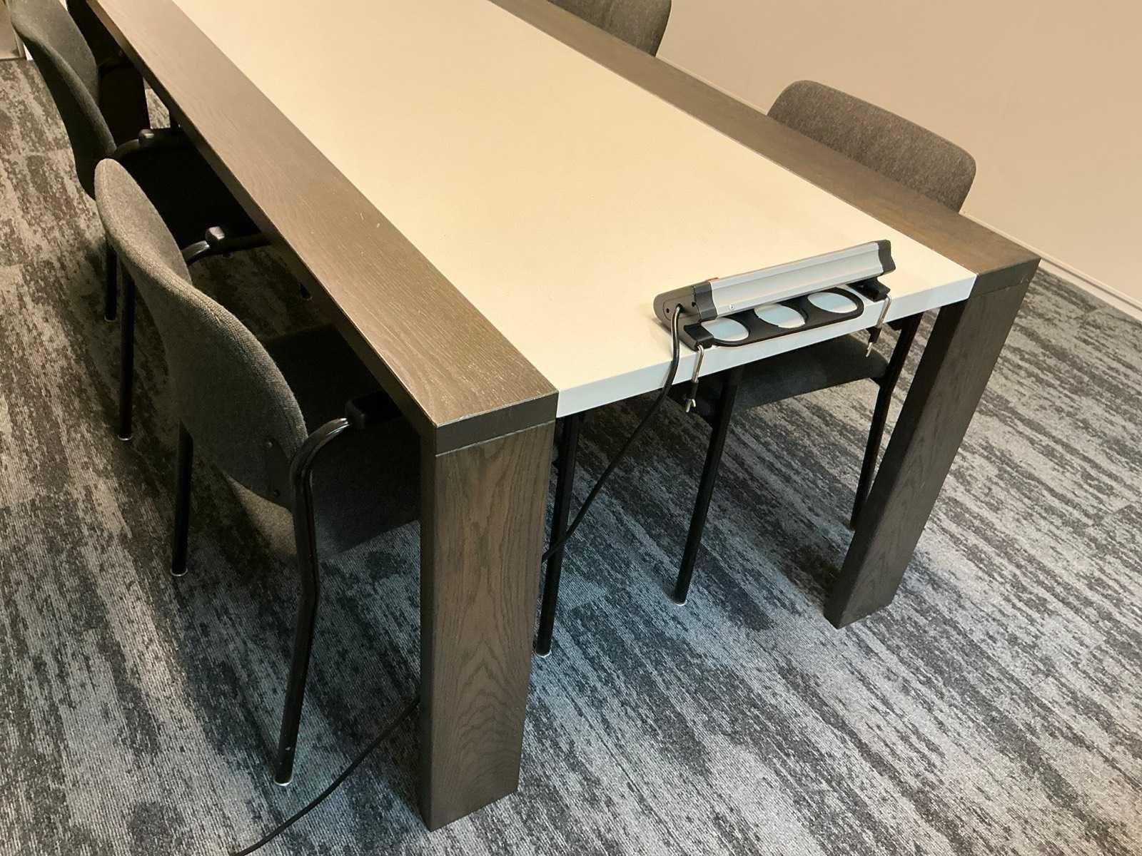 Inclusief 5x stoel met stoffen bekleding Lengte: 210cm Breedte: 100cm Hoogte: 76cm Materiaal: Hout