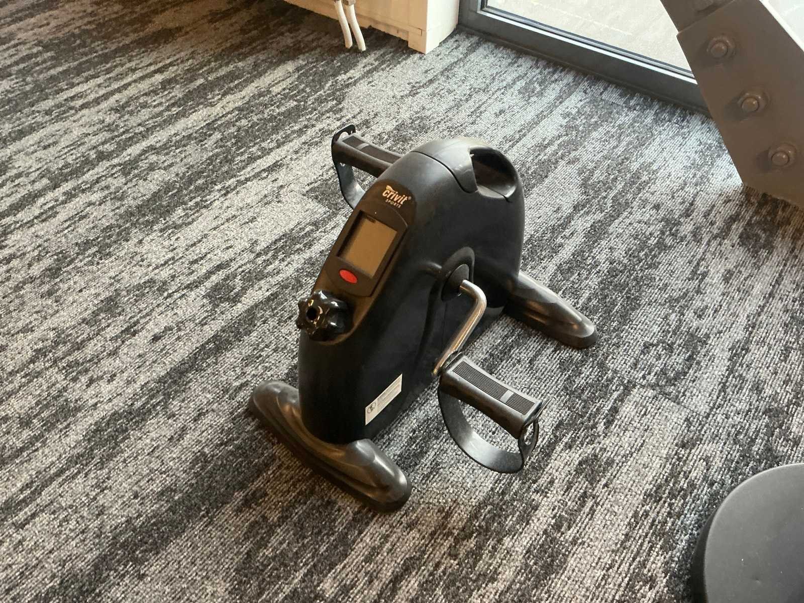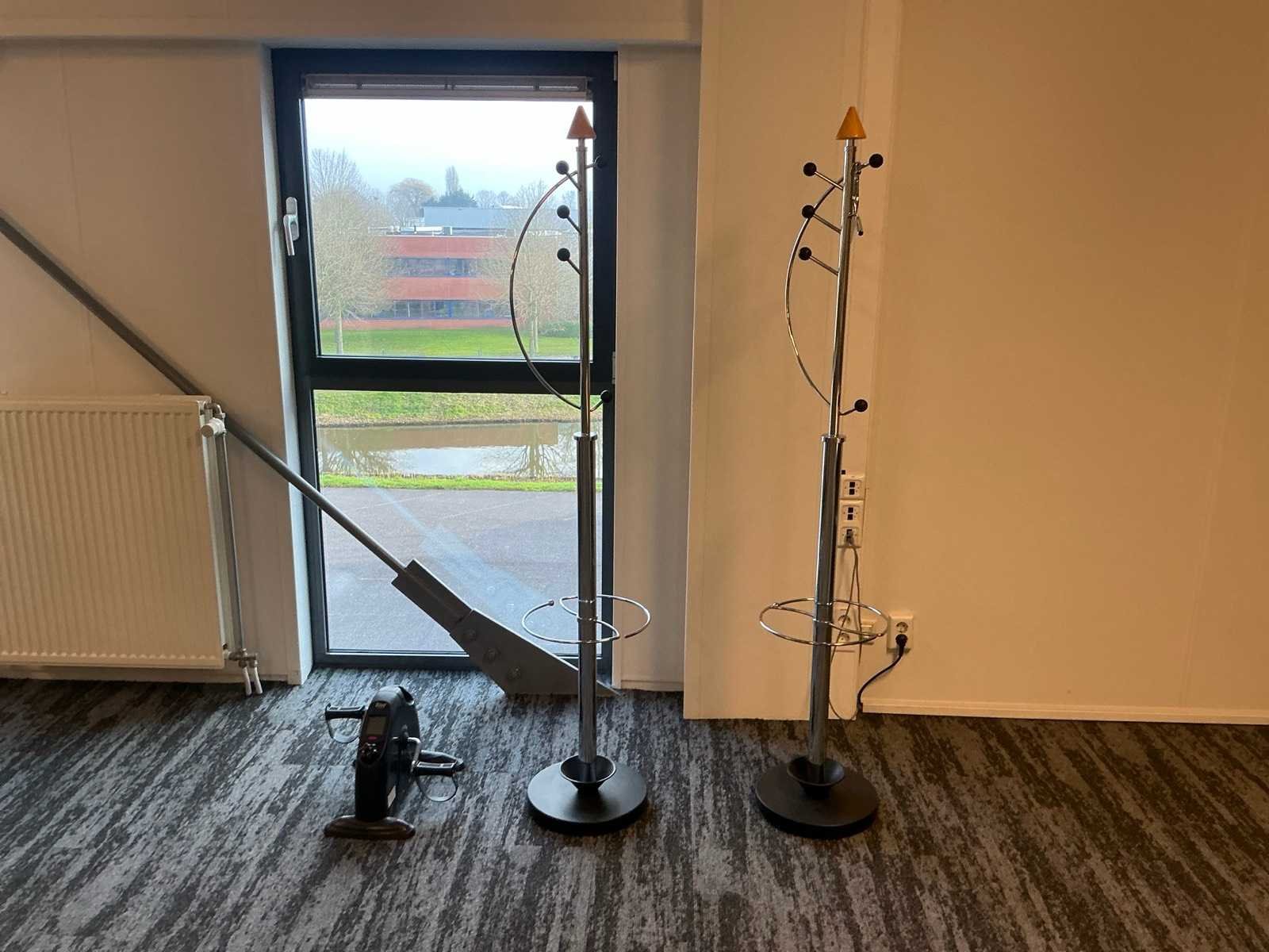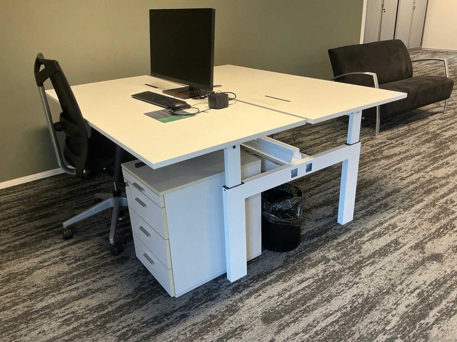 Handmatig in hoogte verstelbaar. Met 5x bureaustoel, 2x kapstok, desk bike en 5x ladekast. Monitoren, Neomounts beugel, dockingstations en toetsenborden/muizen niet inbegrepen. Lengte: 165cm Breedte: 180cm Hoogte: 115cm