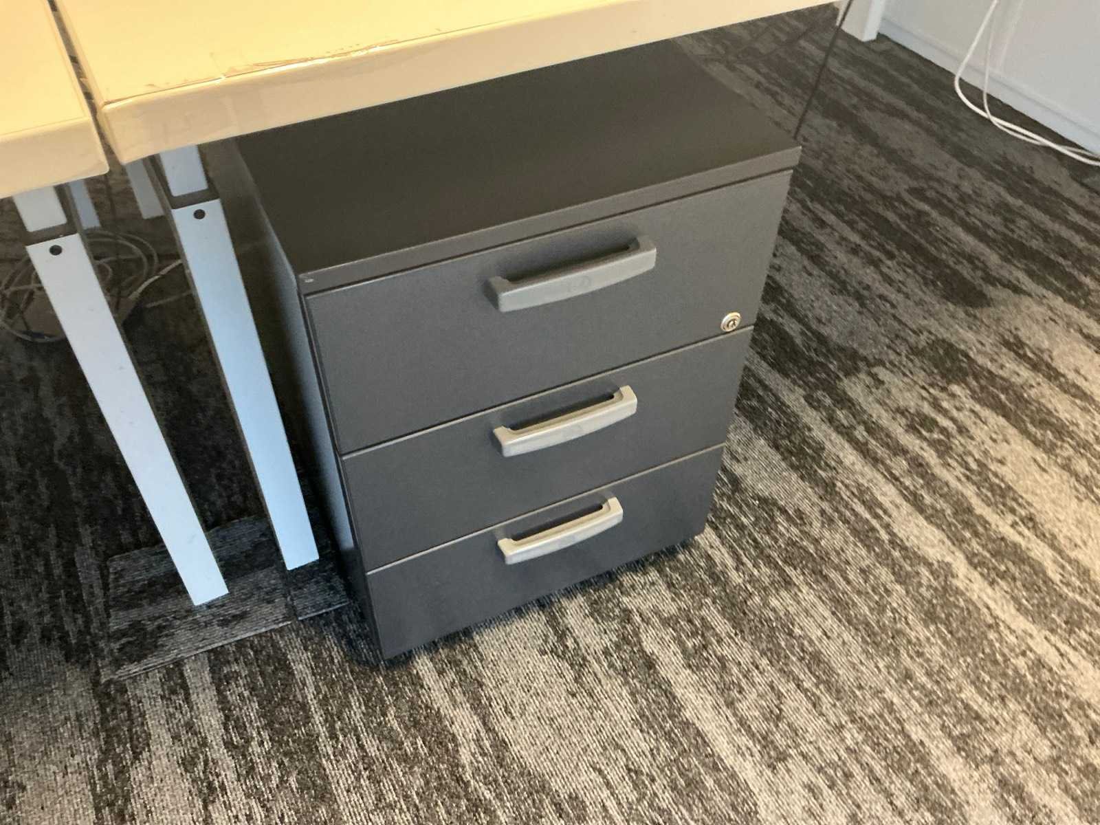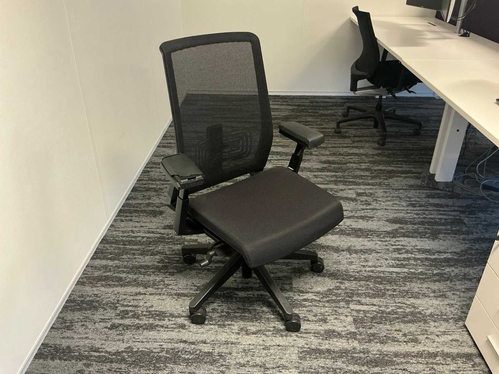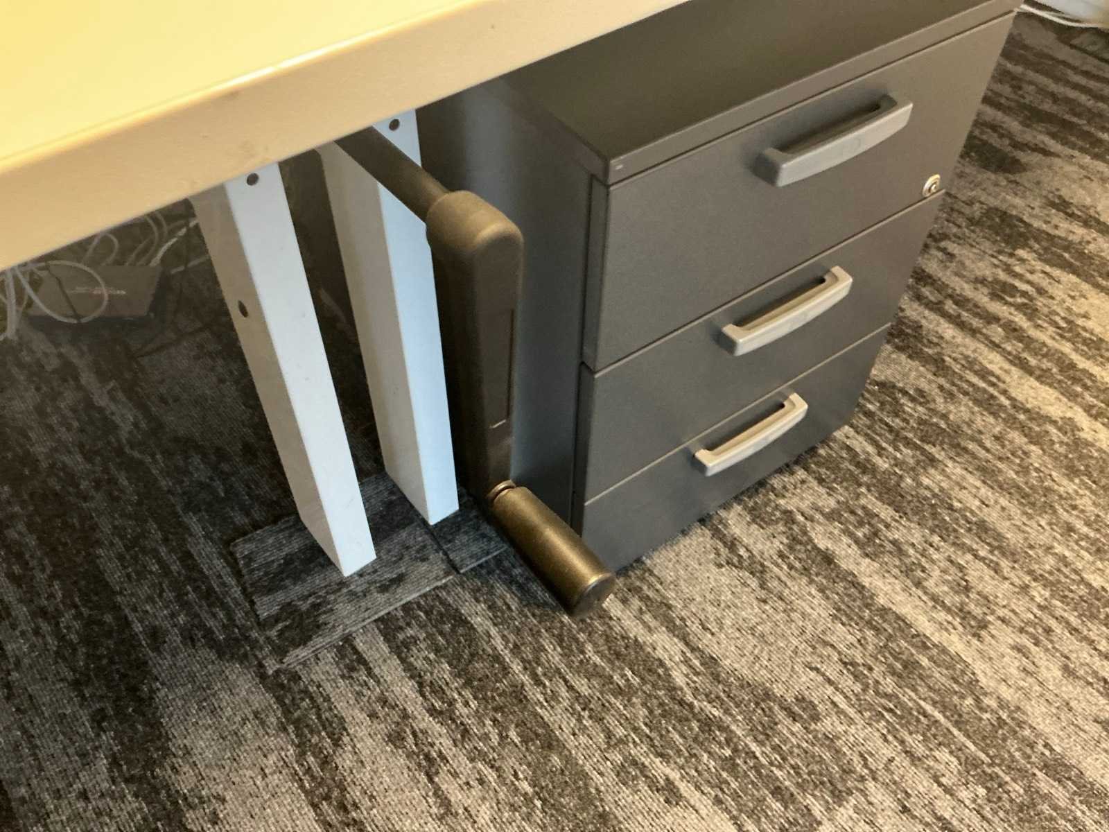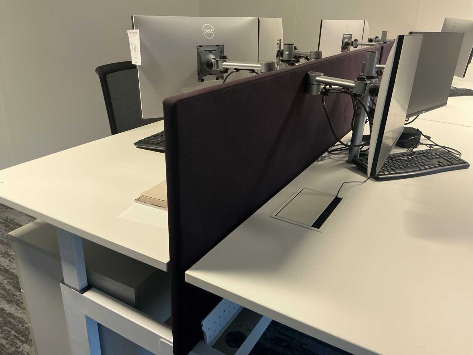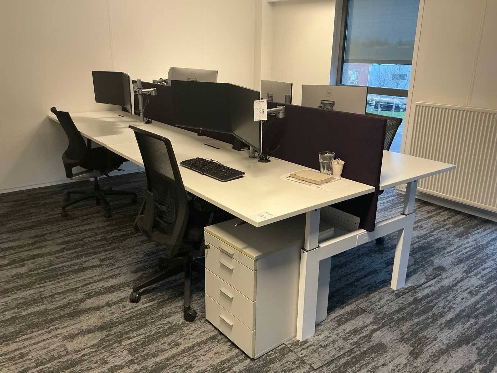 Handmatig in hoogte verstelbaar. Met 7x bureaustoel en 4 ladeblok. Monitoren, Neomounts beugel, dockingstations en toetsenborden/muizen niet inbegrepen. Lengte: 165cm Breedte: 180cm Hoogte: 115cm