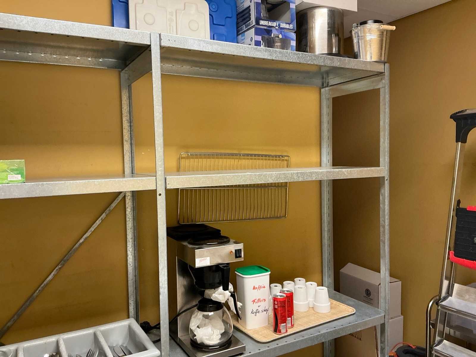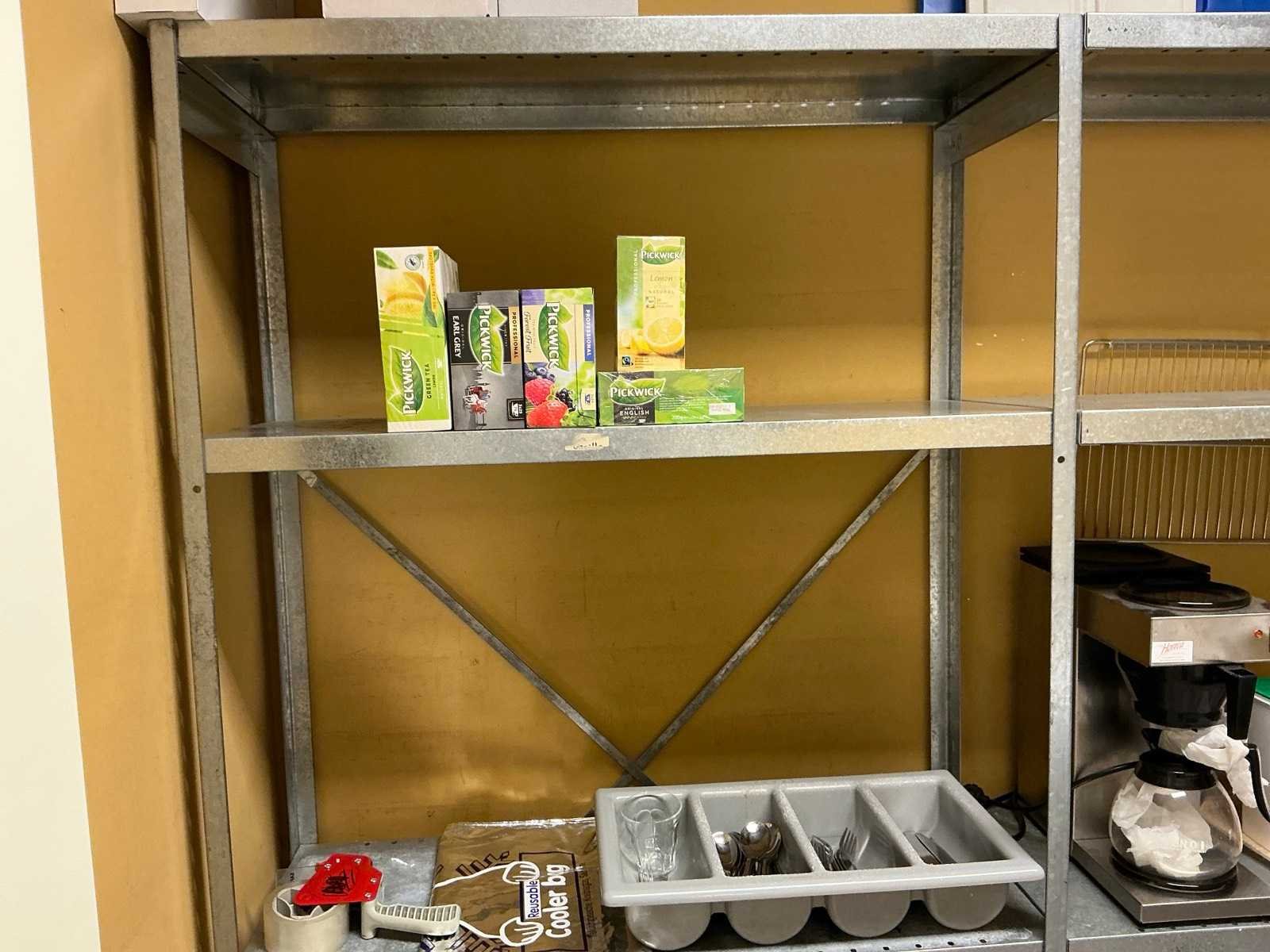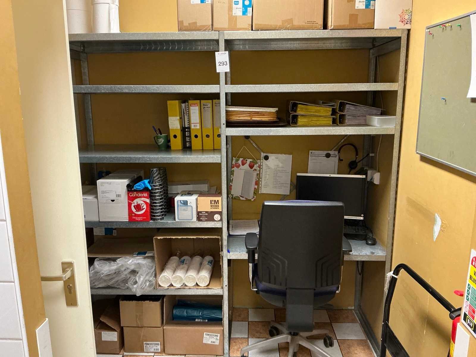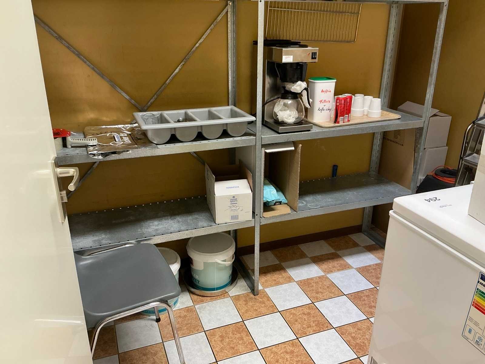 4 secties keukenstelling, demontabel, inclusief inhoud (transportkar, en bureaustoel). Desktop niet inbegrepen.