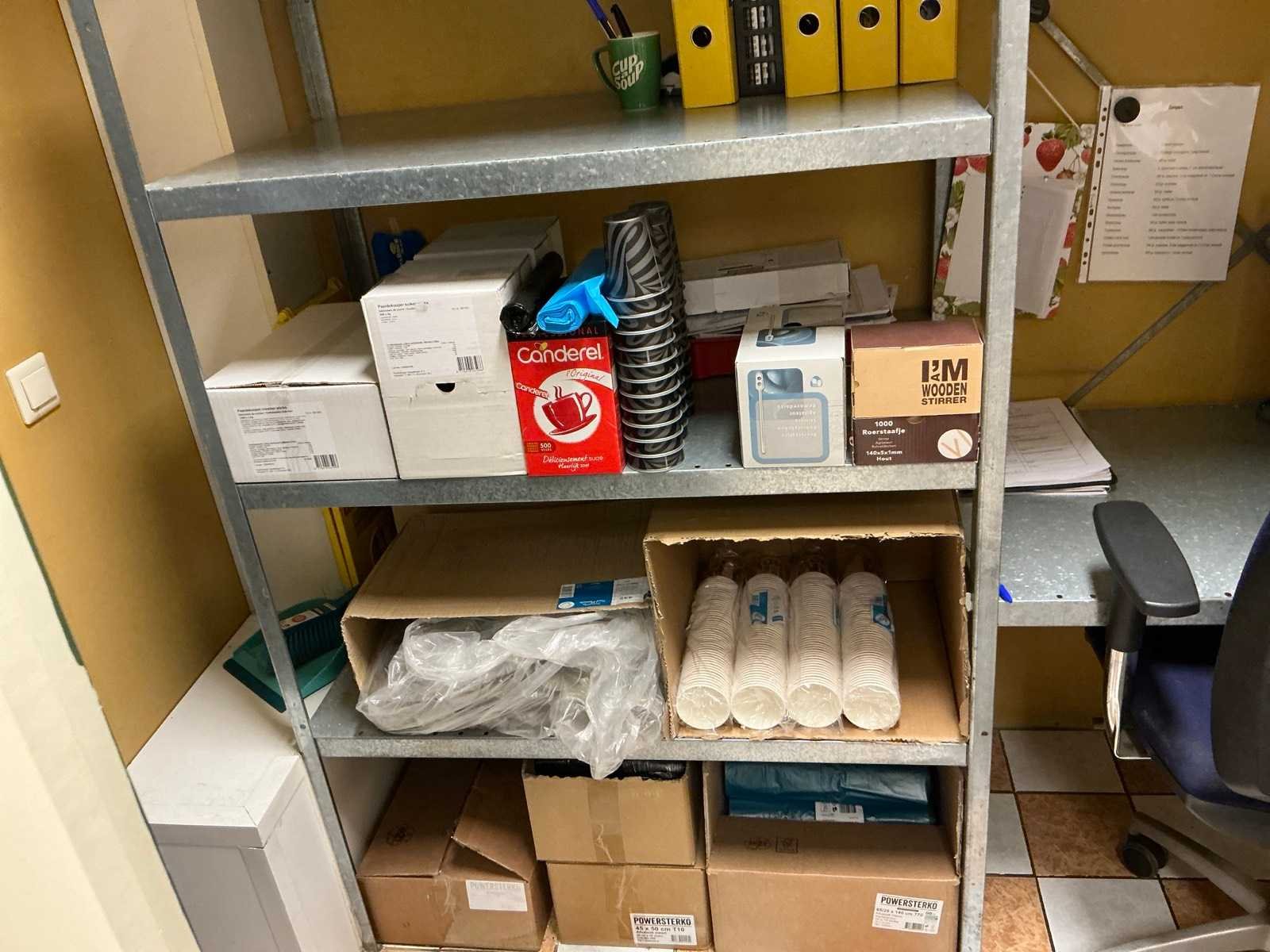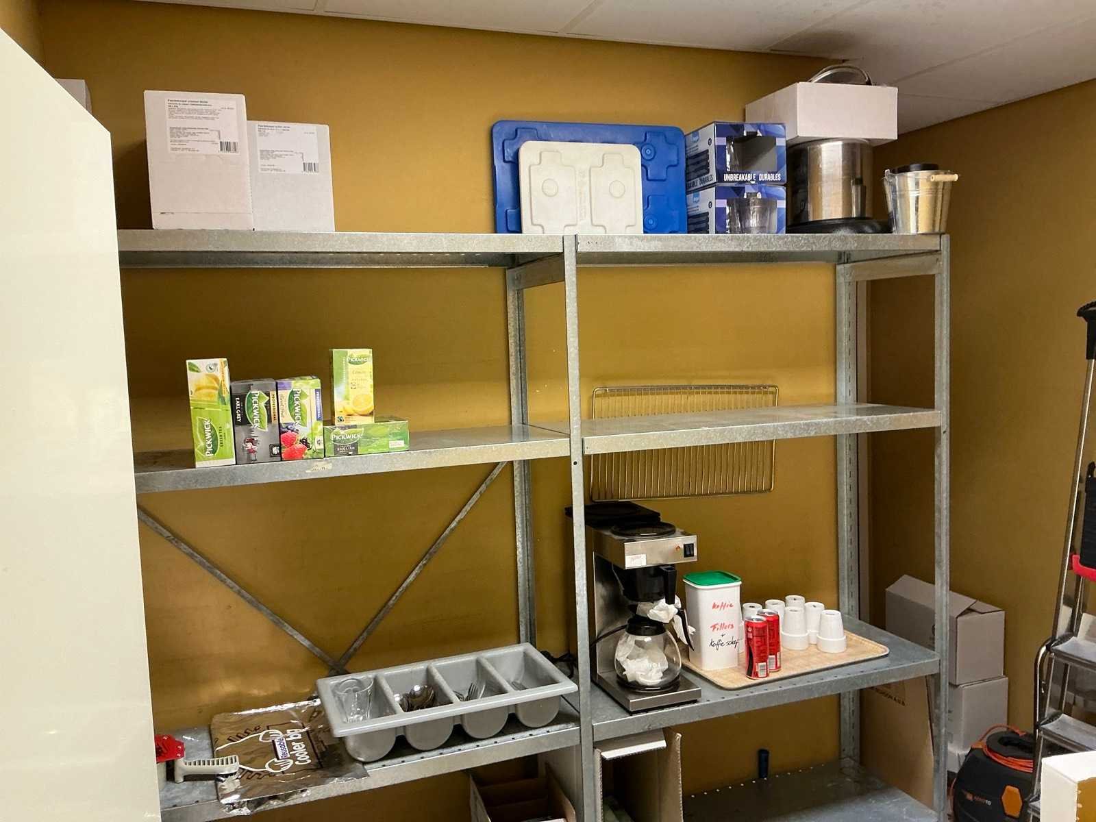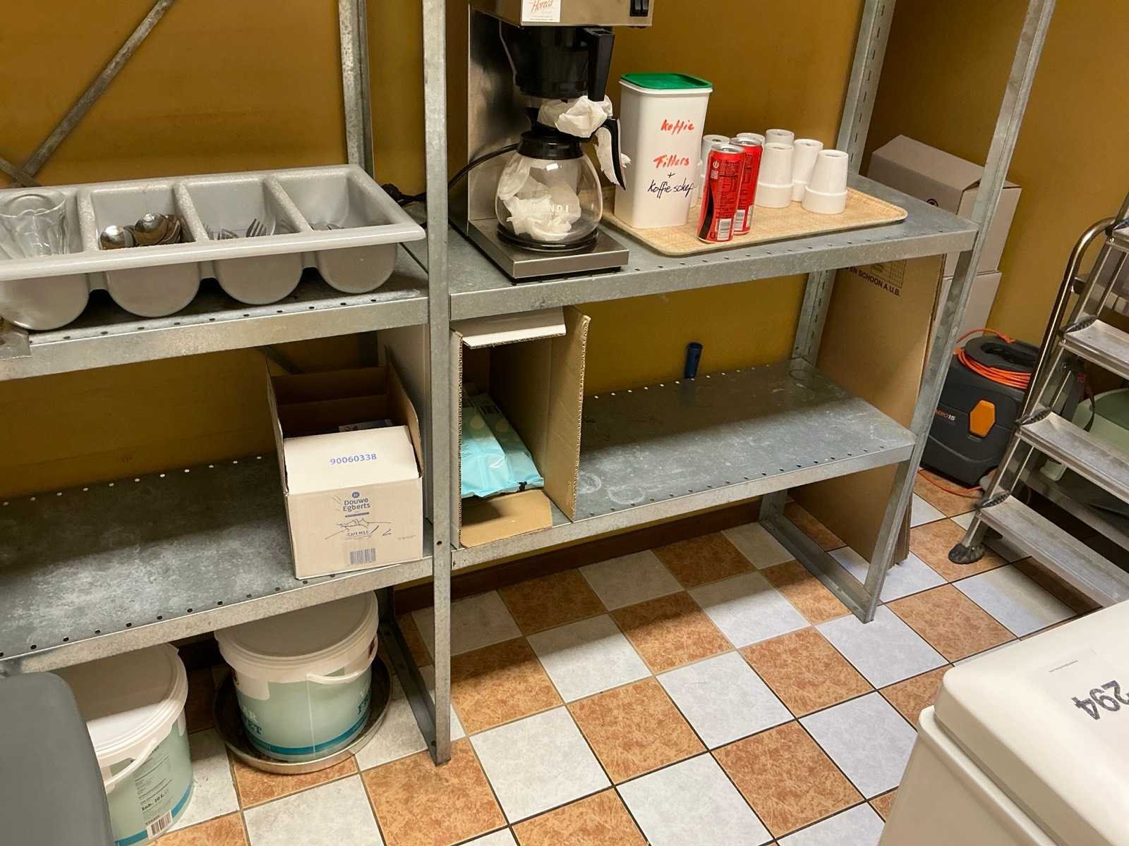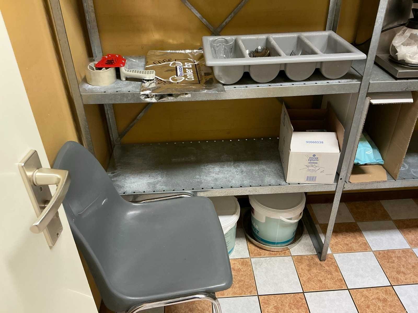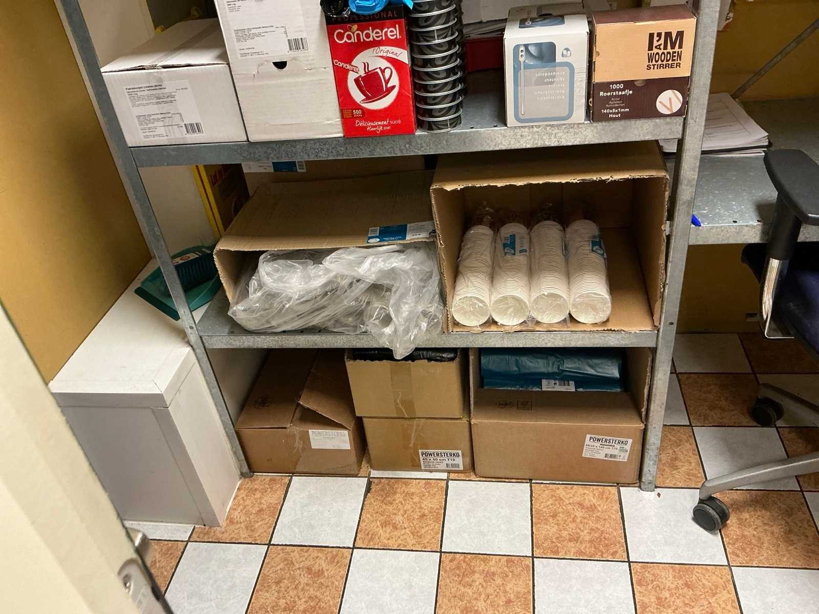 4 secties keukenstelling, demontabel, inclusief inhoud (transportkar, en bureaustoel). Desktop niet inbegrepen.