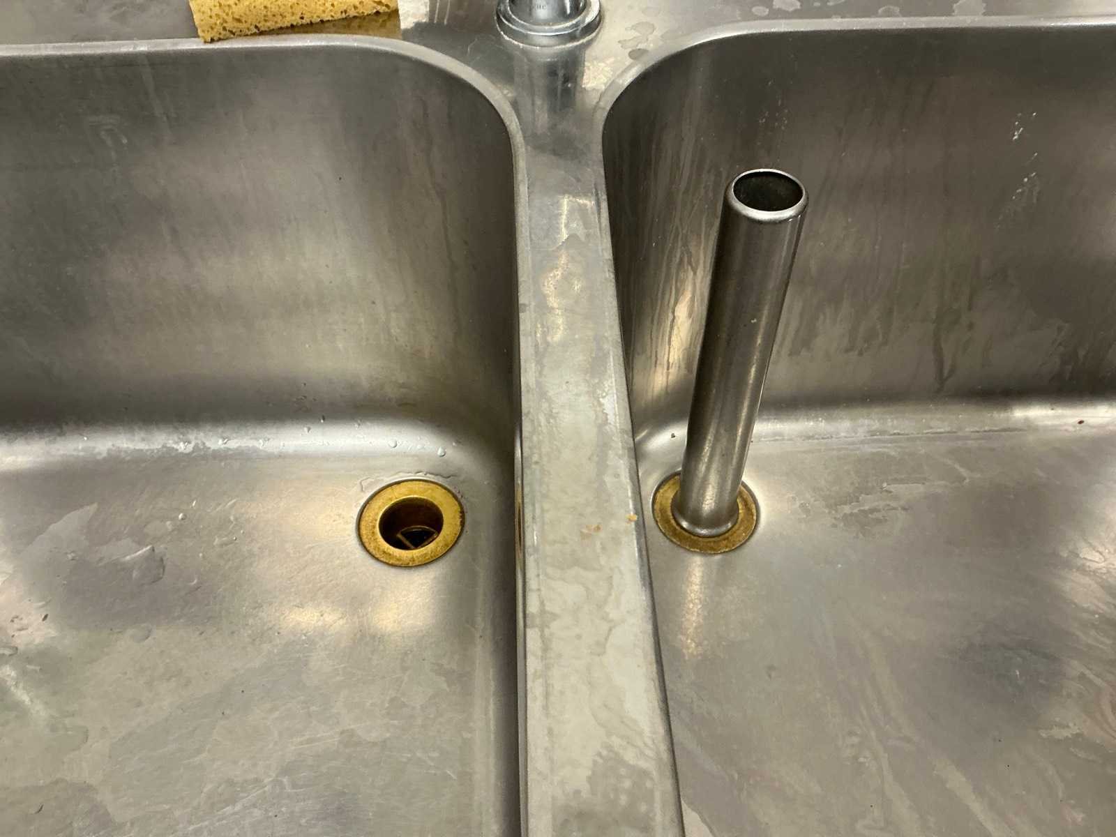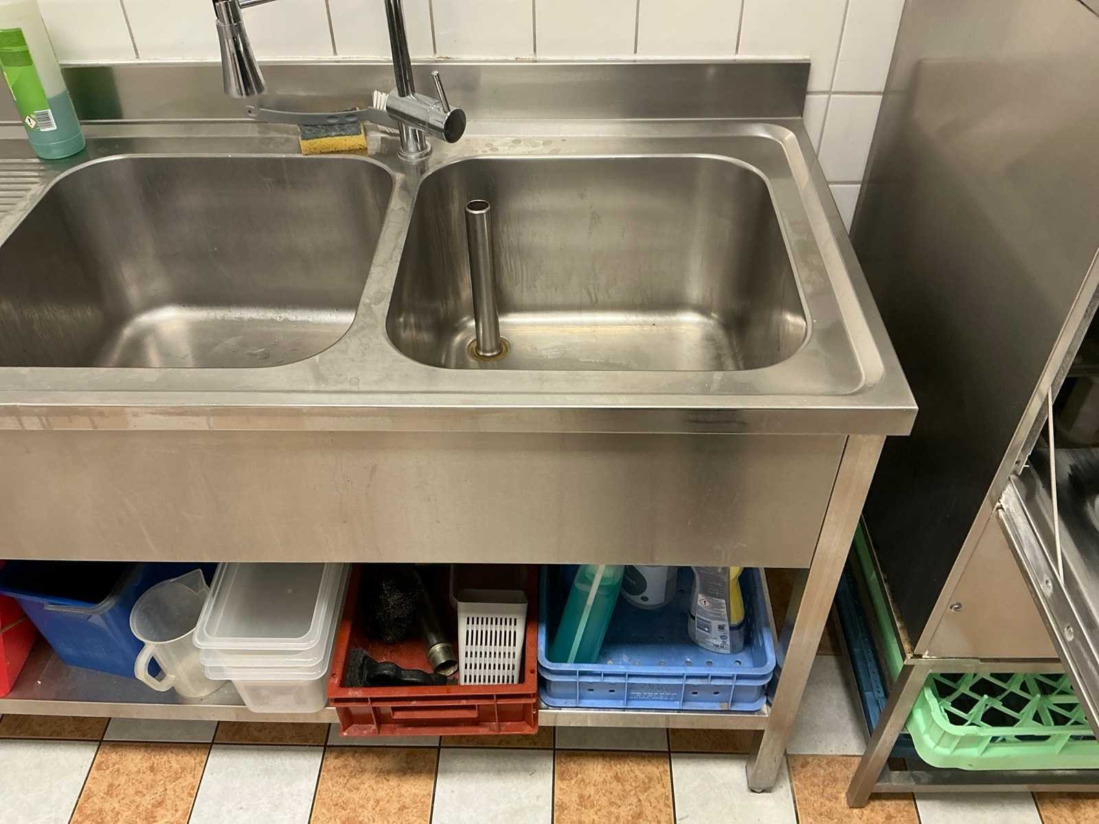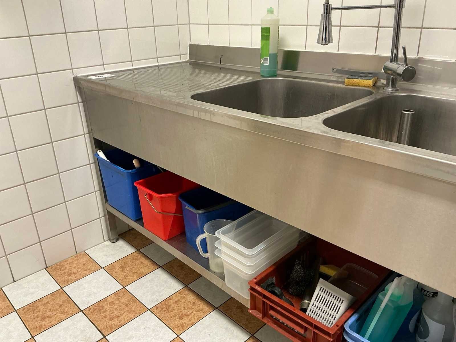 2 spoelbakken, mengkraan Lengte: 180cm Breedte: 70cm Hoogte: 93cm Materiaal: Rvs