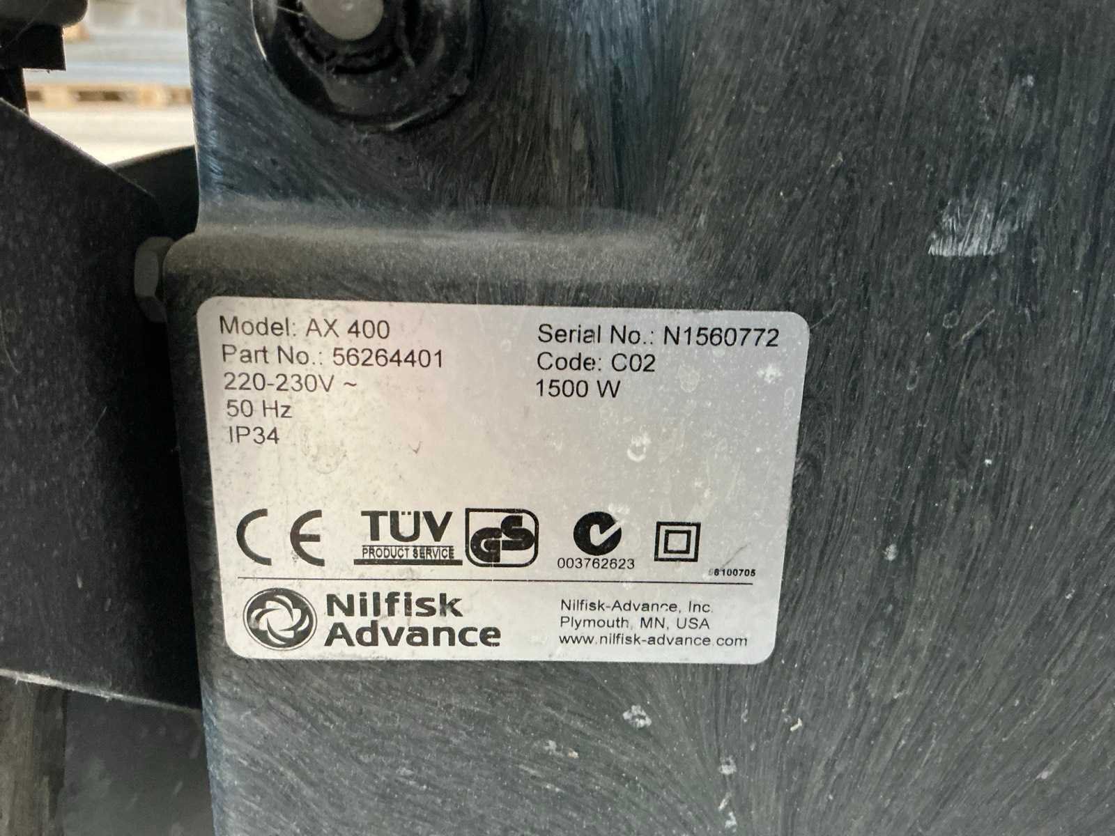 Merk: Nilfisk Type: AX400 Totale afmeting L: 900mm Totale afmeting Breedte: 450mm Totale afmeting Hoogte: 1050mm