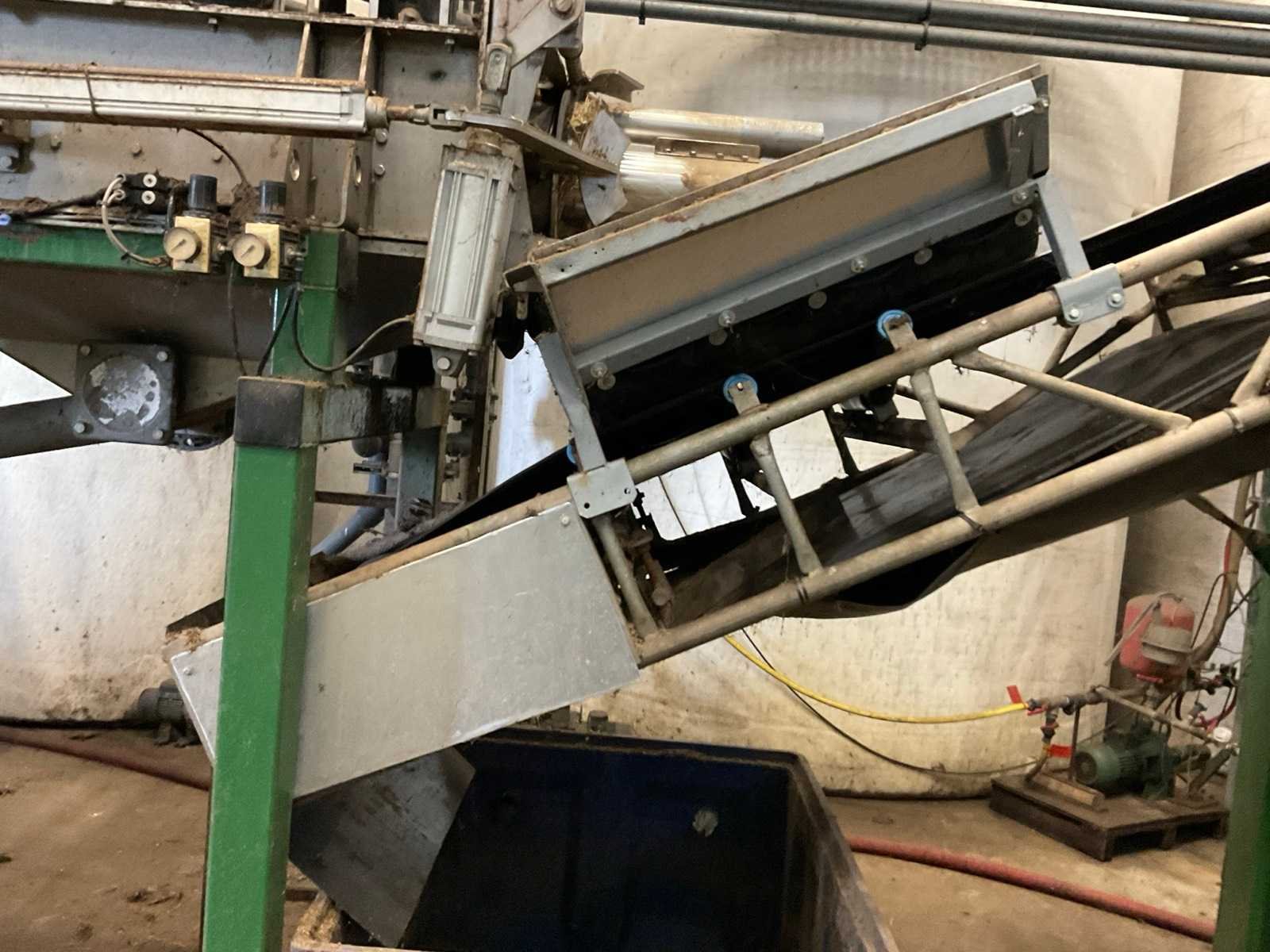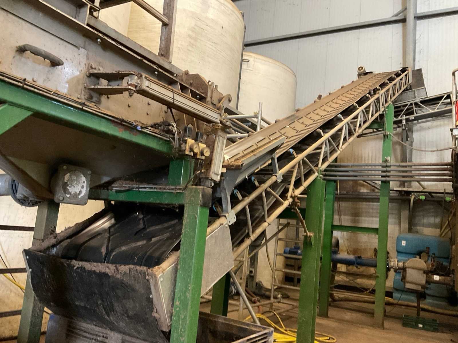 Afmeting circa: L12000 x B1100 mm. bestaande uit gegalvaniseerde opbouw elementen. inclusief 2 stalen steunen. Dit kavel maakt deel uit van de eindcombinatie 31 (1 t/m 30) Transportband afm. b: 800mm Aansluiting: 400V