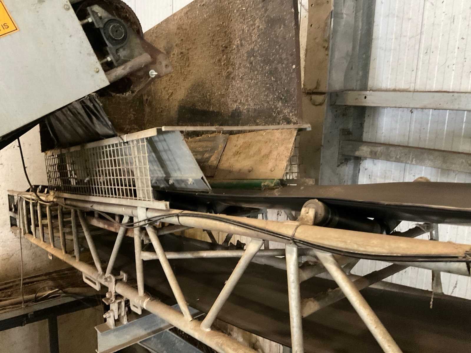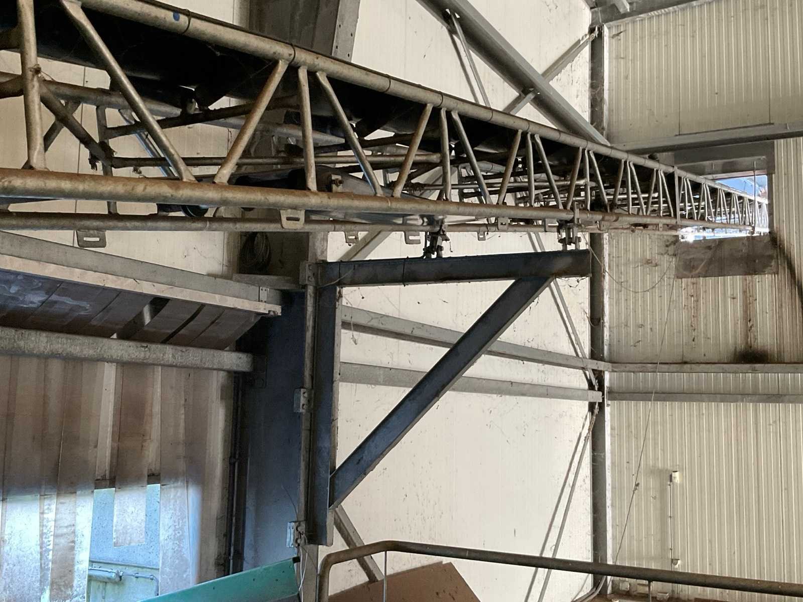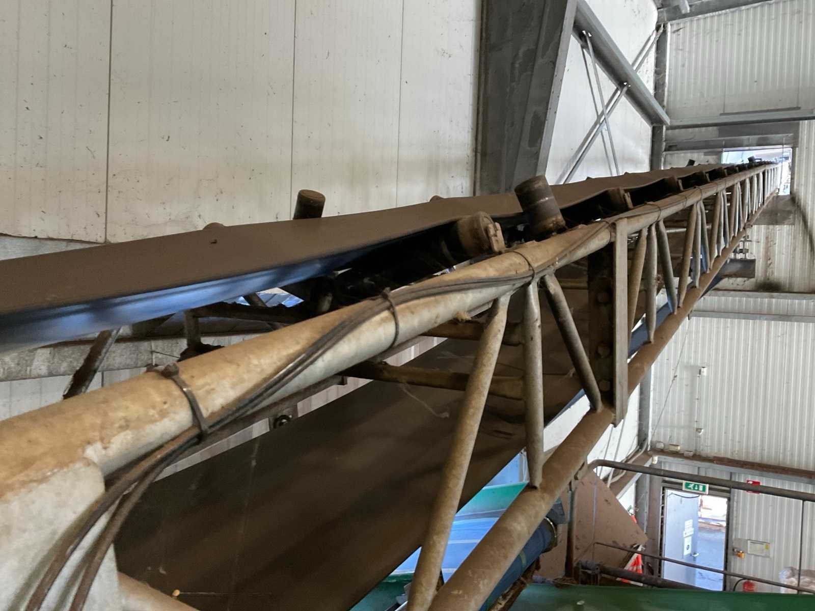 Afmeting circa: L25000 x B760 mm. bestaande uit gegalvaniseerde opbouw elementen. inclusief 2 stalen steunen en stortkokers. Dit kavel maakt deel uit van de eindcombinatie 31 (1 t/m 30) Transportband afm. b: 490mm Aansluiting: 400V