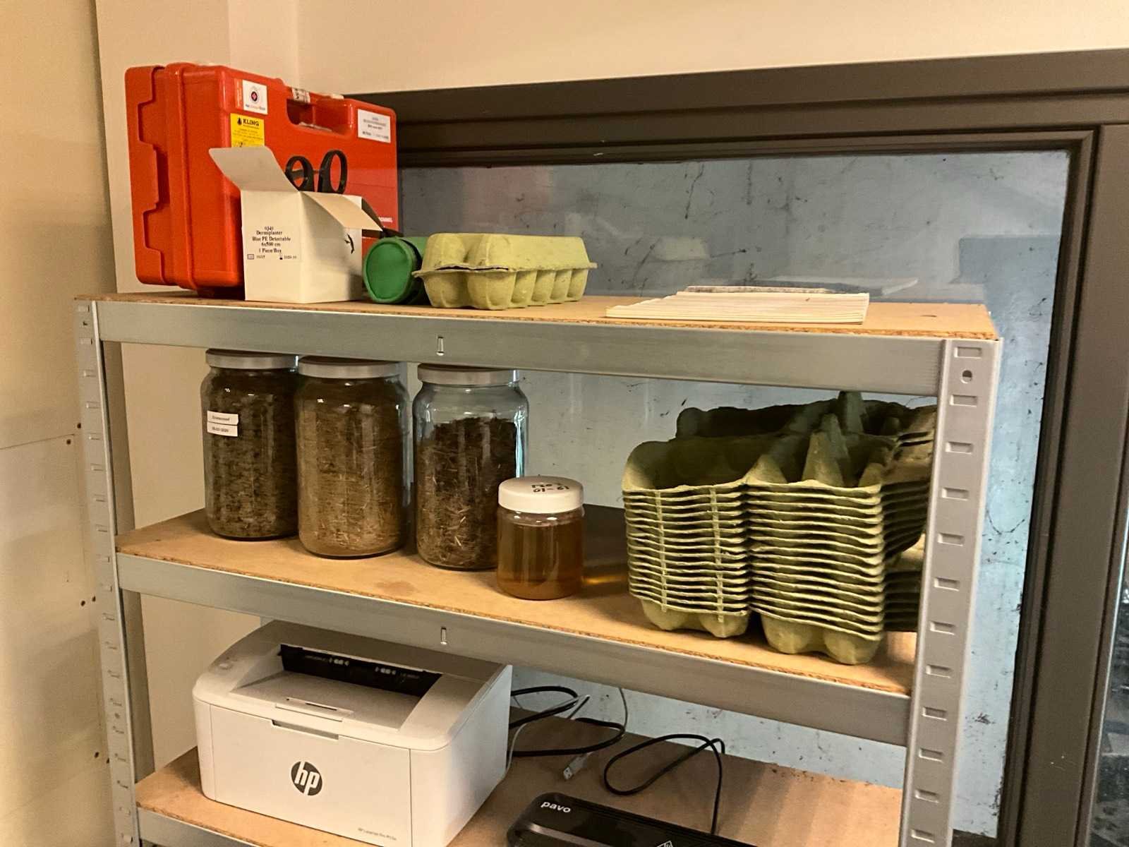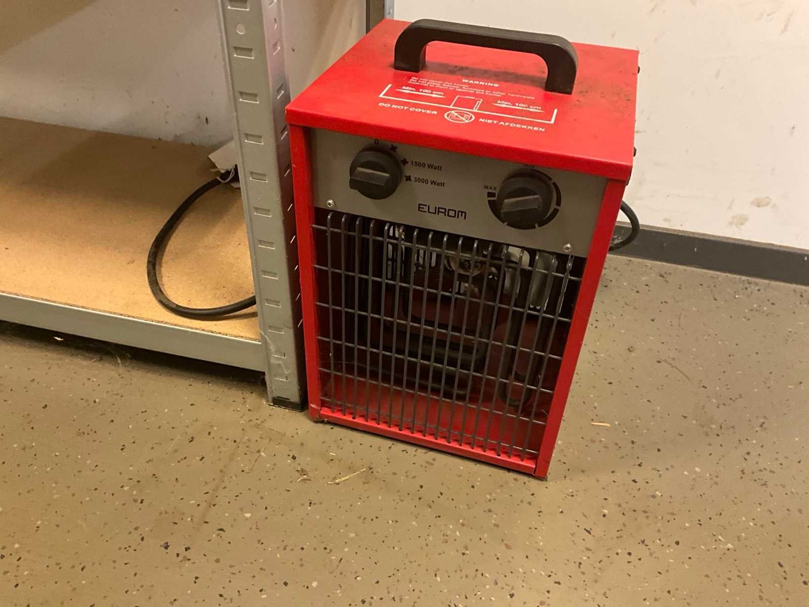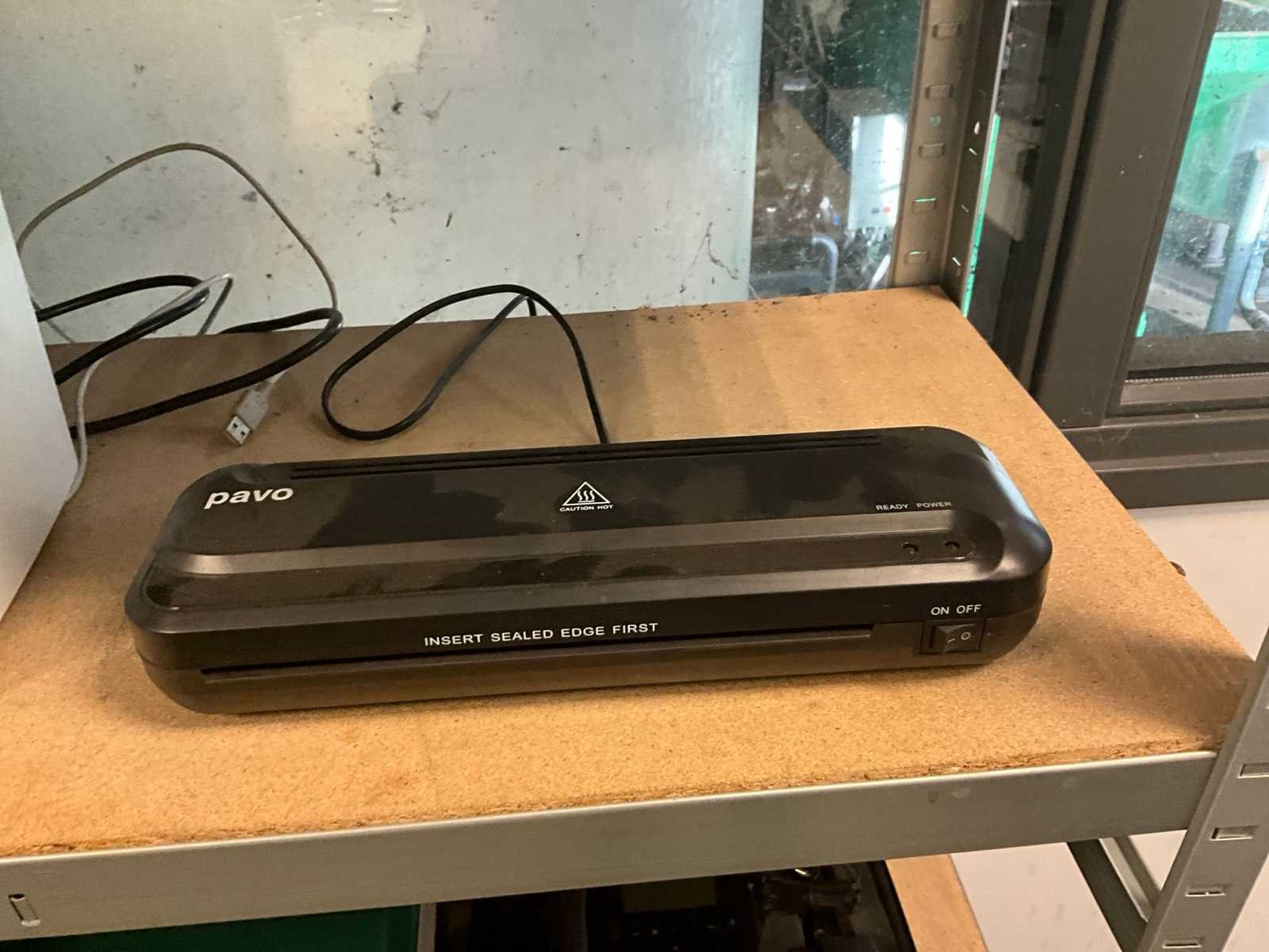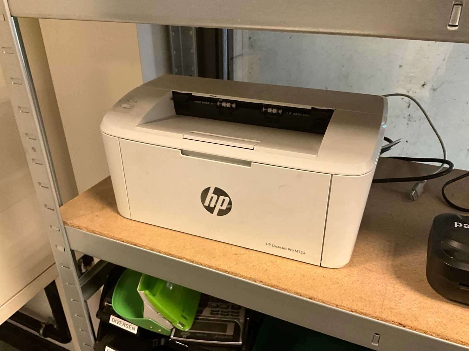 Waaronder, printer, labelprinter, kachel, plastificeer machine en diverse, legbordstelling inbegrepen
