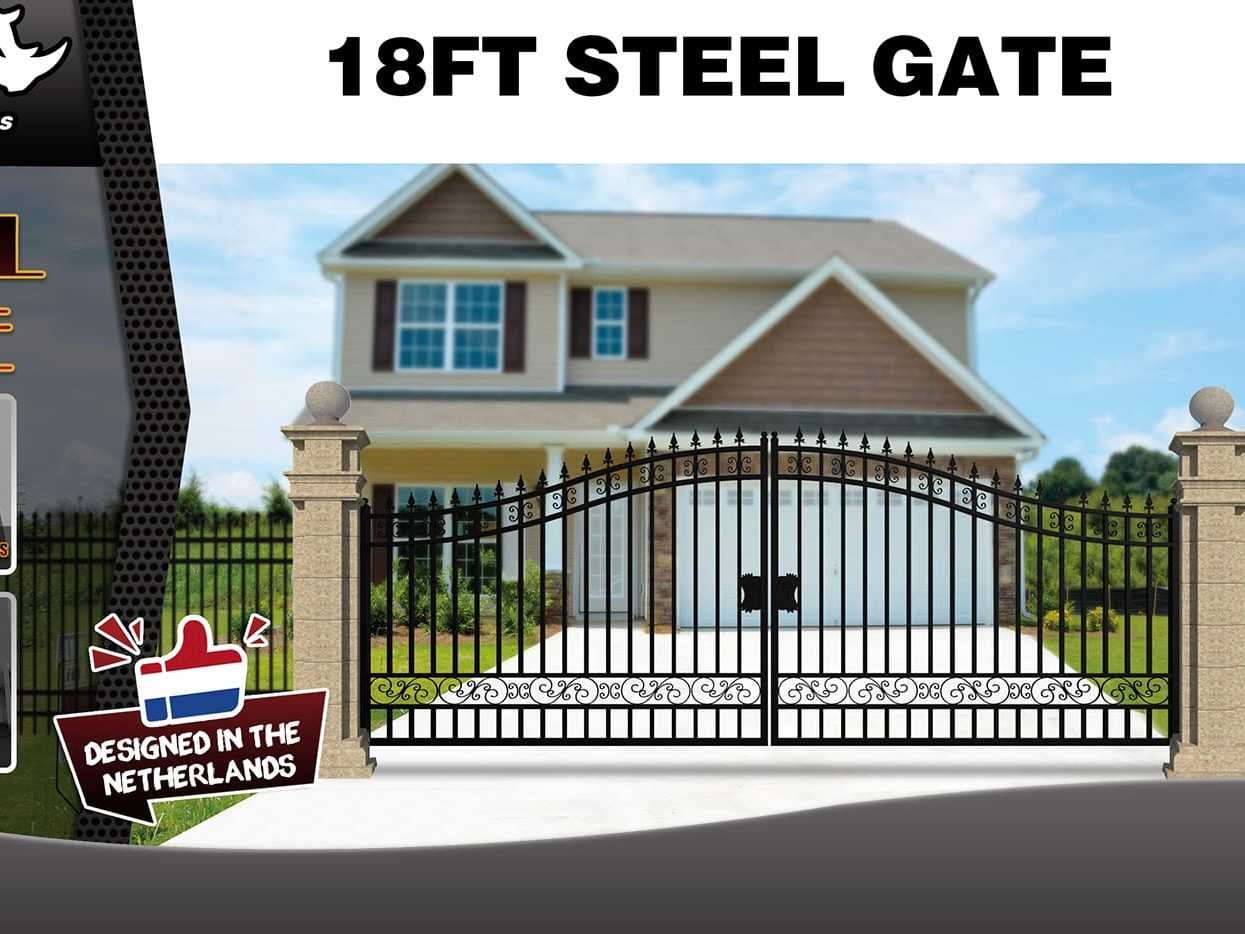 Voorzien van zwarte poedercoating / lakafwerking; 230 cm hoog in het midden; 180 cm hoog aan de zijkanten; buiten frame 50x50x2 mm; binnen frame 25x25x1,2 mm; ongebruikt Merk: Rhino-Cross-Gates Product type: 547 cm plain stijl Kleur: Zwart Breedte: 547cm Hoogte: 230cm