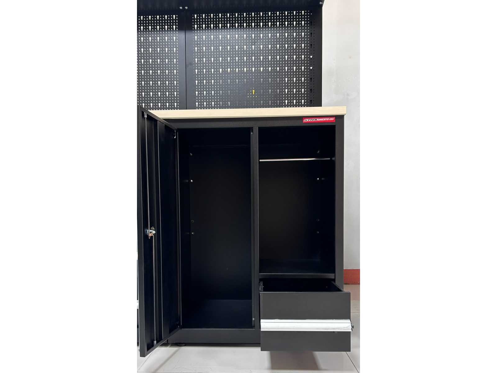 Voorzien van poeder coating; 30 mm houten werkblad; kleur zwart; ongebruikt in dozen (transport afmeting 1,55 m3) Merk: Stahlworks Model: OS-18 Product type: 225x55x203 cm Materiaal: SPCC steel