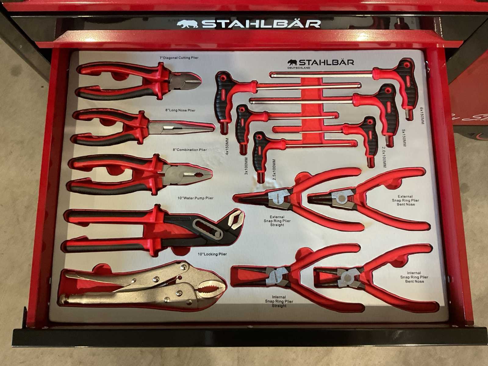 Voorzien van 7 lades waarvan 7 gevuld met gereedschap; zijdeur; professioneel chroom-vanadium gereedschap; heavy duty gereedschapswagen; 4 wielen; stevig handvat; ongebruikt in doos (transport afmetingen 110x50x80 cm) Merk: Stahlbär Type: Deutschland jumbo Bouwjaar: 2025 Aantal laden: 7 Met inhoud: true Eigen gewicht: 75kg Totale afmeting L: 1100mm Totale afmeting Breedte: 500mm Totale afmeting Hoogte: 800mm