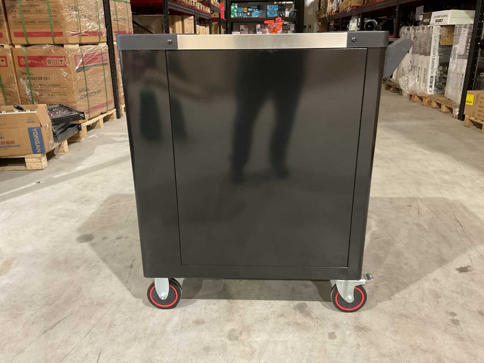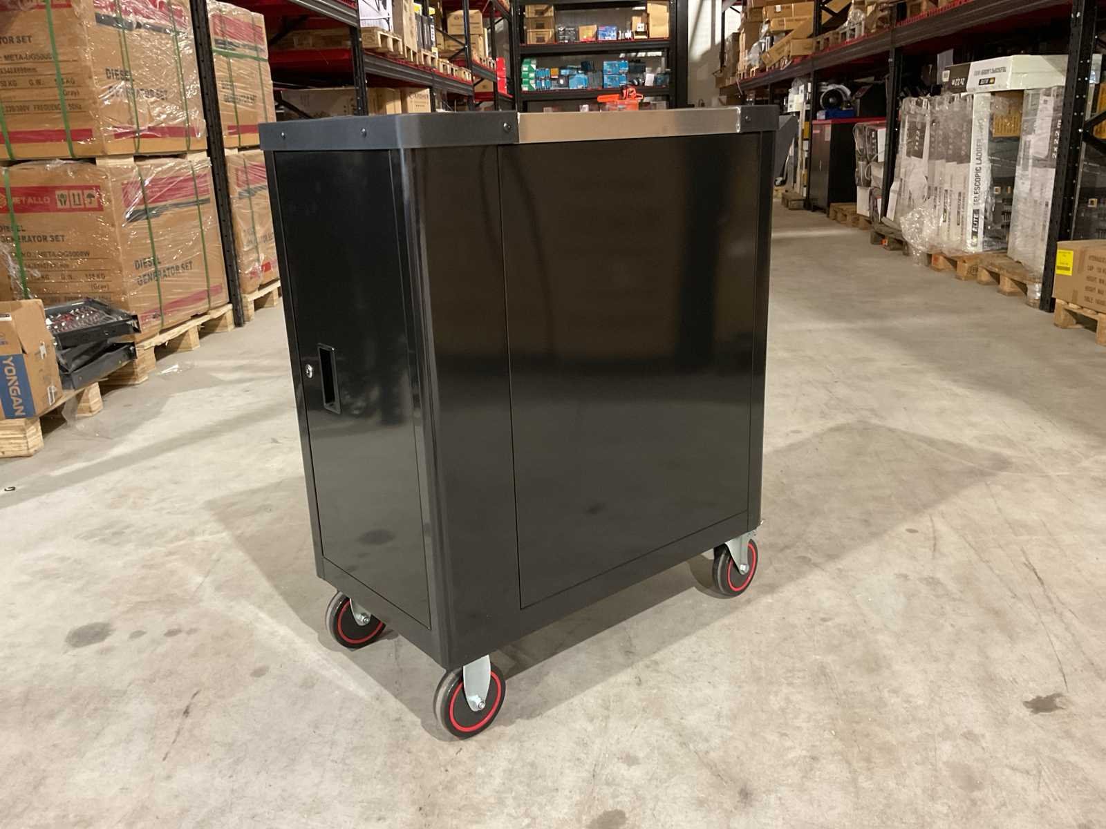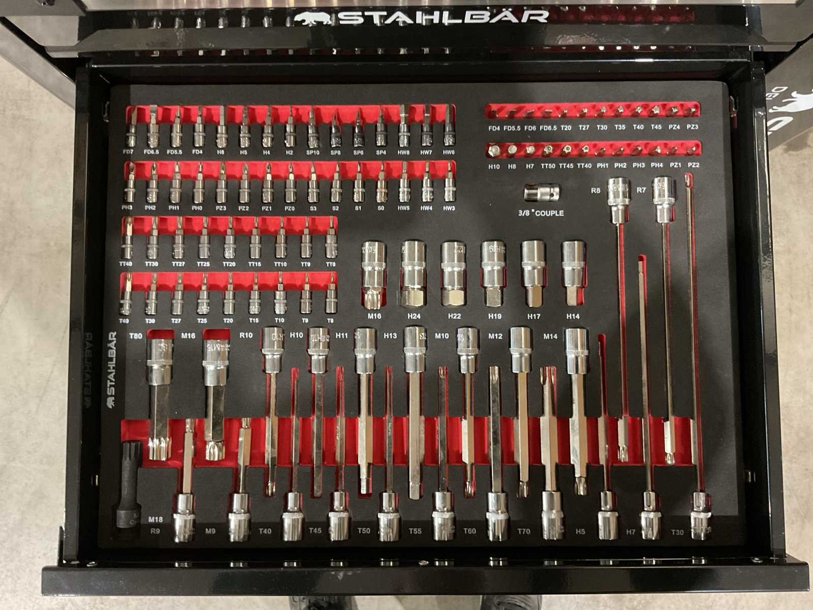 Voorzien van 7 lades waarvan 7 gevuld met gereedschap; professioneel chroom-vanadium gereedschap; heavy duty gereedschapswagen; stevig werkblad; 4 wielen; stevig handvat; ongebruikt in doos (transport afmetingen 80x50x85 cm) Merk: Stahlbär Type: Deutschland 7/7 Bouwjaar: 2025 Aantal laden: 7 Met inhoud: true Eigen gewicht: 78kg Totale afmeting L: 800mm Totale afmeting Breedte: 500mm Totale afmeting Hoogte: 850mm