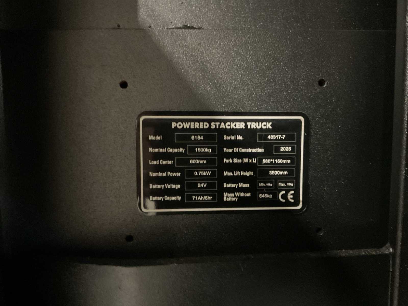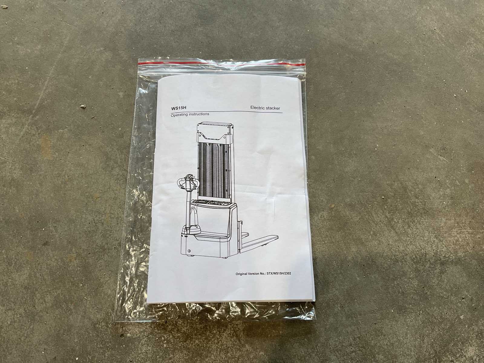 Voorzien van led indicator voor accu; inclusief handboek; makkelijk bedienbaar; ingebouwde lader; ongebruikt Type: WS15H-3500 Bouwjaar: 2025 Hefvermogen: 1500kg Hefhoogte: 3500mm Lepellengte: 1150mm Eigen gewicht: 597kg Minimale doorrijhoogte: 2300mm Totale afmeting L: 1700mm Totale afmeting Breedte: 800mm Totale afmeting Hoogte: 2300mm