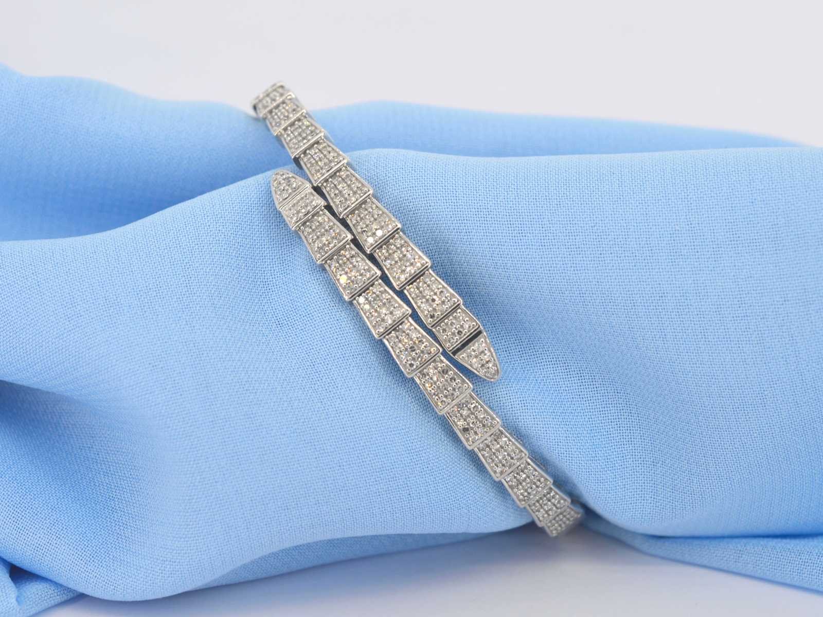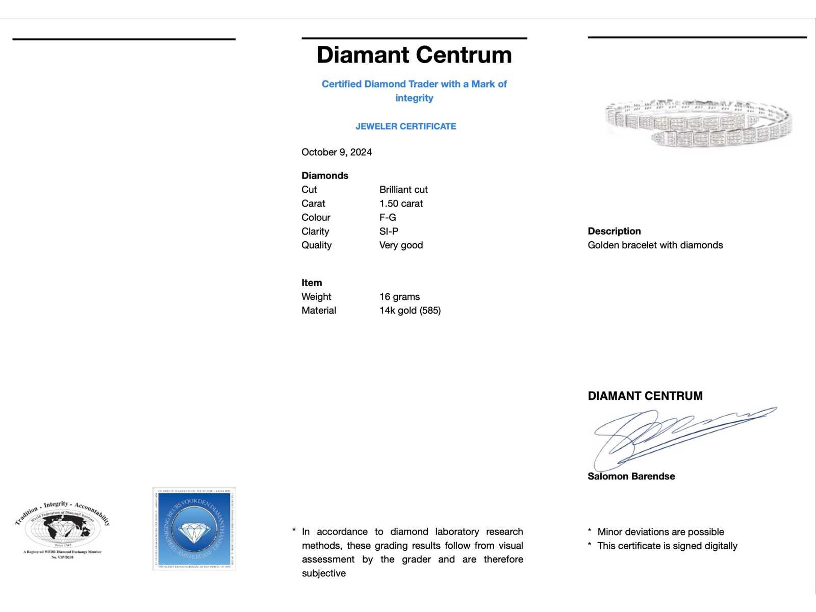 Samenvatting van gegevens Witgouden armband van serpent model met natuurlijke diamanten Diamant: Natuurlijk; Aantal: 266 stuks; Slijpvorm: Rond geslepen; Gewicht (carat): 1.50 carat; Kleur: F-G; Zuiverheid: SI-P; Slijpkwaliteit: Zeer mooi; Juweel: Armband; Gewicht: 17 gram; Afmetingen/lengte: Verstelbaar; Materiaal: 14k goud (585); Conditie: Nieuw; Verpakking: Luxe sieradendoos; Toelichting: De kwaliteit is overgenomen van het rapport behorend bij item. De waardebepaling is een beoordeling van een gecertificeerde diamantair, gebaseerd op consumentenprijzen.; Consumentenprijs: € 9.450,- Within 14 days Materiaal: Goud Voornaamste diamant: Natuurlijk Kleur diamant: F-G Gewicht diamant: 1.50ct Slijpvorm diamant: Rond geslepen Slijpkwaliteit diamant: Zeer mooi Zuiverheidsgraad diamant: SI-P Totaal gewicht: 17g Keurmerk: 585