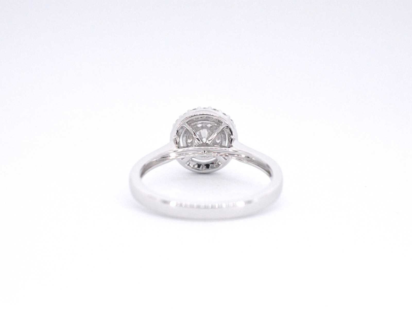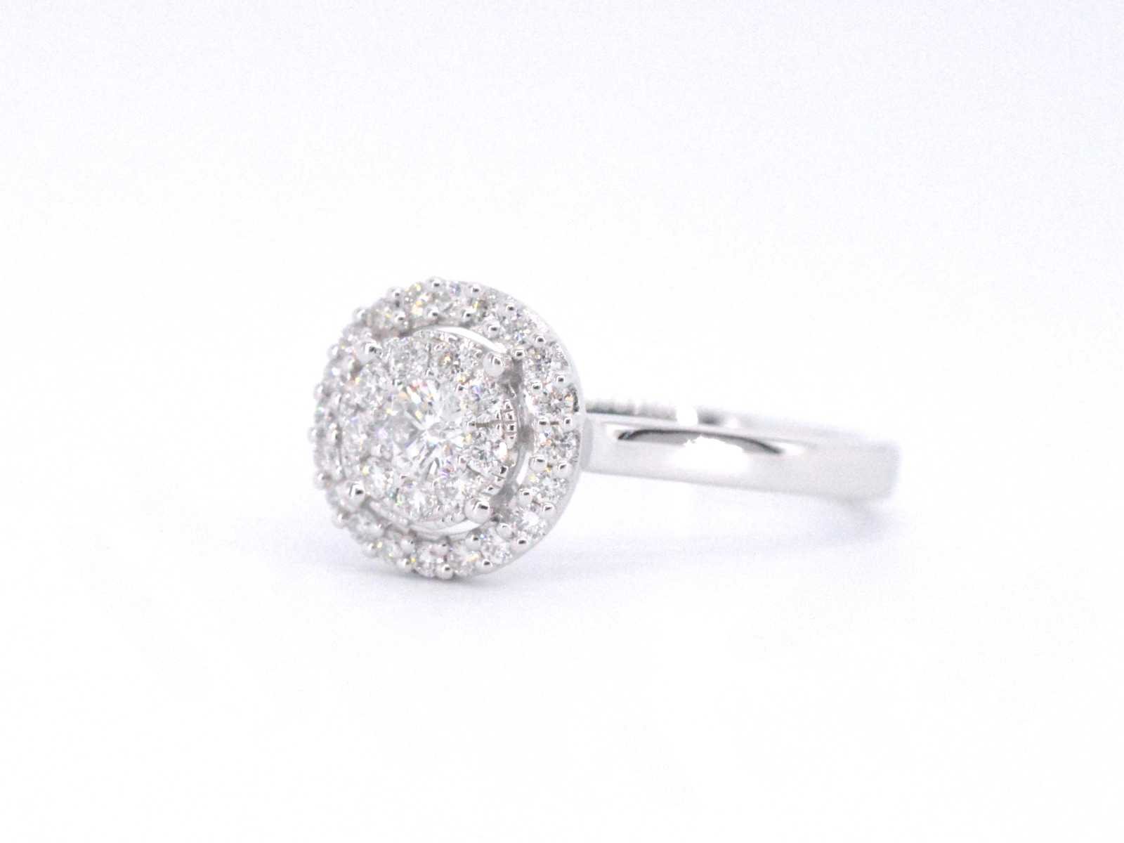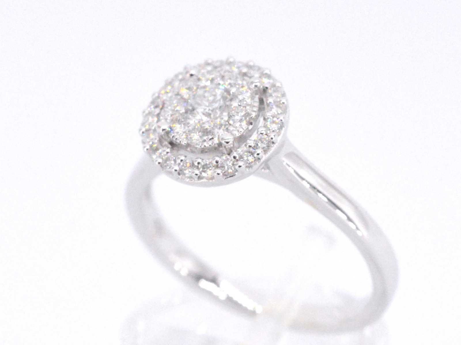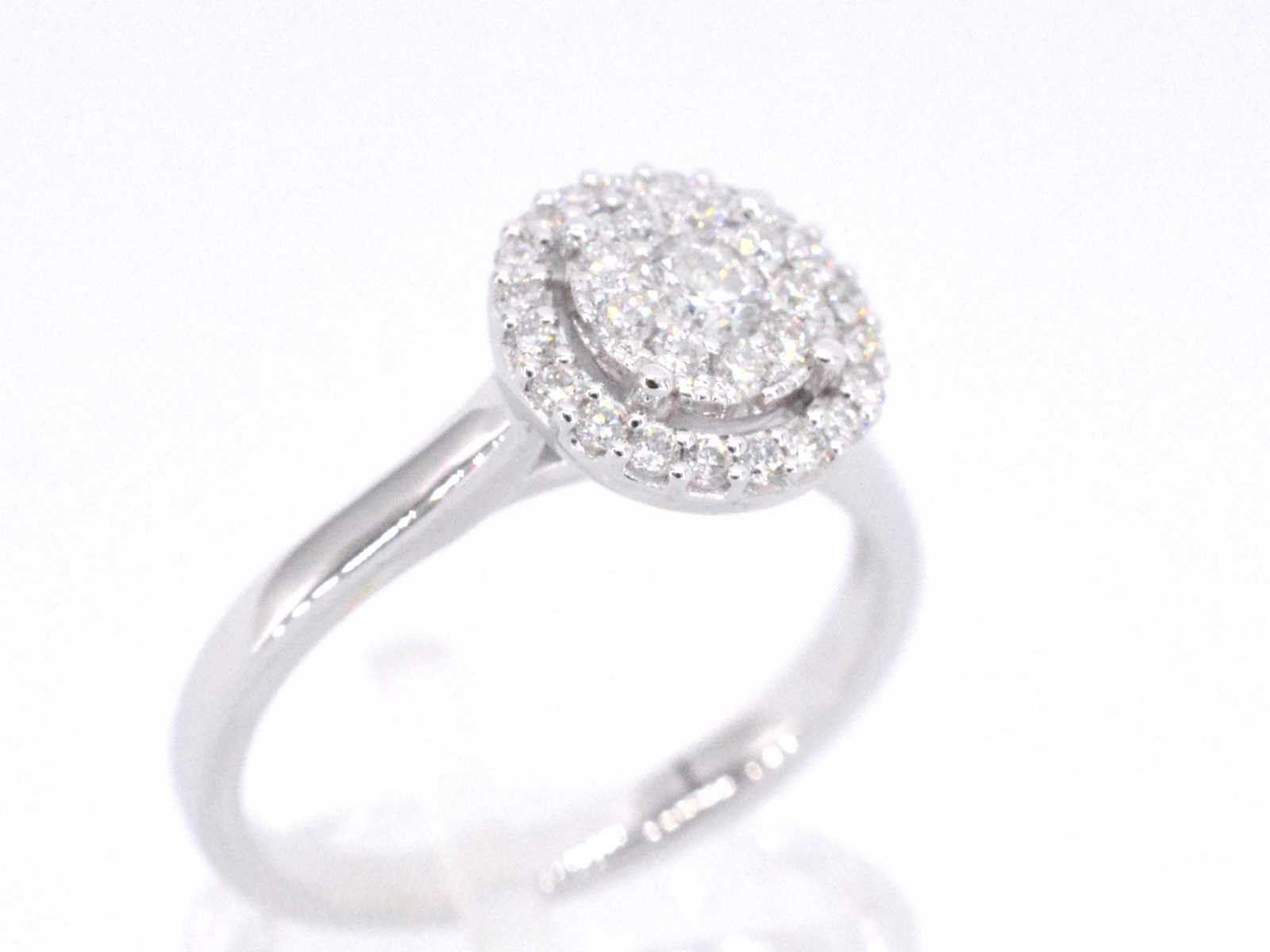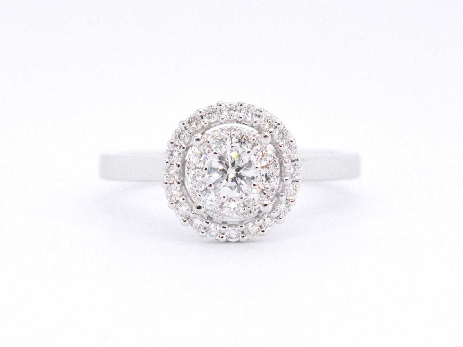 Samenvatting van gegevens Witgouden entourage ring vol gezet met diamanten Aantal: 30 stuks; Slijpvorm: Briljant geslepen; Gewicht (carat): 0.50 carat; Kleur: F-G; Zuiverheid: VS; Slijpkwaliteit: Zeer mooi; Juweel: Ring; Gewicht: 3.2 gram; Ringmaat (op maat gemaakt*): 53 (17 mm); Materiaal: 18K goud (750); Conditie: Nieuw; Verpakking: Luxe sieradendoos; Toelichting: De kwaliteit is overgenomen van het rapport behorend bij item. De waardebepaling is een beoordeling van een gecertificeerde diamantair, gebaseerd op consumentenprijzen.; Consumentenprijs: € 4.760,- Within 14 days Materiaal: Goud Gewicht diamant: 0.50ct Totaal gewicht: 3.2g Keurmerk: 750 Kleur diamant: F-G Slijpvorm diamant: Briljant geslepen Slijpkwaliteit diamant: Zeer mooi Zuiverheidsgraad diamant: VS