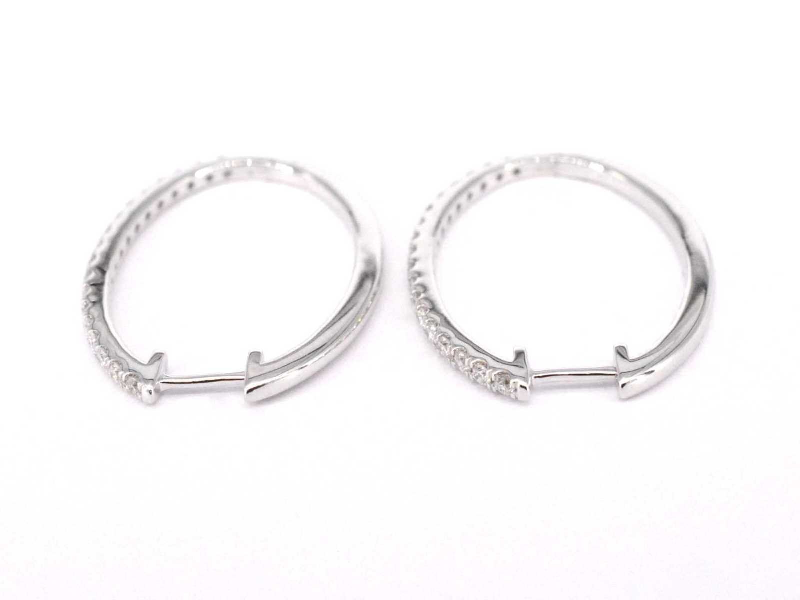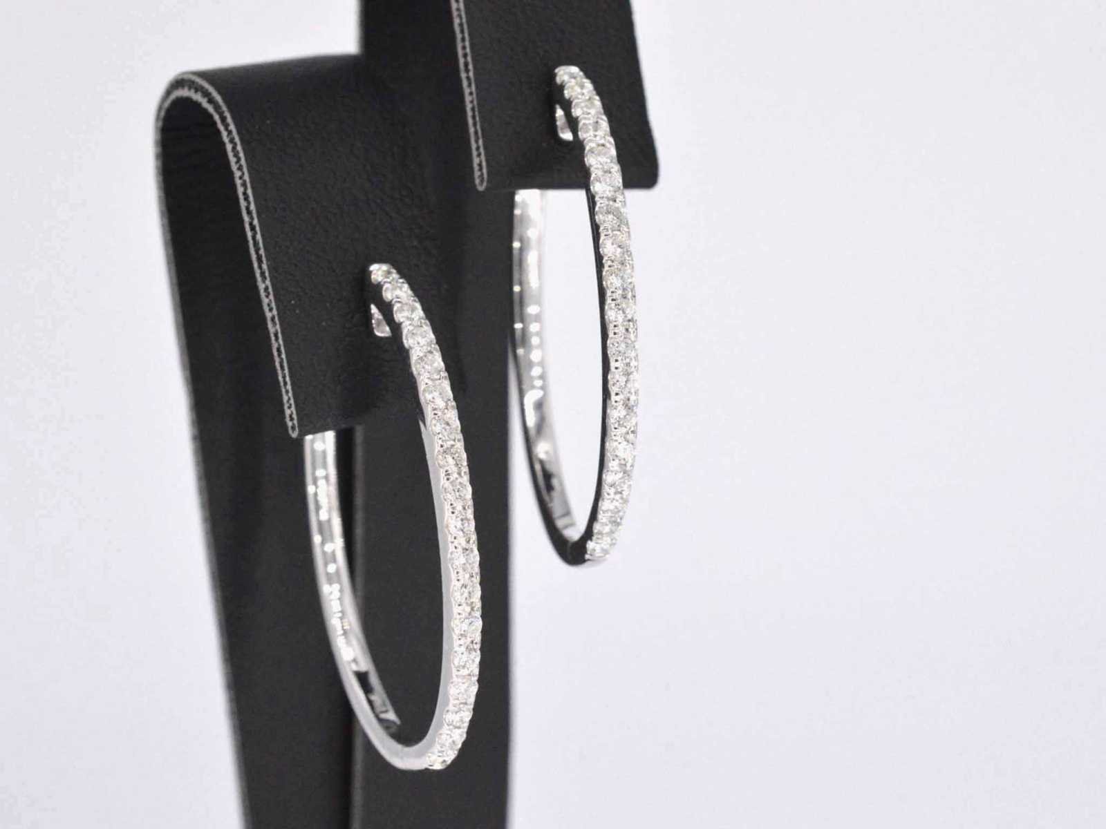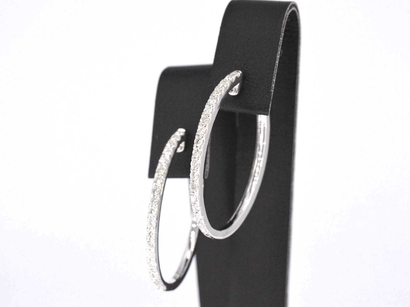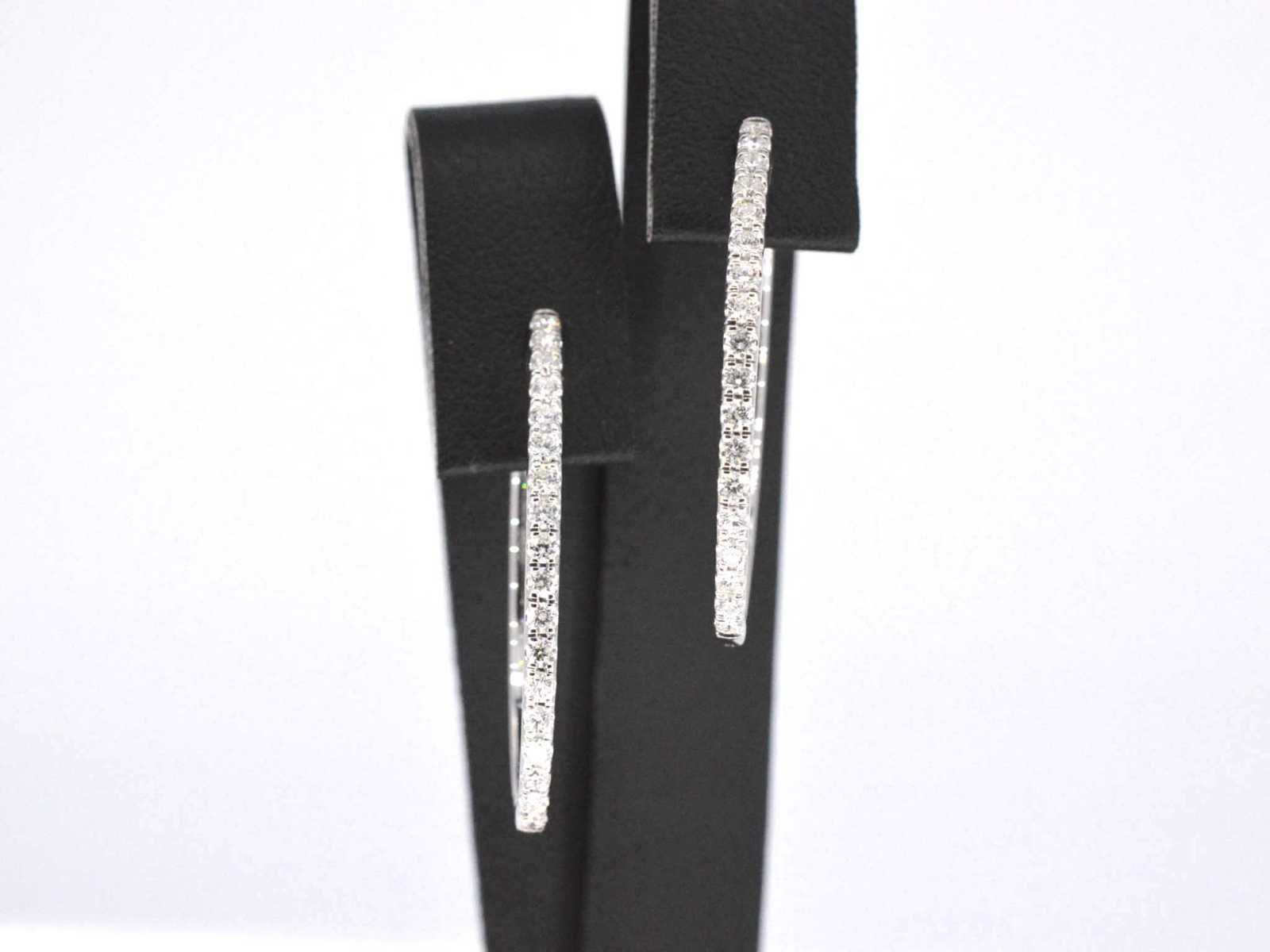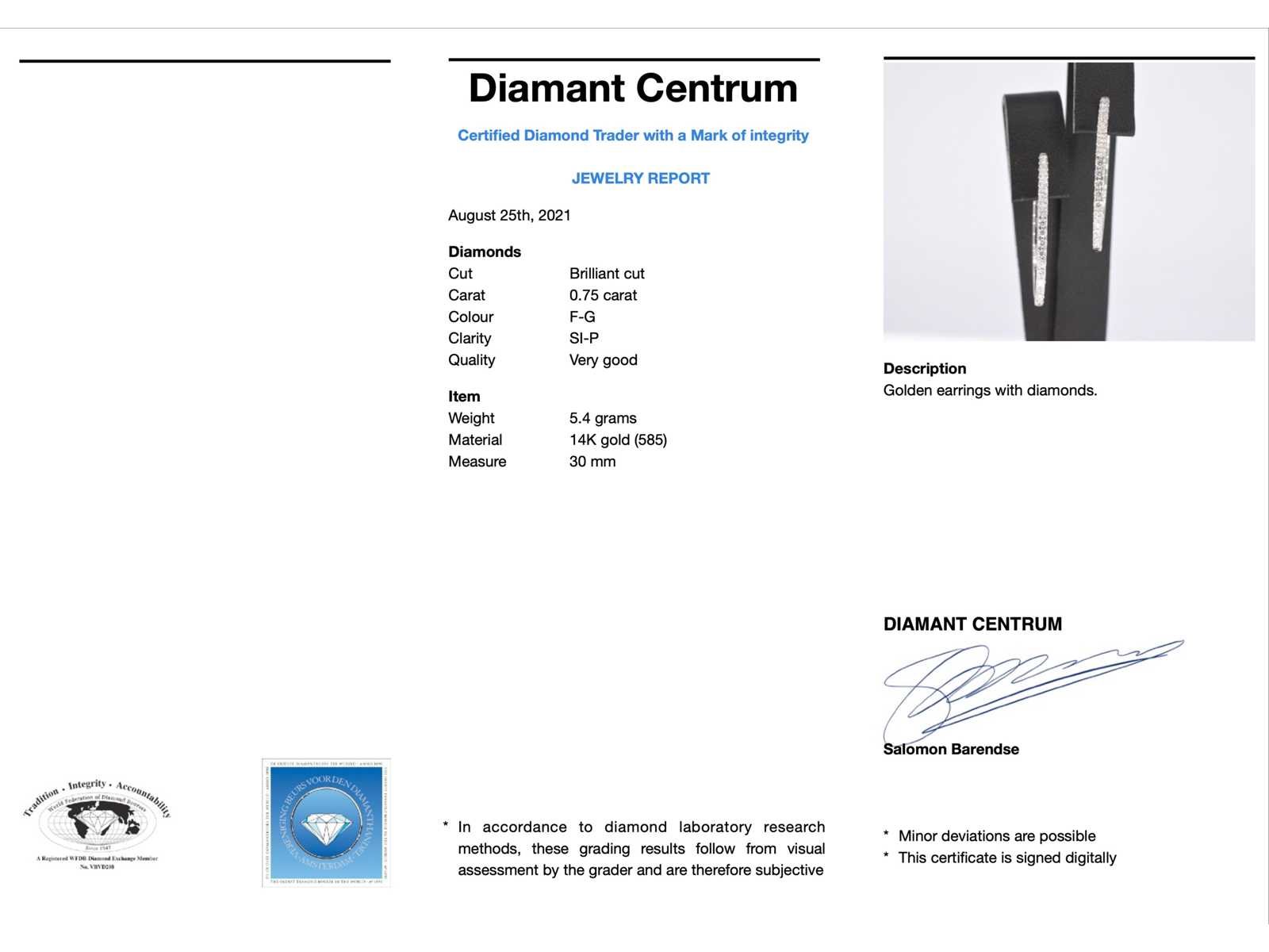Samenvatting van gegevens Witgouden oorbellen met diamanten Diamant: Natuurlijk; Slijpvorm: Briljant geslepen; Gewicht (carat): 0.75 carat; Kleur: F-G; Zuiverheid: SI-P; Slijpkwaliteit: Zeer mooi; Juweel: Oorbellen; Gewicht: 5.4 gram; Afmetingen/lengte: Diameter: 30 mm; Materiaal: 14 karaat (585); Conditie: Nieuw; Verpakking: Luxe sieradendoos; Toelichting: De kwaliteit is overgenomen van het rapport behorend bij item. De waardebepaling is een beoordeling van een gecertificeerde diamantair, gebaseerd op consumentenprijzen.; Consumentenprijs: € 4.235,- Within 14 days Voornaamste diamant: Natuurlijk Kleur diamant: F-G Gewicht diamant: 0.75ct Slijpvorm diamant: Briljant geslepen Slijpkwaliteit diamant: Zeer mooi Zuiverheidsgraad diamant: SI-P Totaal gewicht: 5.4g Keurmerk: 585