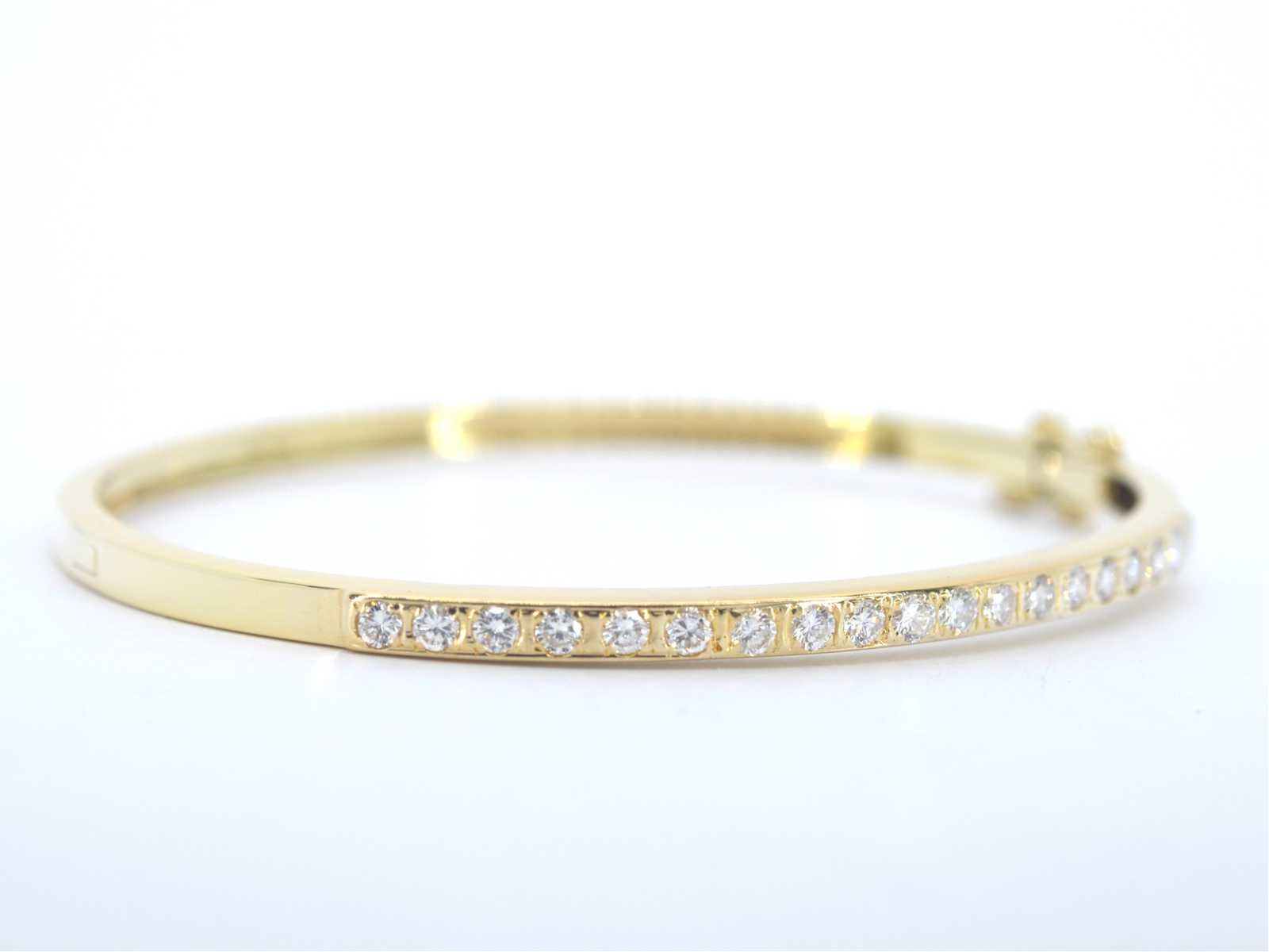 Samenvatting van gegevens Gouden vaste armband met briljant geslepen diamanten Diamant: Natuurlijk; Aantal: 19 stuks; Slijpvorm: Briljant geslepen; Gewicht (carat): 1.00 carat; Kleur: F; Zuiverheid: VVS; Slijpkwaliteit: Zeer mooi; Juweel: Armband; Gewicht: 12.6 gram; Afmetingen/lengte: 60 mm; Materiaal: 14K goud (585); Conditie: Zo goed als nieuw; Verpakking: Luxe sieradendoos; Toelichting: De kwaliteit is overgenomen van het rapport behorend bij item. De waardebepaling is een beoordeling van een gecertificeerde diamantair, gebaseerd op consumentenprijzen.; Consumentenprijs: € 14.400,- Within 14 days Materiaal: Goud Voornaamste diamant: Natuurlijk Kleur diamant: F Gewicht diamant: 1.00ct Slijpvorm diamant: Briljant geslepen Slijpkwaliteit diamant: Zeer mooi Zuiverheidsgraad diamant: VVS Totaal gewicht: 12.6g Keurmerk: 585