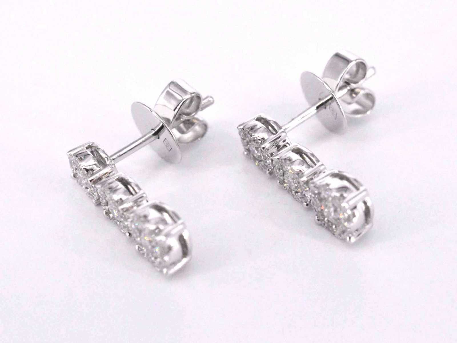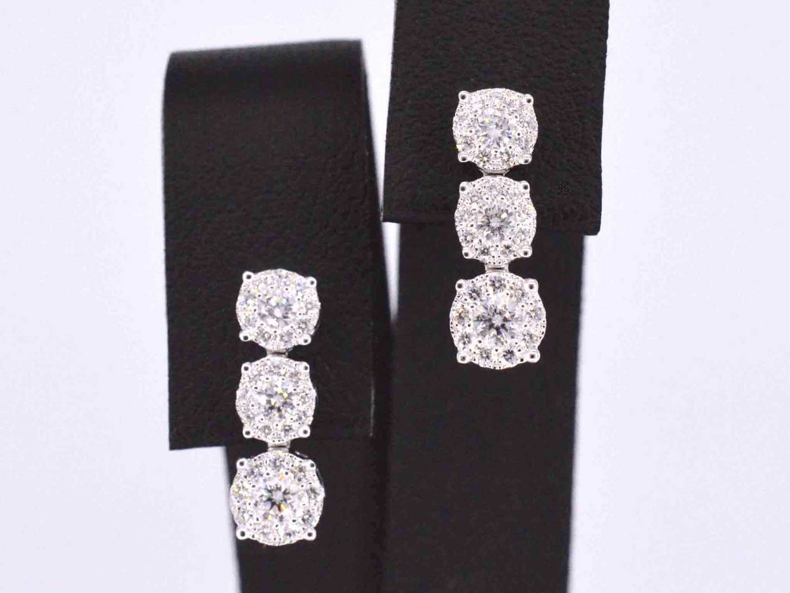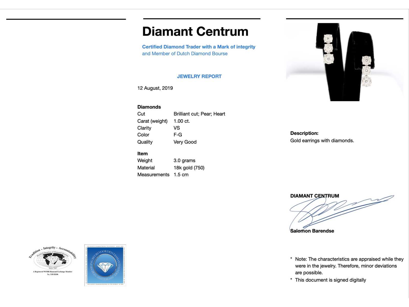 Samenvatting van gegevens Oorhangers met drie chatons van diamanten Diamant: Natuurlijk; Slijpvorm: Briljant geslepen; Gewicht (carat): 1.00 carat; Kleur: F-G; Zuiverheid: VS; Slijpkwaliteit: Zeer mooi; Juweel: Oorbellen; Gewicht: 3 gram; Afmetingen/lengte: 15 mm; Materiaal: 18K goud (750); Conditie: Nieuw; Verpakking: Luxe sieradendoos; Toelichting: De kwaliteit is overgenomen van het rapport behorend bij item. De waardebepaling is een beoordeling van een gecertificeerde diamantair, gebaseerd op consumentenprijzen.; Consumentenprijs: € 6.125,- Within 14 days Materiaal: Goud Voornaamste diamant: Natuurlijk Kleur diamant: F-G Gewicht diamant: 1.00ct Slijpvorm diamant: Briljant geslepen Slijpkwaliteit diamant: Zeer mooi Zuiverheidsgraad diamant: VS Totaal gewicht: 3g Keurmerk: 750
