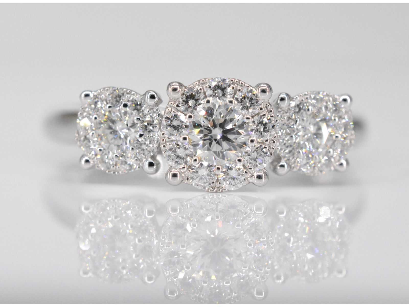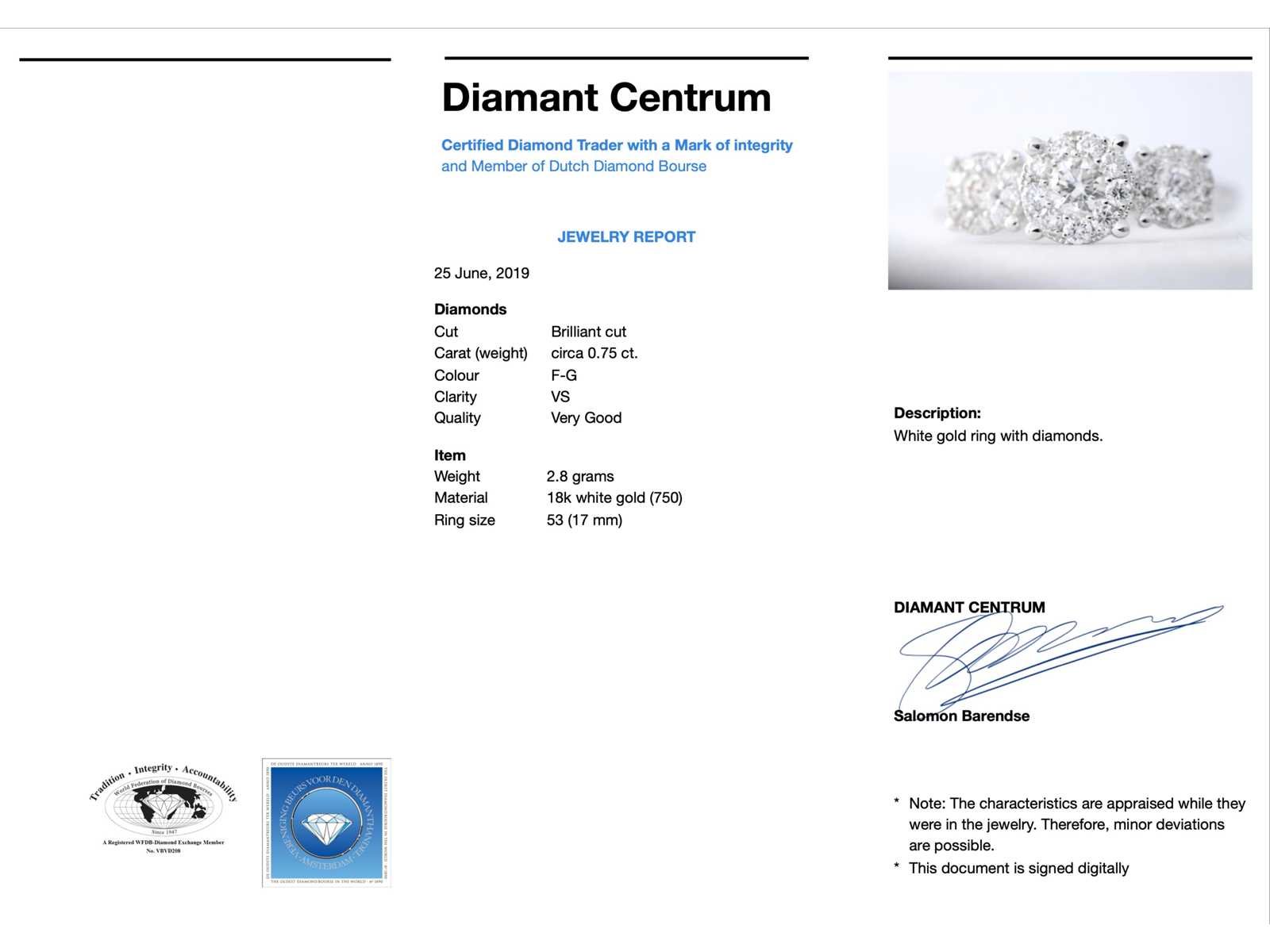 Samenvatting van gegevens ring met drie chatons van diamanten 0.75 carat Diamant: Natuurlijk; Slijpvorm: Briljant geslepen; Gewicht (carat): 0.75 carat; Kleur: F-G; Zuiverheid: VS; Slijpkwaliteit: Zeer mooi; Juweel: Ring; Gewicht: 2.8 gram; Ringmaat (op maat gemaakt*): 53 (17 mm); Materiaal: 18K goud (750); Conditie: Nieuw; Verpakking: Luxe sieradendoos; Toelichting: De kwaliteit is overgenomen van het rapport behorend bij item. De waardebepaling is een beoordeling van een gecertificeerde diamantair, gebaseerd op consumentenprijzen.; Consumentenprijs: € 4.498,- Within 14 days Materiaal: Goud Voornaamste diamant: Natuurlijk Gewicht diamant: 0.75ct Totaal gewicht: 2.8g Keurmerk: 750 Kleur diamant: F-G Slijpvorm diamant: Briljant geslepen Slijpkwaliteit diamant: Zeer mooi Zuiverheidsgraad diamant: VS