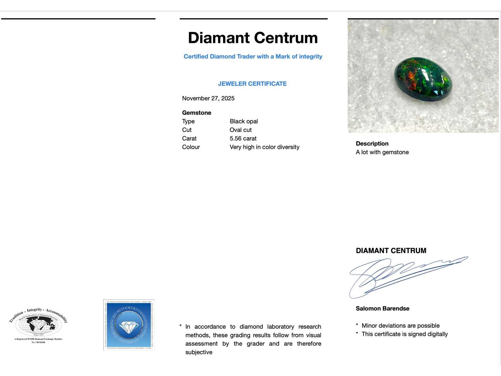 Samenvatting van gegevens Edelsteen - 5.56 carat Natuurlijke Black opal Edelsteen: Black opal; Aantal: 1 stuk; Slijpvorm: Ovaal geslepen; Gewicht (carat): 5.56 carat; Kleur: Zeer hoog in kleuren diversiteit; Conditie: Nieuw; Verpakking: Edelsteendoos; Toelichting: De kwaliteit is overgenomen van het rapport behorend bij item. De waardebepaling is een beoordeling van een gecertificeerde diamantair, gebaseerd op consumentenprijzen.; Consumentenprijs: € 2.440,- Within 14 days Edelsteen: Black opal Kleur edelsteen: Zeer hoog in kleuren diversiteit Slijpvorm edelsteen: Ovaal geslepen