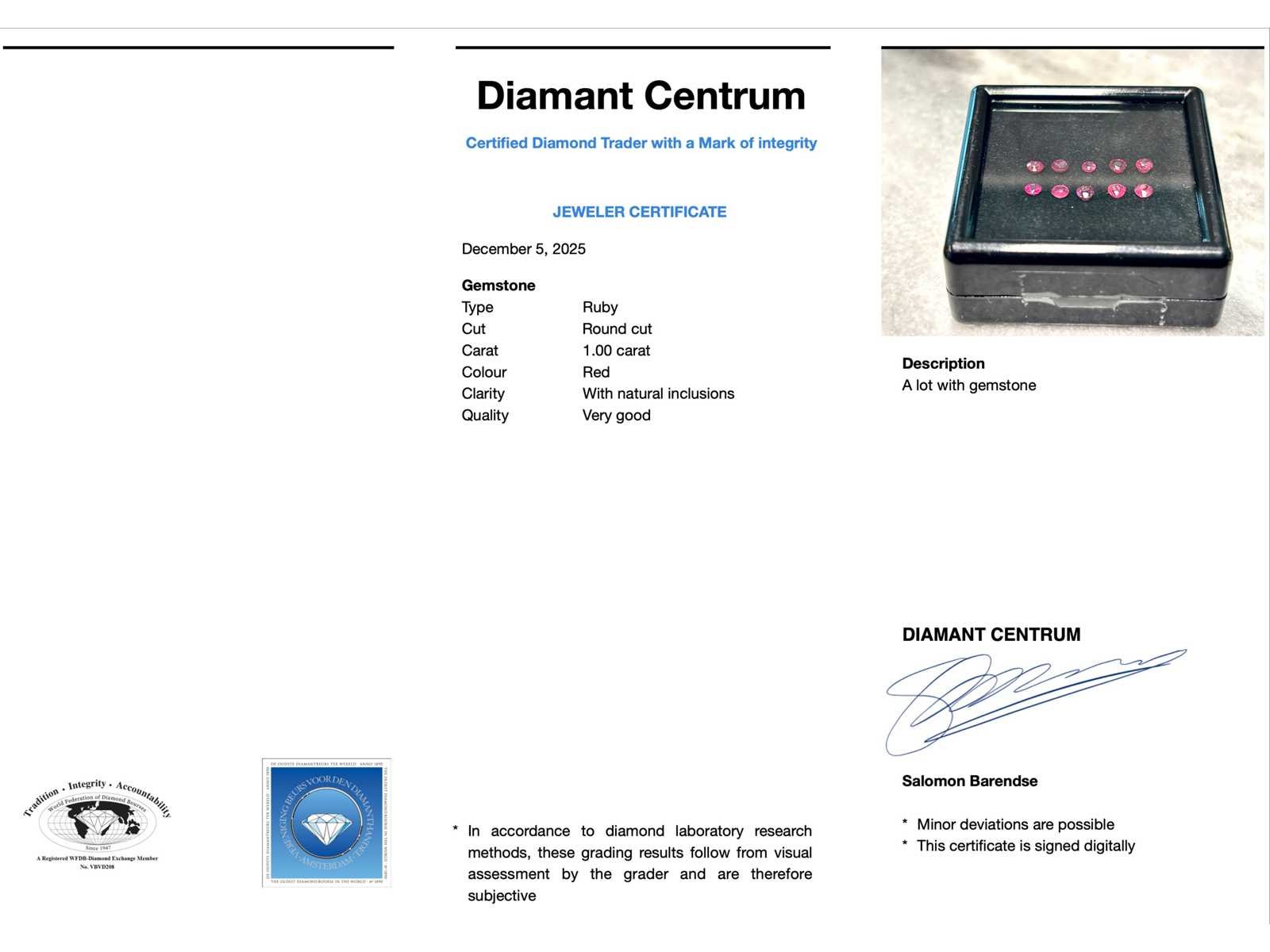 Samenvatting van gegevens Edelsteen - 1.00 carat echte natuurlijke robijn Edelsteen: Robijn; Aantal: 10 stuks; Slijpvorm: Rond geslepen; Gewicht (carat): 1.00 carat; Kleur: Rood; Zuiverheid: Met natuurlijke insluitsels; Slijpkwaliteit: Heel mooi; Conditie: Nieuw; Verpakking: Edelsteendoos; Toelichting: De kwaliteit is overgenomen van het rapport behorend bij item. De waardebepaling is een beoordeling van een gecertificeerde diamantair, gebaseerd op consumentenprijzen.; Consumentenprijs: € 2.000,- Within 14 days Edelsteen: Robijn Kleur edelsteen: Rood Slijpvorm edelsteen: Rond geslepen Slijpkwaliteit edelsteen: Heel mooi Zuiverheidsgraad edelsteen: Met natuurlijke insluitsels