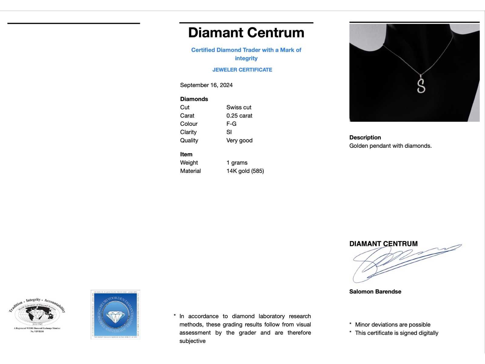 Samenvatting van gegevens Hanger met echte natuurlijke diamanten in de letter S Diamant: Natuurlijk; Slijpvorm: Swiss geslepen; Gewicht (carat): 0.25 carat; Kleur: F-G; Zuiverheid: SI; Slijpkwaliteit: Zeer mooi; Juweel: Hanger (excl. ketting); Gewicht: 1 gram; Materiaal: 14k goud (585); Conditie: Nieuw; Verpakking: Luxe sieradendoos; Toelichting: De kwaliteit is overgenomen van het rapport behorend bij item. De waardebepaling is een beoordeling van een gecertificeerde diamantair, gebaseerd op consumentenprijzen.; Consumentenprijs: € 1.383,- Within 14 days Materiaal: Goud Voornaamste diamant: Natuurlijk Kleur diamant: F-G Gewicht diamant: 0.25ct Slijpvorm diamant: Swiss geslepen Slijpkwaliteit diamant: Zeer mooi Zuiverheidsgraad diamant: SI Totaal gewicht: 1g Keurmerk: 585