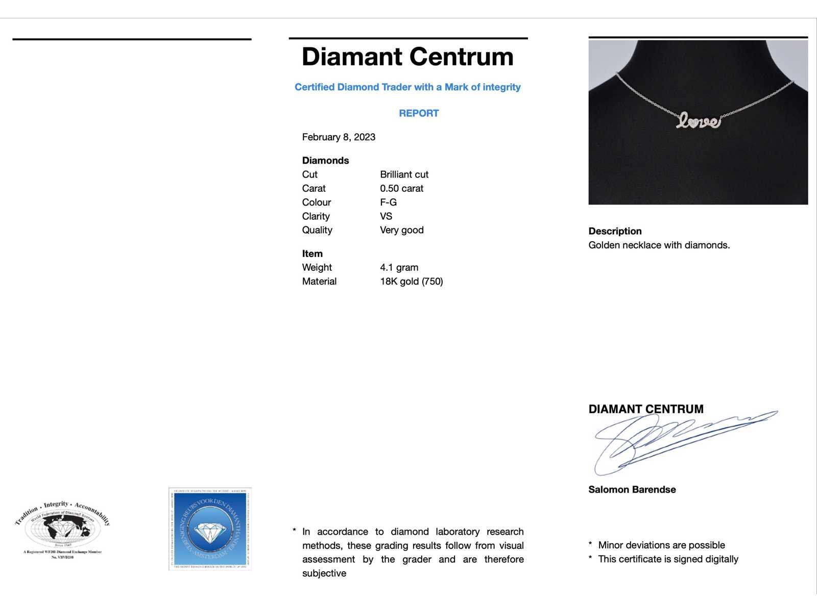 Samenvatting van gegevens Witgouden 'love' collier met diamanten Diamant: Natuurlijk; Aantal: 52 stuks; Slijpvorm: Briljant geslepen; Gewicht (carat): 0.50 carat; Kleur: F-G; Zuiverheid: VS; Slijpkwaliteit: Zeer mooi; Juweel: Ketting; Gewicht: 4.1 gram; Afmetingen/lengte: 40 cm; Materiaal: 18K goud (750); Conditie: Nieuw; Verpakking: Luxe sieradendoos; Toelichting: De kwaliteit is overgenomen van het rapport behorend bij item. De waardebepaling is een beoordeling van een gecertificeerde diamantair, gebaseerd op consumentenprijzen.; Consumentenprijs: € 4.673,- Within 14 days Materiaal: Goud Voornaamste diamant: Natuurlijk Kleur diamant: F-G Gewicht diamant: 0.50ct Slijpvorm diamant: Briljant geslepen Slijpkwaliteit diamant: Zeer mooi Zuiverheidsgraad diamant: VS Totaal gewicht: 4.1g Keurmerk: 750