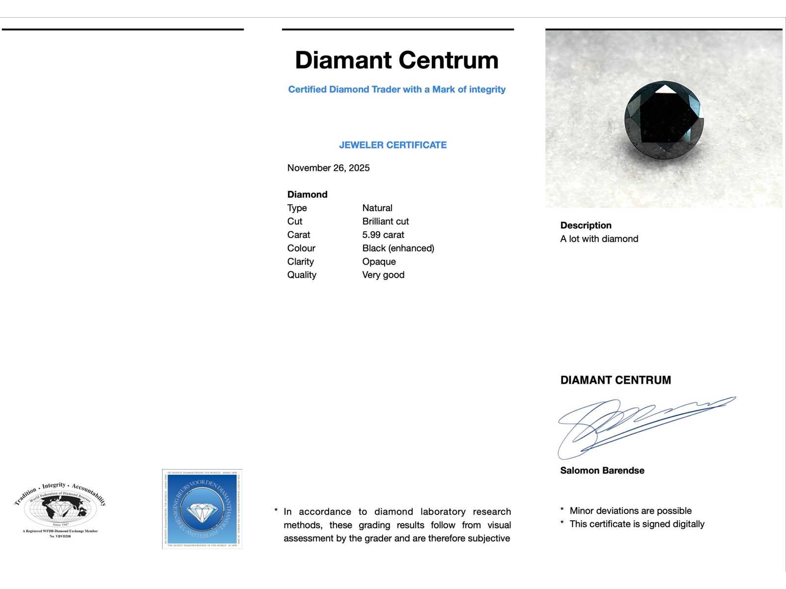 Samenvatting van gegevens Diamant - 5.59 carat echte natuurlijke zwarte diamant Diamant: Natuurlijk; Aantal: 1 stuk; Slijpvorm: Briljant geslepen; Gewicht (carat): 5.59 carat; Kleur: Zwart (enhanced); Zuiverheid: Opaak; Slijpkwaliteit: Zeer mooi; Conditie: Nieuw; Verpakking: Edelsteendoos; Toelichting: De kwaliteit is overgenomen van het rapport behorend bij item. De waardebepaling is een beoordeling van een gecertificeerde diamantair, gebaseerd op consumentenprijzen.; Consumentenprijs: € 4.000,- Within 14 days Voornaamste diamant: Natuurlijk Kleur diamant: Zwart (enhanced) Gewicht diamant: 5.59ct Slijpvorm diamant: Briljant geslepen Slijpkwaliteit diamant: Zeer mooi Zuiverheidsgraad diamant: Opaak