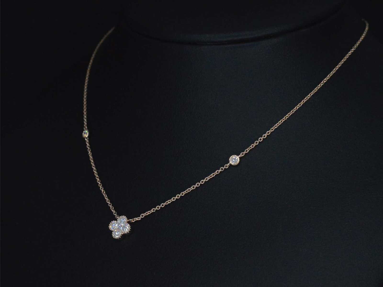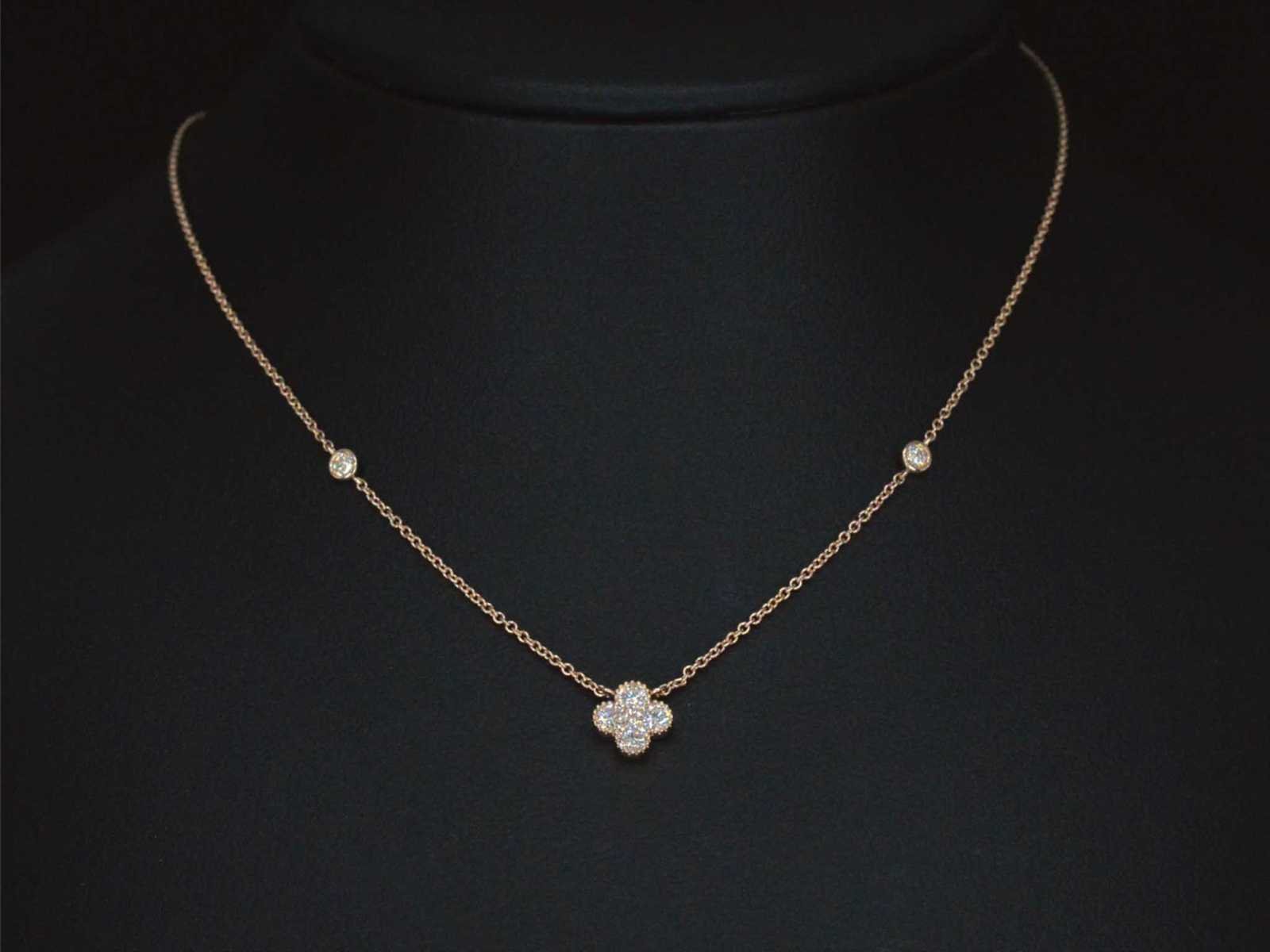 Samenvatting van gegevens Rosegouden collier met diamanten hangers klaver vier Diamant: Natuurlijk; Aantal: 7 stuks; Slijpvorm: Briljant geslepen; Gewicht (carat): 0.30 carat; Kleur: F-G; Zuiverheid: VS; Slijpkwaliteit: Zeer mooi; Juweel: Collier; Gewicht: 1.9 gram; Afmetingen/lengte: 42 cm; Materiaal: 18K goud (750); Conditie: Nieuw; Verpakking: Luxe sieradendoos; Toelichting: De kwaliteit is overgenomen van het rapport behorend bij item. De waardebepaling is een beoordeling van een gecertificeerde diamantair, gebaseerd op consumentenprijzen.; Consumentenprijs: € 3.028,- Within 14 days Materiaal: Goud Voornaamste diamant: Natuurlijk Kleur diamant: F-G Gewicht diamant: 0.30ct Slijpvorm diamant: Briljant geslepen Slijpkwaliteit diamant: Zeer mooi Zuiverheidsgraad diamant: VS Totaal gewicht: 1.9g Keurmerk: 750