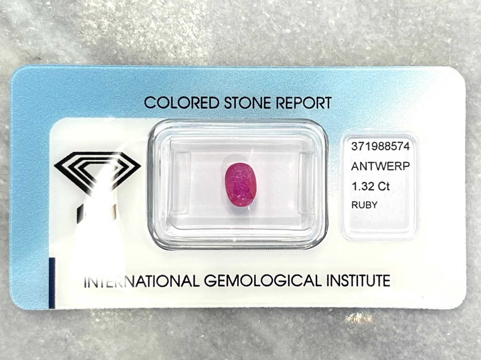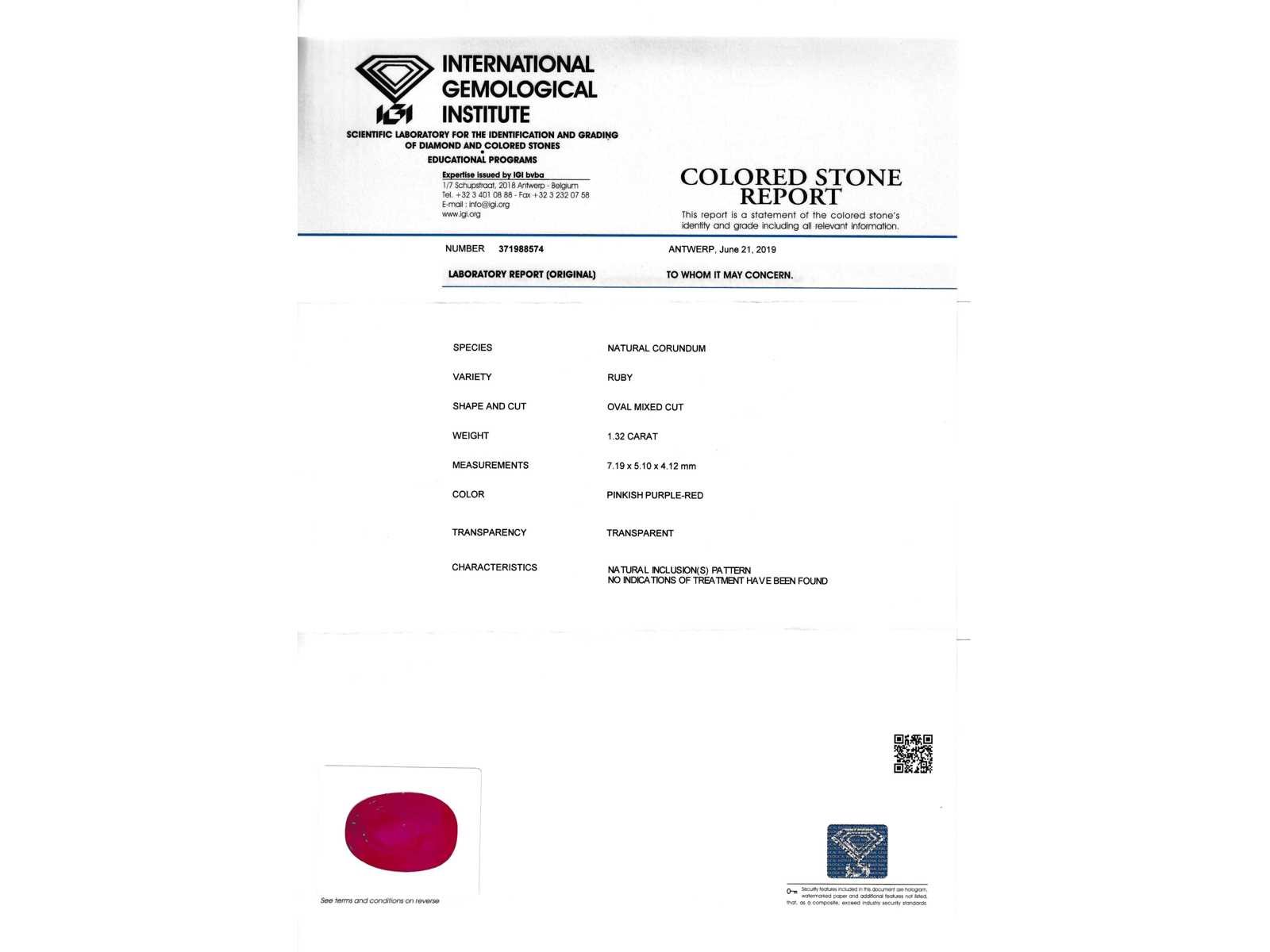 Samenvatting van gegevens Edelsteen - 1.32 carat echte robijn (gecertificeerd) Diamant: Natuurlijk; Aantal: 1 stuk; Slijpvorm: Ovaal geslepen; Gewicht (carat): 1.32 carat; Kleur: Pinkish purple-red; Zuiverheid: Met natuurlijke insluitsels; Certificaat: IGI; Certificaat nummer: 371988574; Conditie: Nieuw; Verpakking: Edelsteendoos; Toelichting: De kwaliteit is overgenomen van het rapport behorend bij item. De waardebepaling is een beoordeling van een gecertificeerde diamantair, gebaseerd op consumentenprijzen.; Consumentenprijs: € 5.000,- Within 14 days Voornaamste diamant: Natuurlijk Kleur diamant: Pinkish purple-red Gewicht diamant: 1.32ct Slijpvorm diamant: Ovaal geslepen Zuiverheidsgraad diamant: Met natuurlijke insluitsels Certificaat: IGI