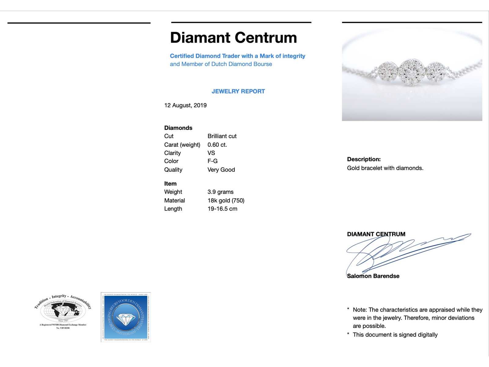 Samenvatting van gegevens Witgouden armband met diamanten Diamant: Natuurlijk; Slijpvorm: Briljant geslepen; Gewicht (carat): 0.60 carat; Kleur: F-G; Zuiverheid: VS; Slijpkwaliteit: Zeer mooi; Juweel: Armband; Gewicht: 3.9 gram; Afmetingen/lengte: 16, 5 - 19 cm (verstelbaar); Materiaal: 18K goud (750); Conditie: Nieuw; Verpakking: Luxe sieradendoos; Toelichting: De kwaliteit is overgenomen van het rapport behorend bij item. De waardebepaling is een beoordeling van een gecertificeerde diamantair, gebaseerd op consumentenprijzen.; Consumentenprijs: € 6.125,- Within 14 days Materiaal: Goud Voornaamste diamant: Natuurlijk Kleur diamant: F-G Gewicht diamant: 0.60ct Slijpvorm diamant: Briljant geslepen Slijpkwaliteit diamant: Zeer mooi Zuiverheidsgraad diamant: VS Totaal gewicht: 3.9g Keurmerk: 750