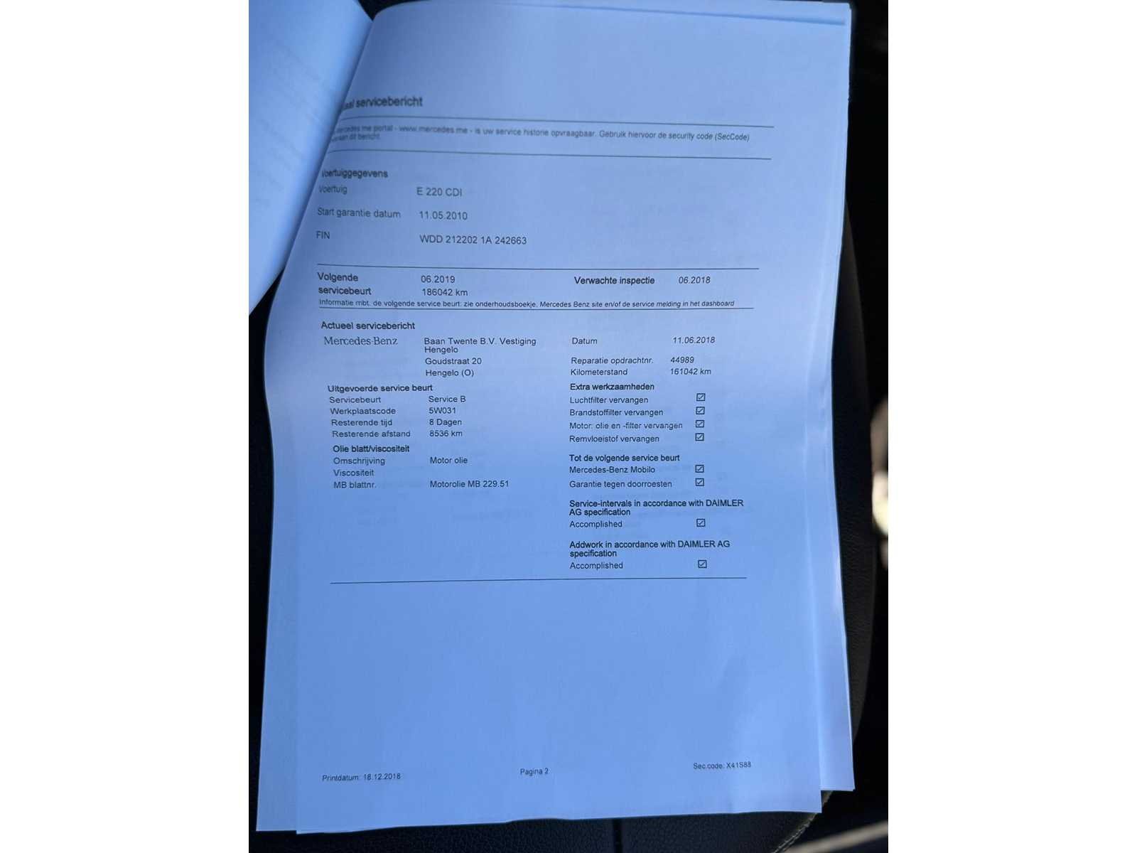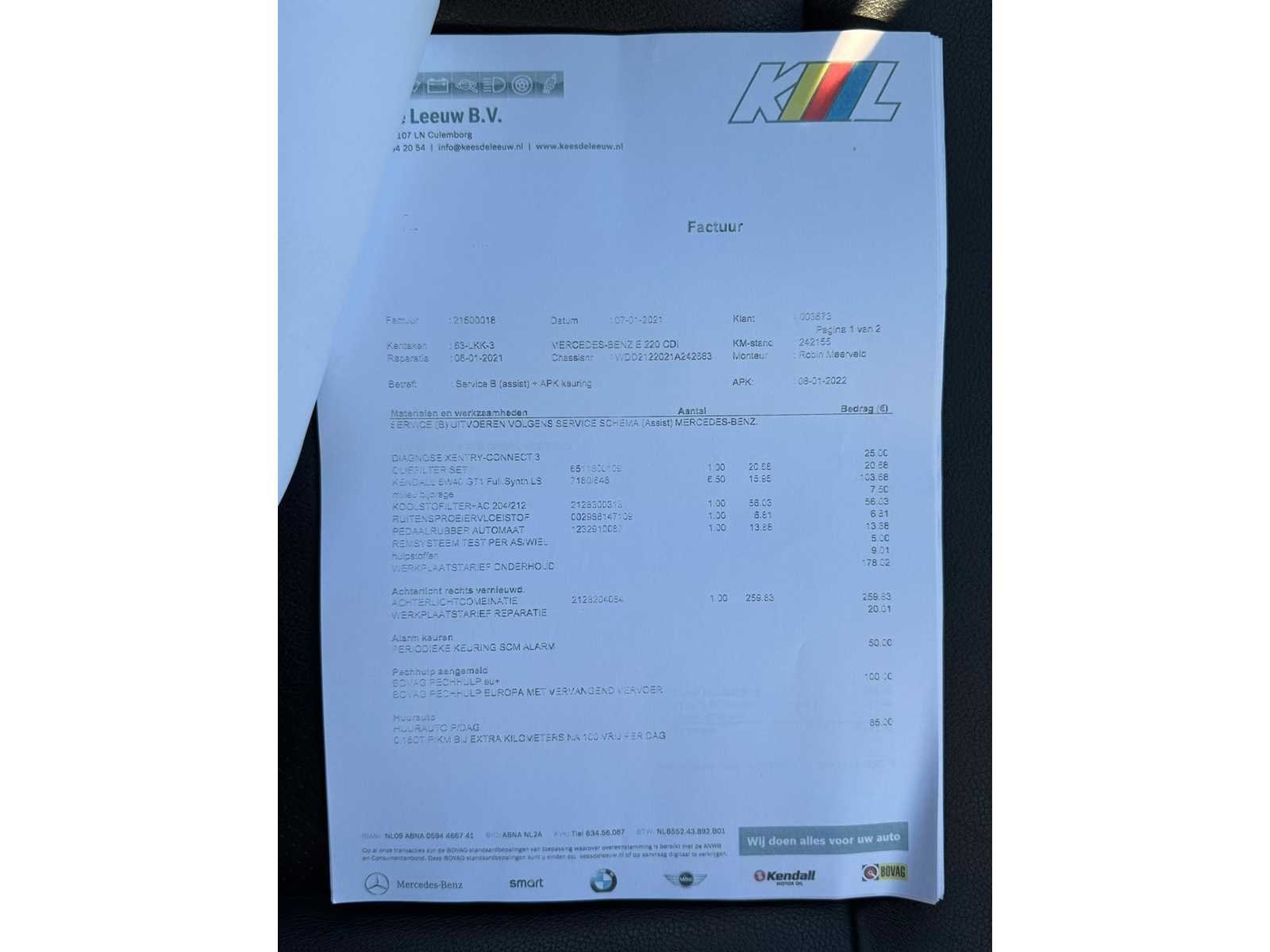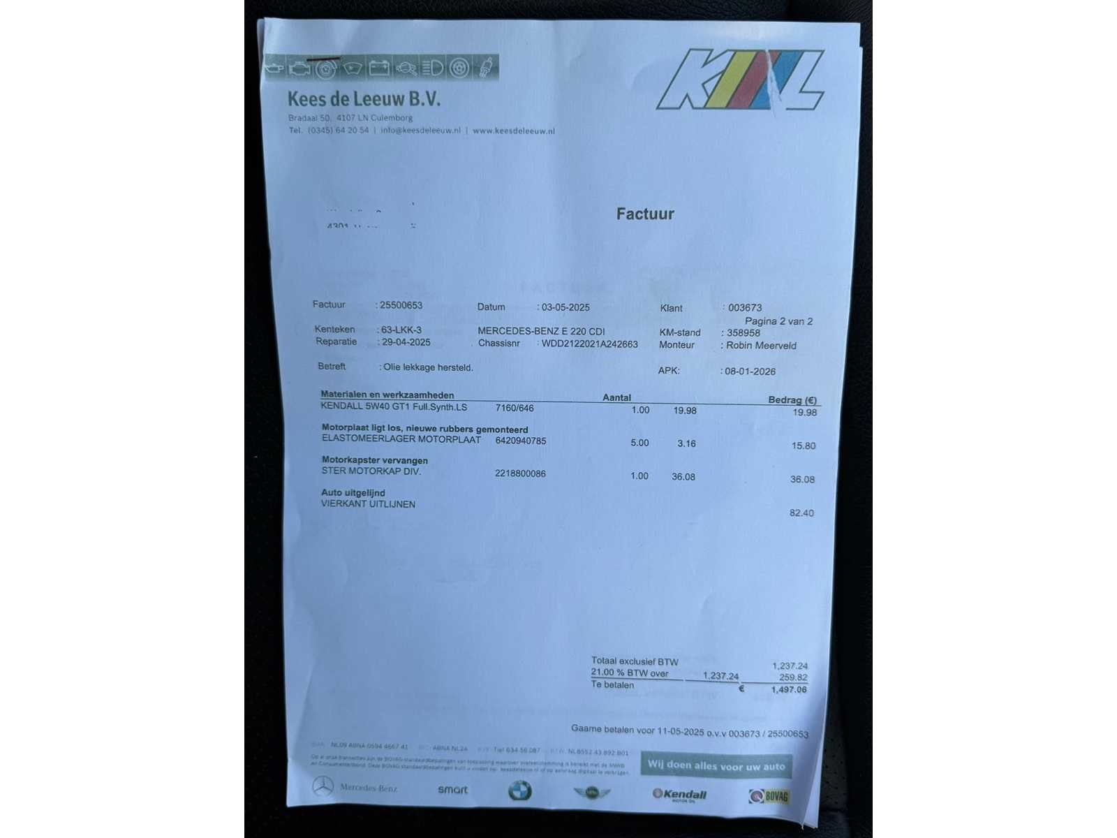 Kenteken: 63-LKK-3 Merk: Mercedes-Benz Model: E-klasse Estate Type: 220 CDI Avantgarde ORG NEDERLANDS NAP 63-LKK-3 Afgelezen kilometerstand: 370439km Cilinderinhoud: 2143cc Vermogen (kW): 125kW Brandstof: Diesel Chassisnummer: WDD2122021A2426632663 Laadvermogen: 0kg NAP status: Logisch Datum eerste toelating: 2010-05-11 Datum eerste toelating (NL): 2010-05-11 APK vervaldatum: 2026-01-08 Vermogen (pk): 170hp Energielabel: C Aandrijving: RWD Aantal zitplaatsen: 5 Maximaal trekgewicht ongeremd: 750kg Maximaal trekgewicht geremd: 2100kg Kleur: grijs Transmissie: Automaat Stuurwiel: links Emissieklasse: 5 Aantal deuren: 4 Ledig gewicht: 1745kg Bruto BPM (NL): 16474€ Rest BPM: 939€ Aantal cilinders: 4 Carrosserie: stationwagen CO2-uitstoot NEDC: 162 Onderhoudshistorie: Ja gedeeltelijk Carfax Link: https://was.carfax.eu/v0/api/ccdid/5100016408/svc/201/vinreg/63LKK3/checksum/eyJhbGciOiJIUzI1NiIsInR5cCI6IkpXVCJ9.eyJleHAiOjE3NjI2ODMyNDB9.uL2NFL1JrZhreoQHObNg0iPorfwfNfEjk7DJxlTpv9w startinformatie : Start en rijdt