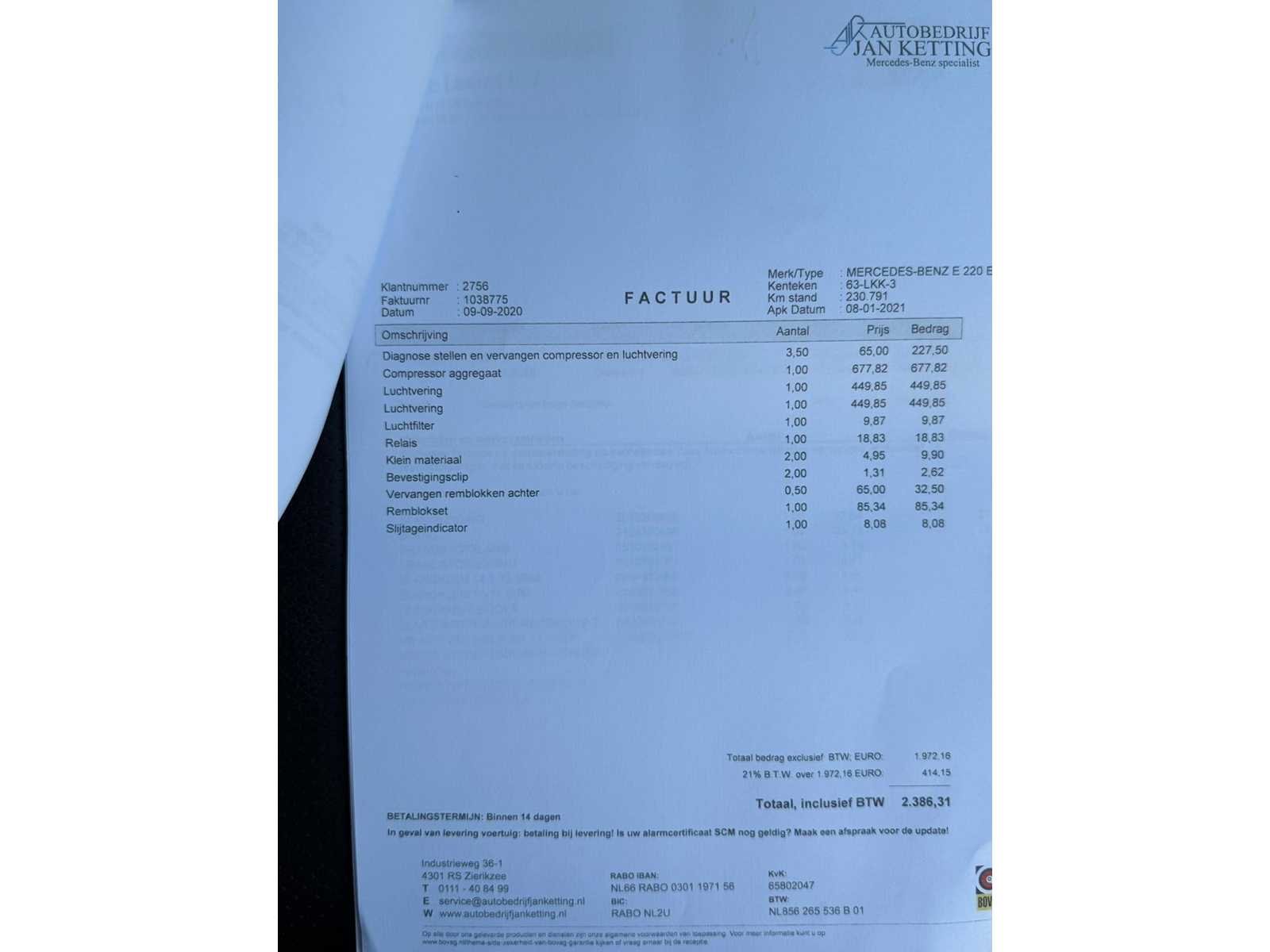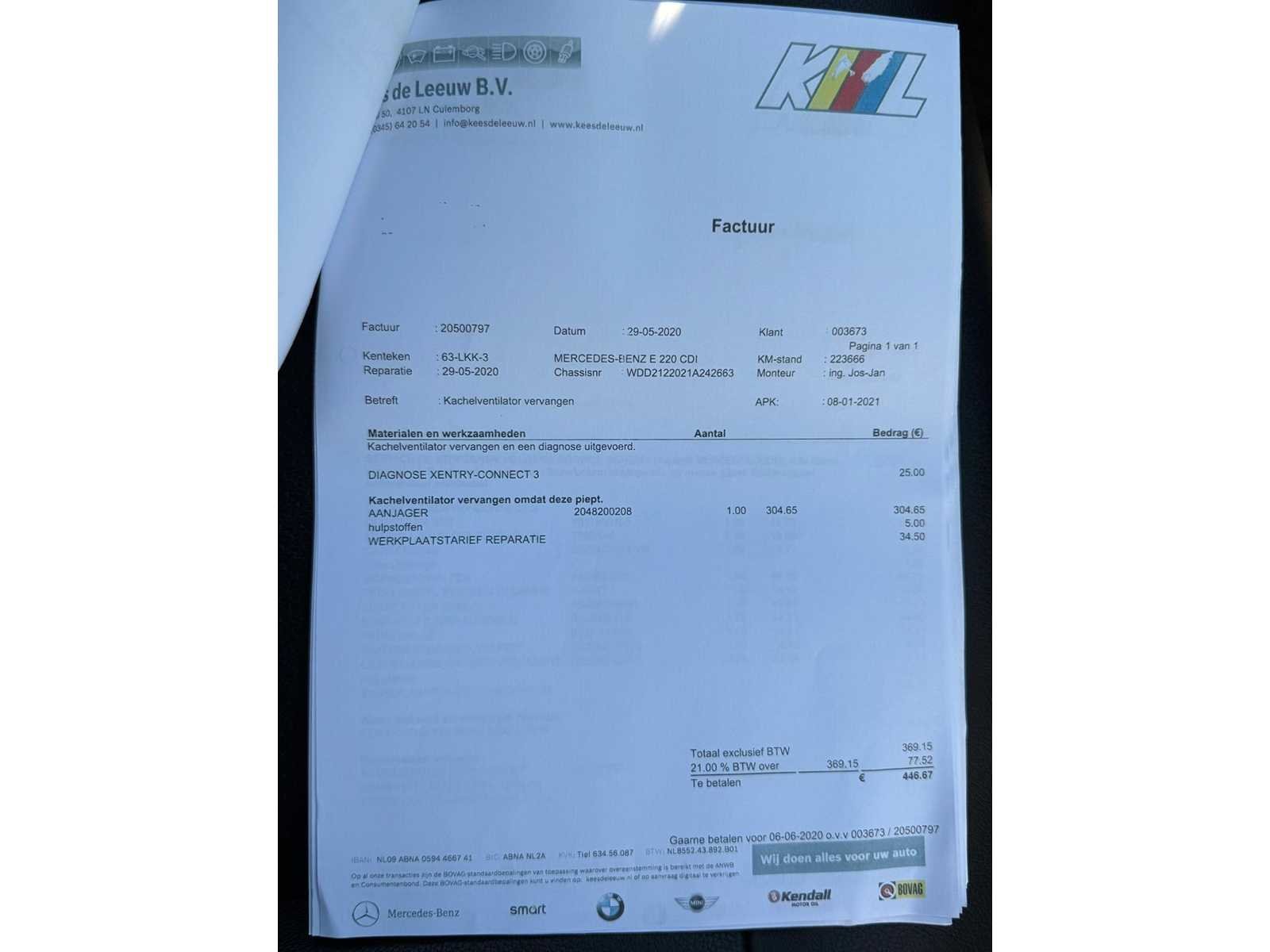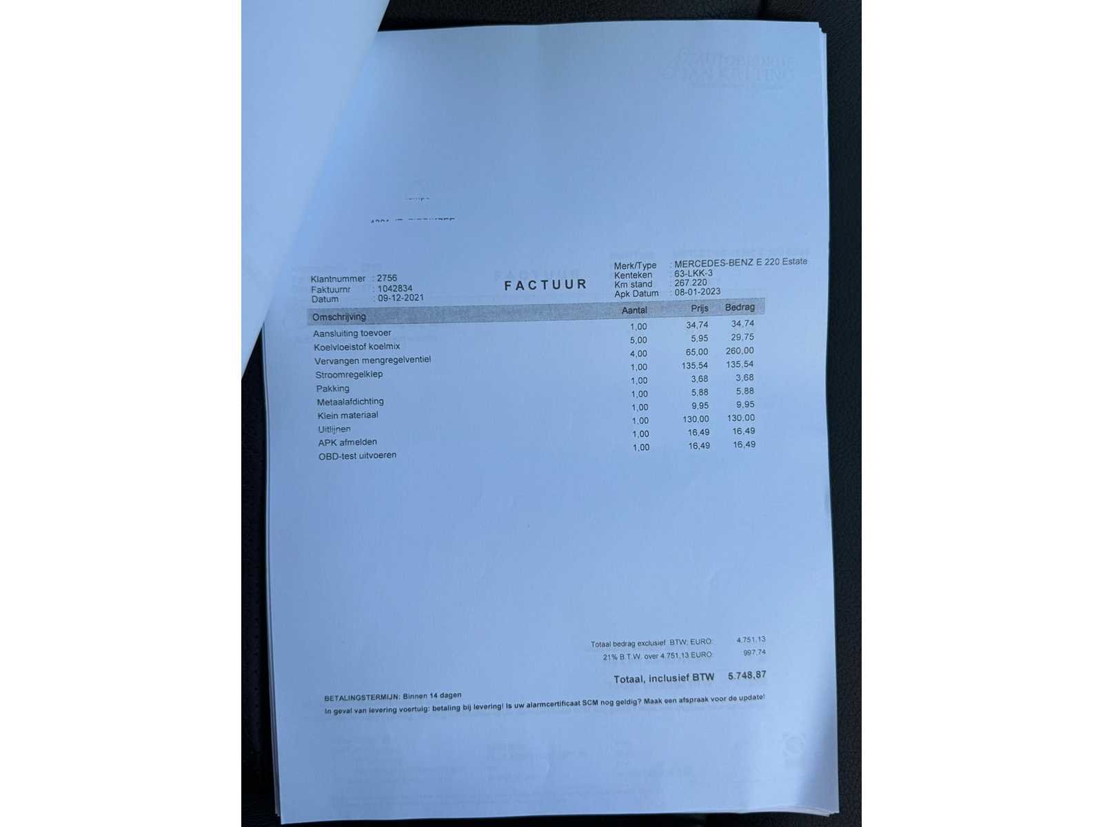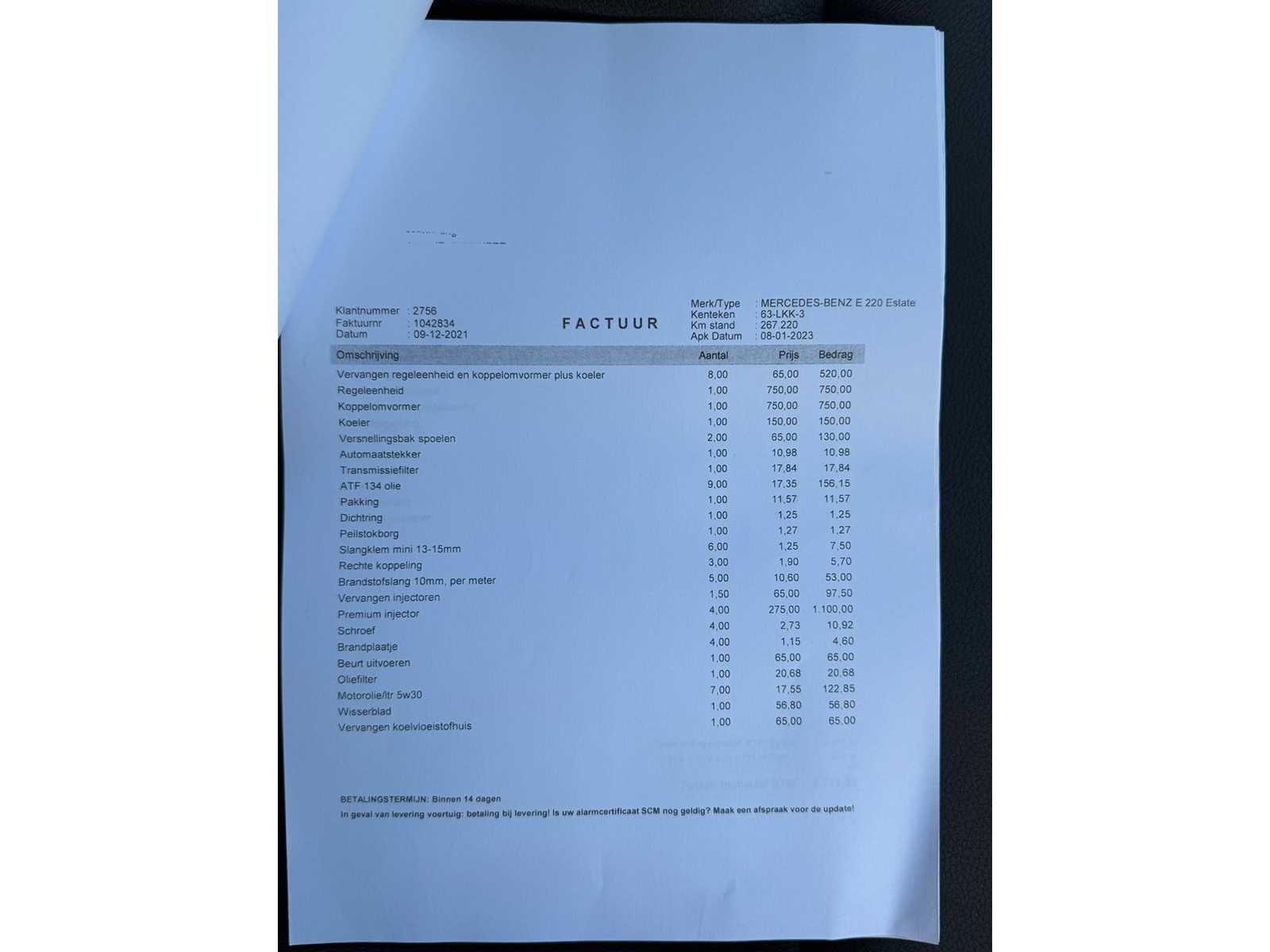 Kenteken: 63-LKK-3 Merk: Mercedes-Benz Model: E-klasse Estate Type: 220 CDI Avantgarde ORG NEDERLANDS NAP 63-LKK-3 Afgelezen kilometerstand: 370439km Cilinderinhoud: 2143cc Vermogen (kW): 125kW Brandstof: Diesel Chassisnummer: WDD2122021A2426632663 Laadvermogen: 0kg NAP status: Logisch Datum eerste toelating: 2010-05-11 Datum eerste toelating (NL): 2010-05-11 APK vervaldatum: 2026-01-08 Vermogen (pk): 170hp Energielabel: C Aandrijving: RWD Aantal zitplaatsen: 5 Maximaal trekgewicht ongeremd: 750kg Maximaal trekgewicht geremd: 2100kg Kleur: grijs Transmissie: Automaat Stuurwiel: links Emissieklasse: 5 Aantal deuren: 4 Ledig gewicht: 1745kg Bruto BPM (NL): 16474€ Rest BPM: 939€ Aantal cilinders: 4 Carrosserie: stationwagen CO2-uitstoot NEDC: 162 Onderhoudshistorie: Ja gedeeltelijk Carfax Link: https://was.carfax.eu/v0/api/ccdid/5100016408/svc/201/vinreg/63LKK3/checksum/eyJhbGciOiJIUzI1NiIsInR5cCI6IkpXVCJ9.eyJleHAiOjE3NjI2ODMyNDB9.uL2NFL1JrZhreoQHObNg0iPorfwfNfEjk7DJxlTpv9w startinformatie : Start en rijdt