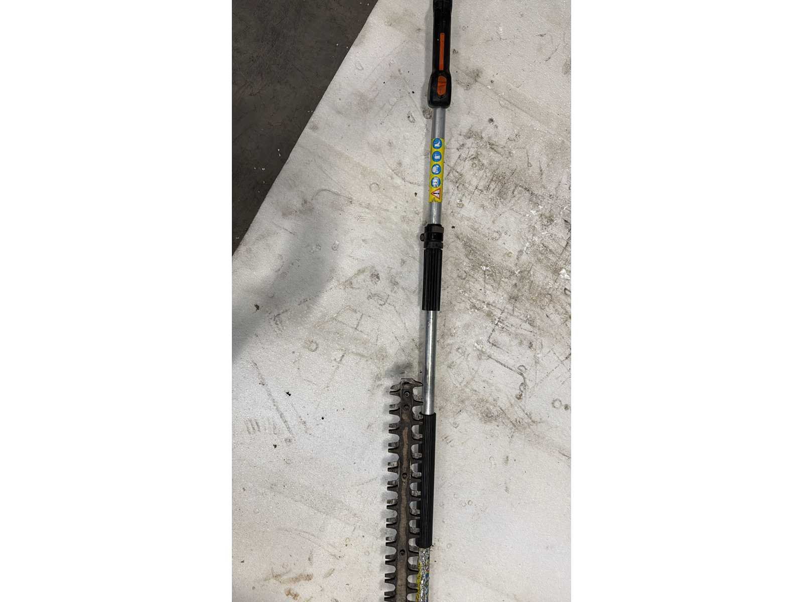 STIHL benzine Stok-heggenschaar; Snoerloze stok-heggenschaar met lang; dubbelzijdig snijblad en verstelbare kop; aluminium steel met bedieningshandgreep; Gebruikte staat met normale gebruiks- en slijtsporen CE-gemarkeerd; geschikt voor professioneel groenonderhoud; Merk: Stihl