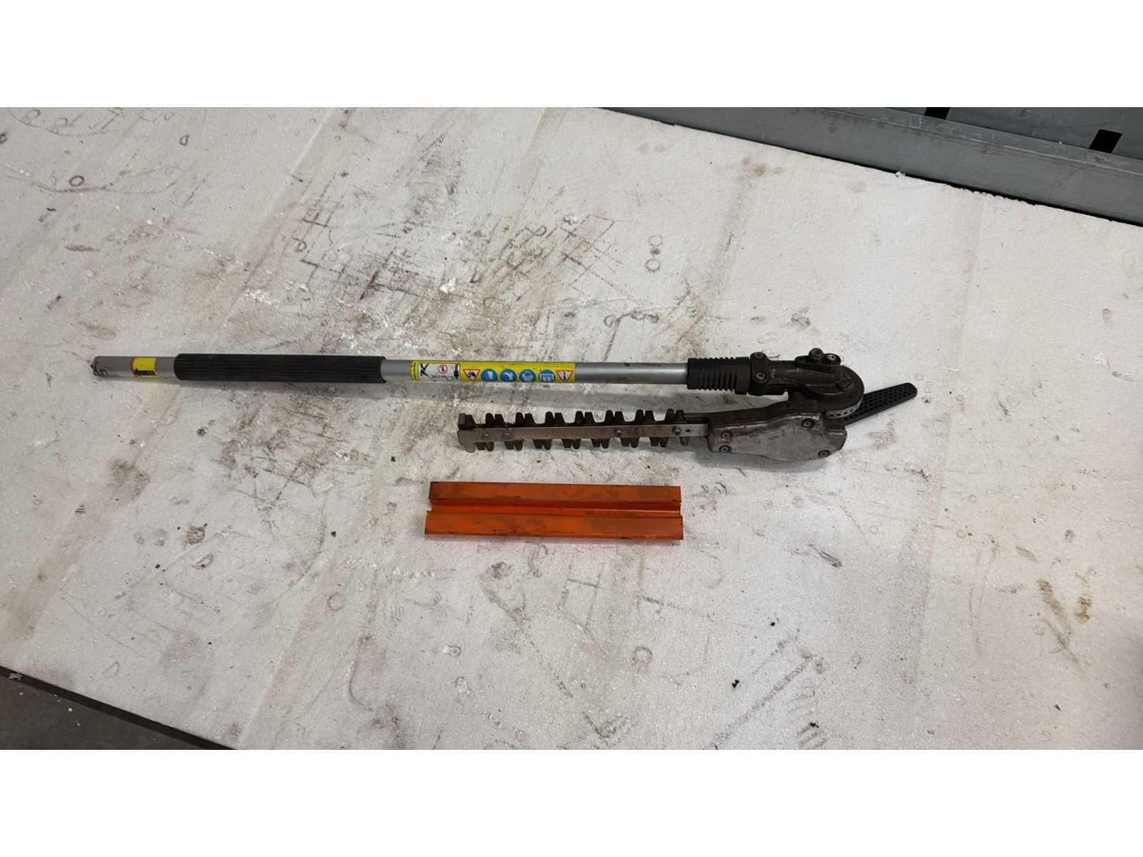 / Bovenstuk (op steel); Professioneel heggenschaar-opzetstuk (bovenstuk) voor STIHL stoksystemen; model FH 135. Voorzien van aluminium draagsteel; verstelbare heggenschaarkop met dubbelzijdige messen en bedieningshandgreep; Gebruikte staat met normale slijtage en lichte vervuiling; CE markering en typeplaat aanwezig; Geschikt voor professioneel heg- en groenonderhoud; Merk: Stihl Type: FH 135