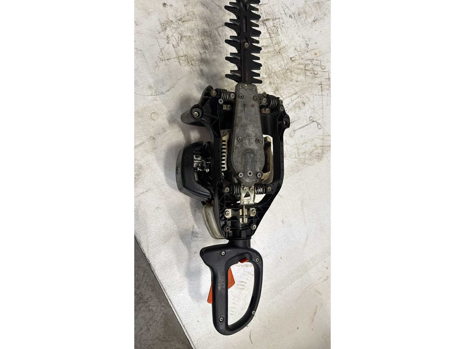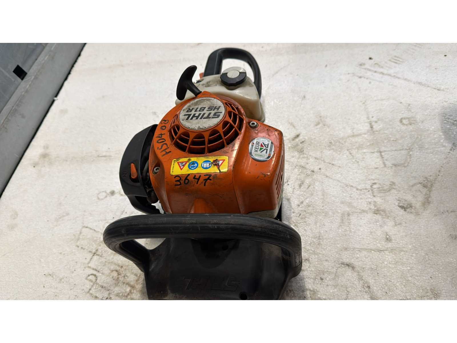 (Benzine); Benzine-aangedreven professionele heggenschaar met dubbelzijdig snijblad; Robuust ontwerp met handstart; blade guard en CE-markering; Gebruikte staat met duidelijke slijtage en vervuiling; functionele werkplaats/terrein-uitvoering; Geschikt voor intensief groenonderhoud; Merk: Stihl Type: HS 81 R Brandstofmotor aangedreven: true Brandstof: Benzine