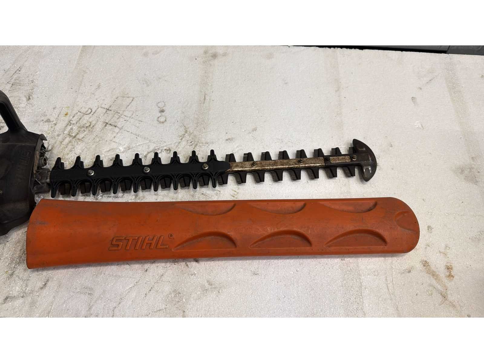 (Benzine); Benzine-aangedreven professionele heggenschaar met dubbelzijdig snijblad; Robuust ontwerp met handstart; blade guard en CE-markering; Gebruikte staat met duidelijke slijtage en vervuiling; functionele werkplaats/terrein-uitvoering; Geschikt voor intensief groenonderhoud; Merk: Stihl Type: HS 81 R Brandstofmotor aangedreven: true Brandstof: Benzine