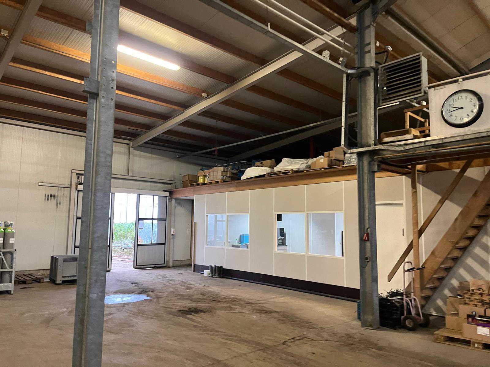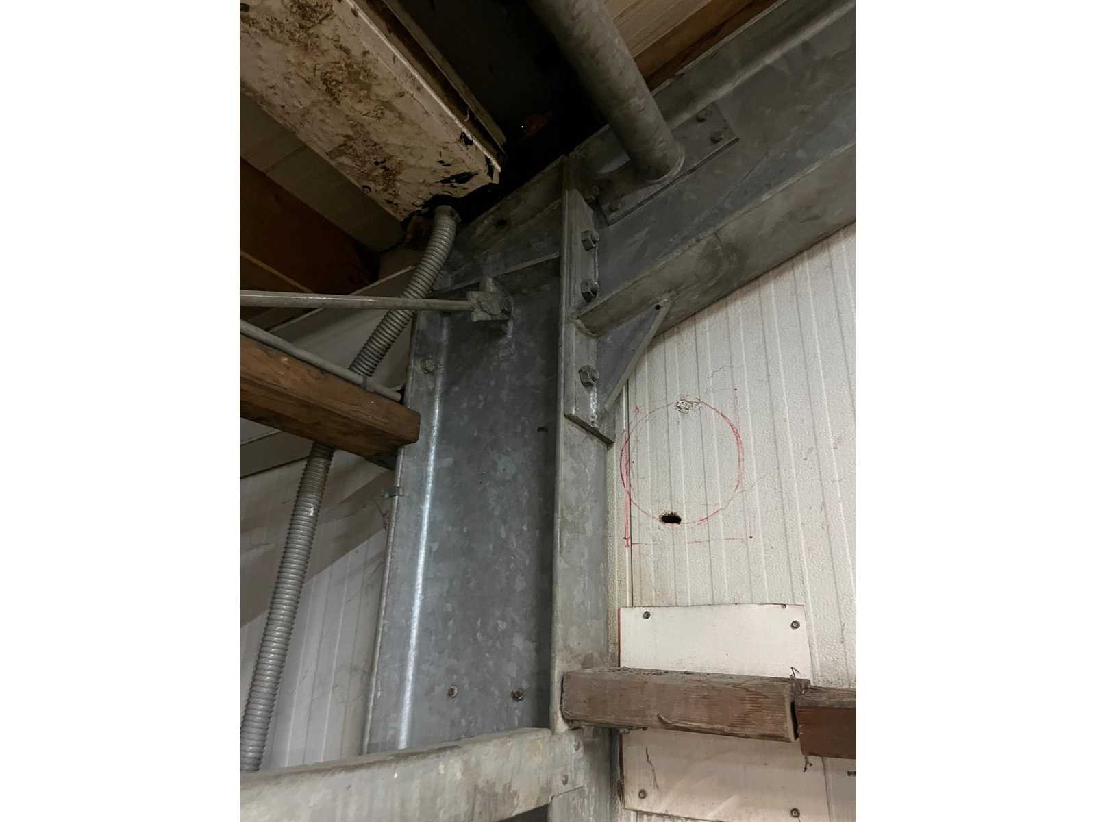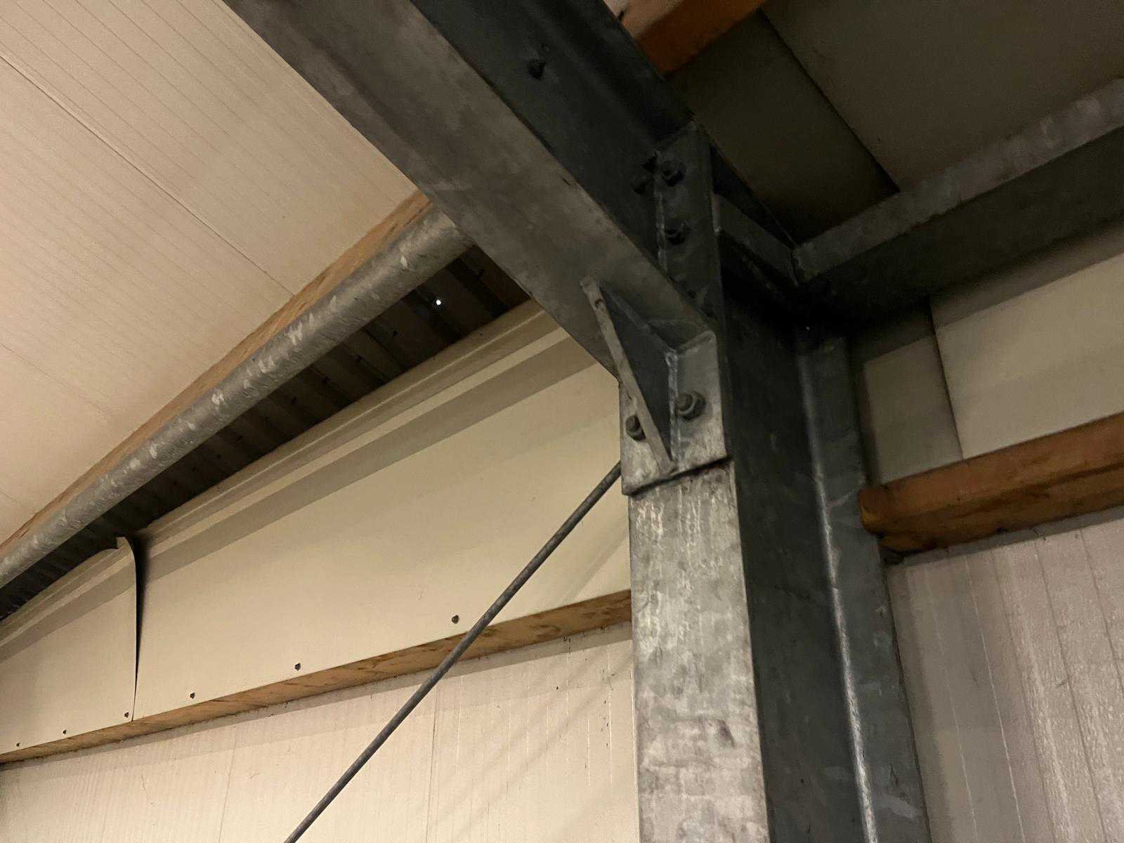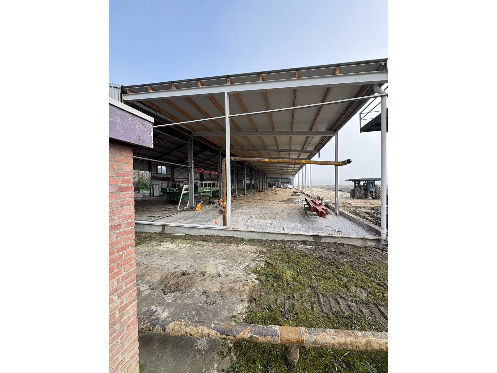 Overkapping diepte 10000 mm; totale lengte object 10 vakken van 5000 mm is 50000 mm; hoogte hoge zijde 6700 mm; hoogte lage zijde 0000 mm; kolommen IPE 330 en IPE 300; spantbenen IPE 300; volblad verzinkte constructie; dek en gevel gordingen van hout; stalen drukbalken; schoor strippen; windverbanden dak; constructie gemonteerd met bouten en moeren; met dak beplating; constructie wordt gedemonteerd door opdrachtgever en transport klaar gemaakt; kijkdag en afhalen op afspraak;