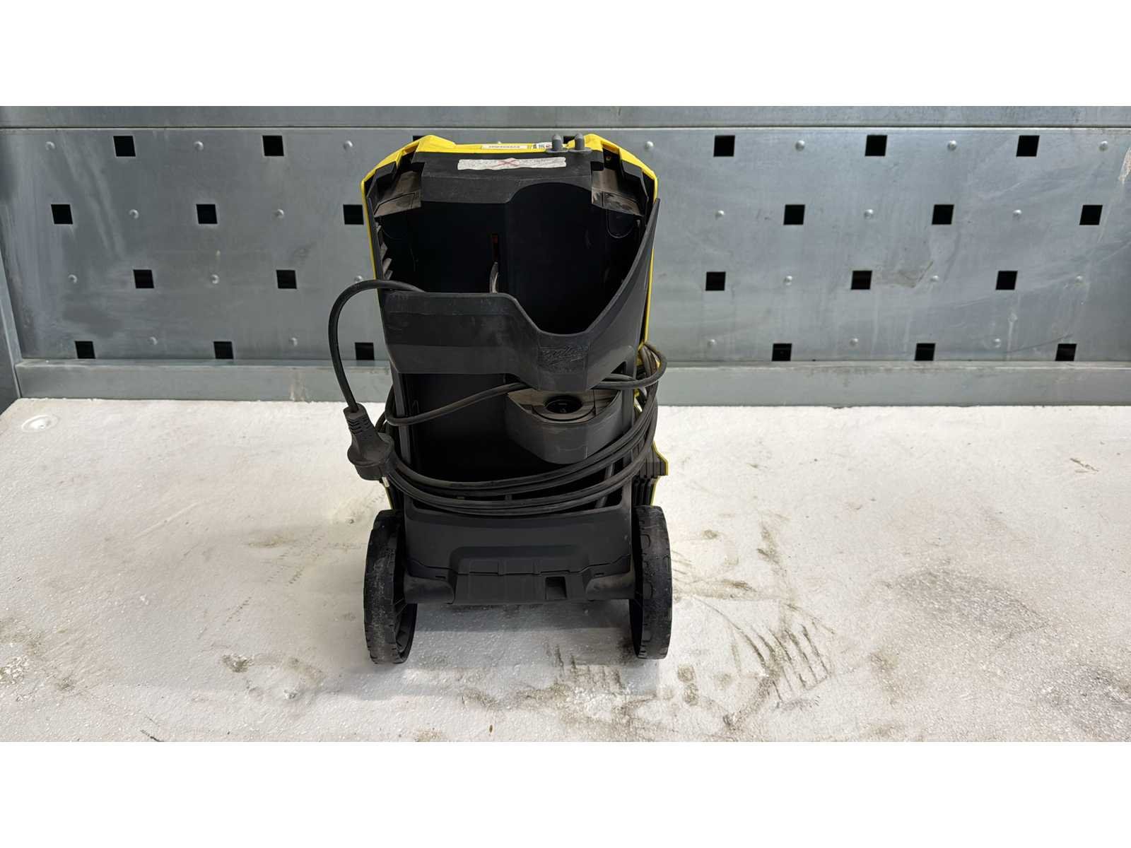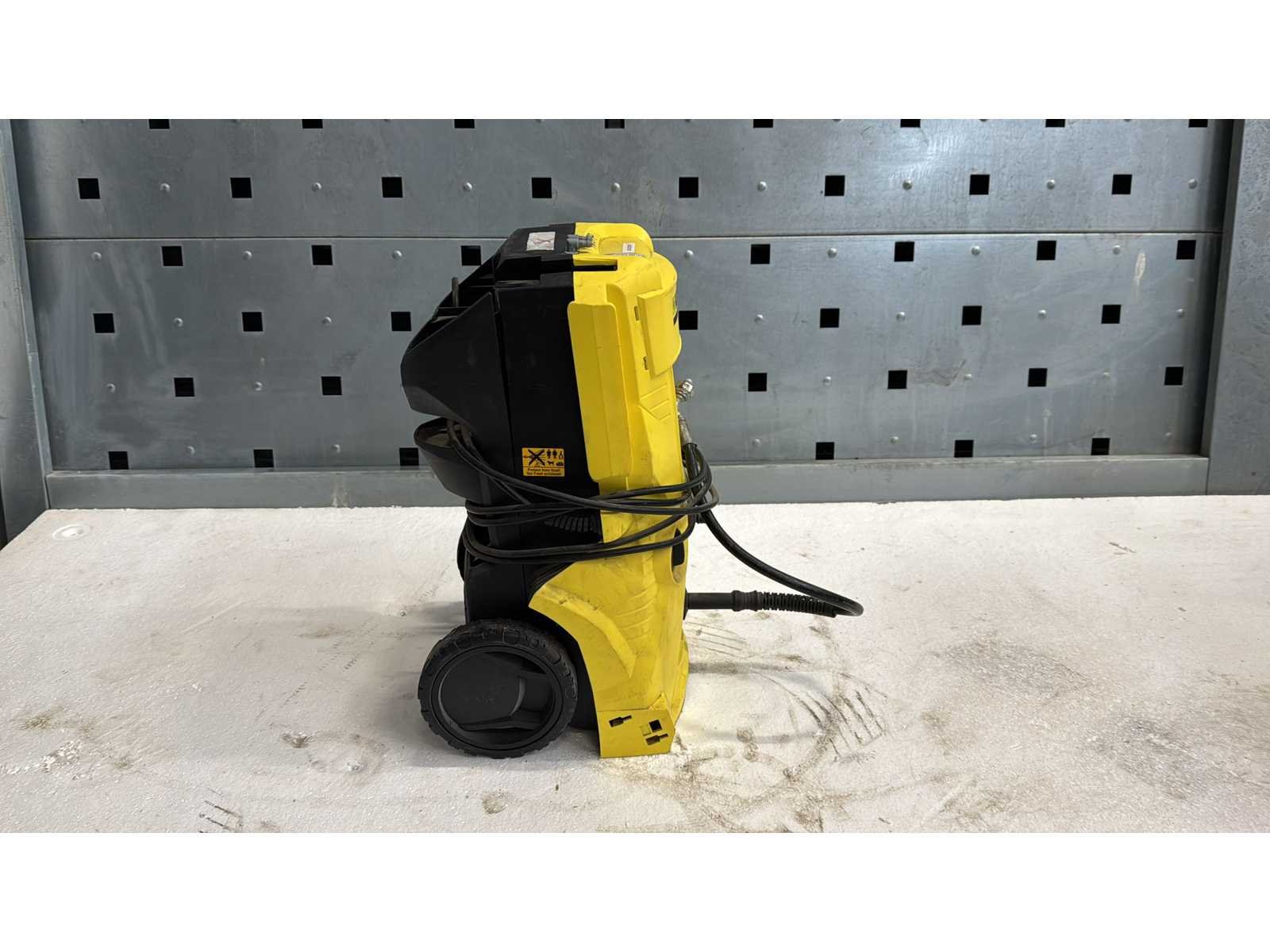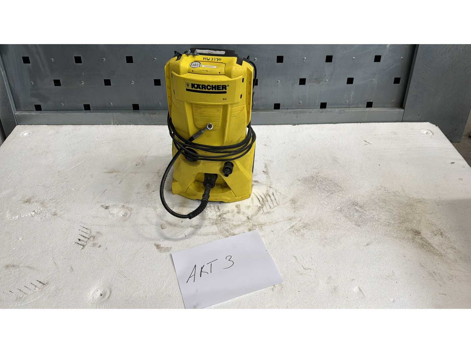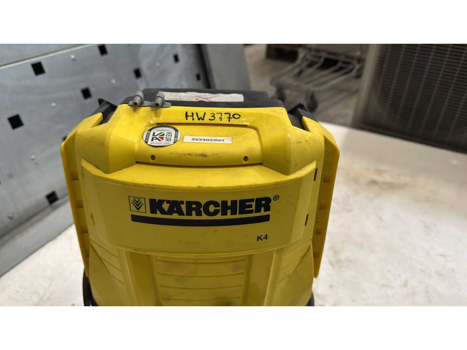 ; Mobiele hogedrukreiniger; model K4, met draagbeugel en slang-aansluiting; Bouwplaats/werkplaats-uitvoering; Gebruikte staat met zichtbare gebruikssporen; Serienummer sticker aanwezig; Functionele reiniger geschikt voor veelzijdige drukreiniging; Merk: Kärcher Type: K4