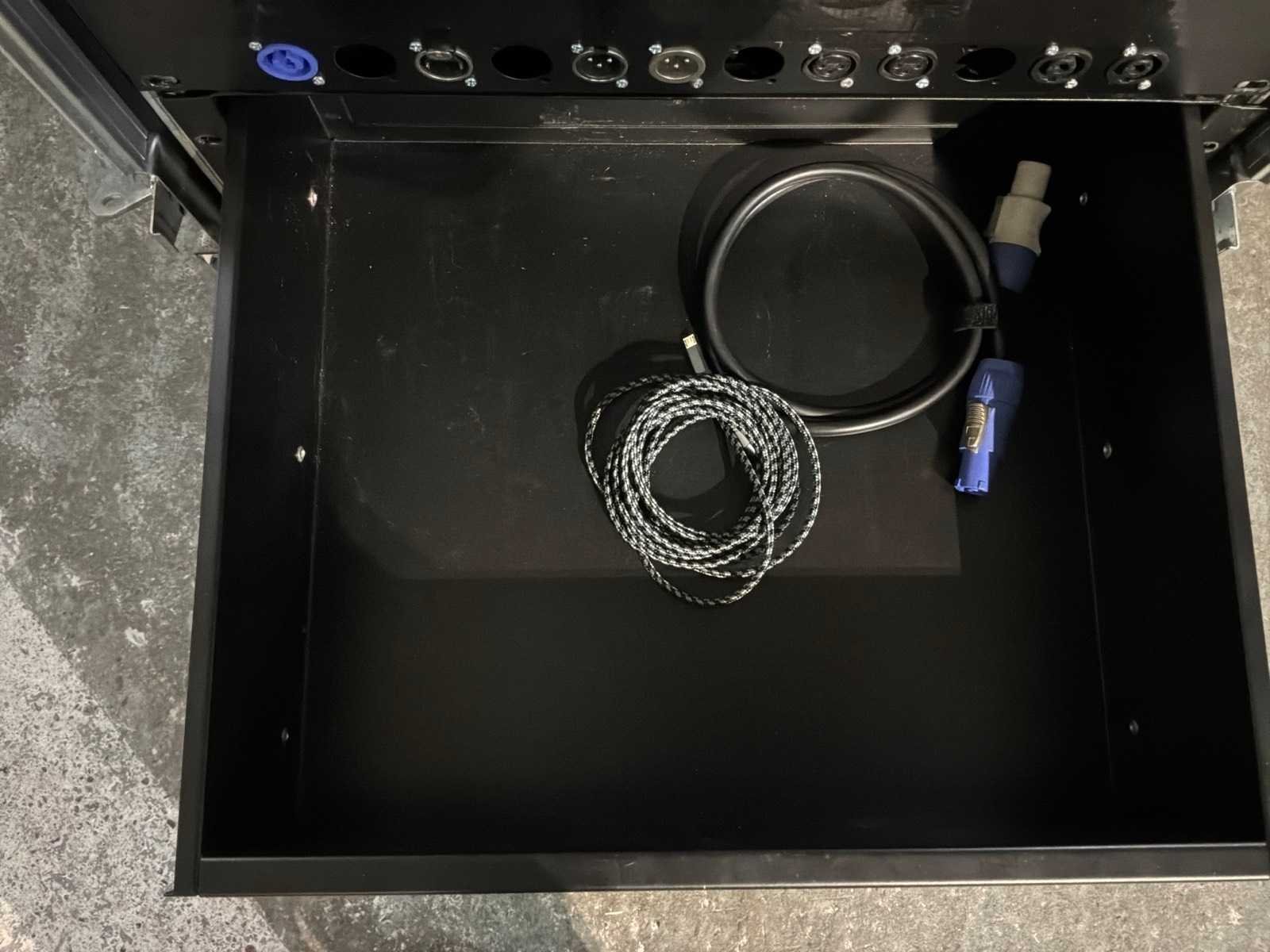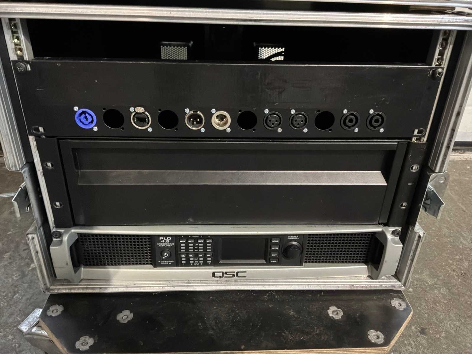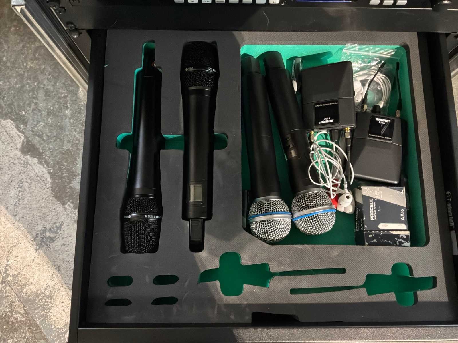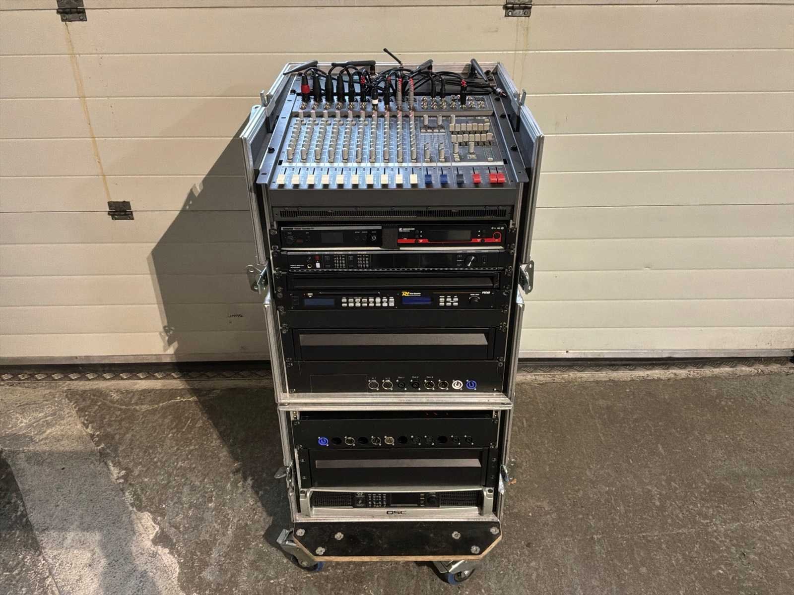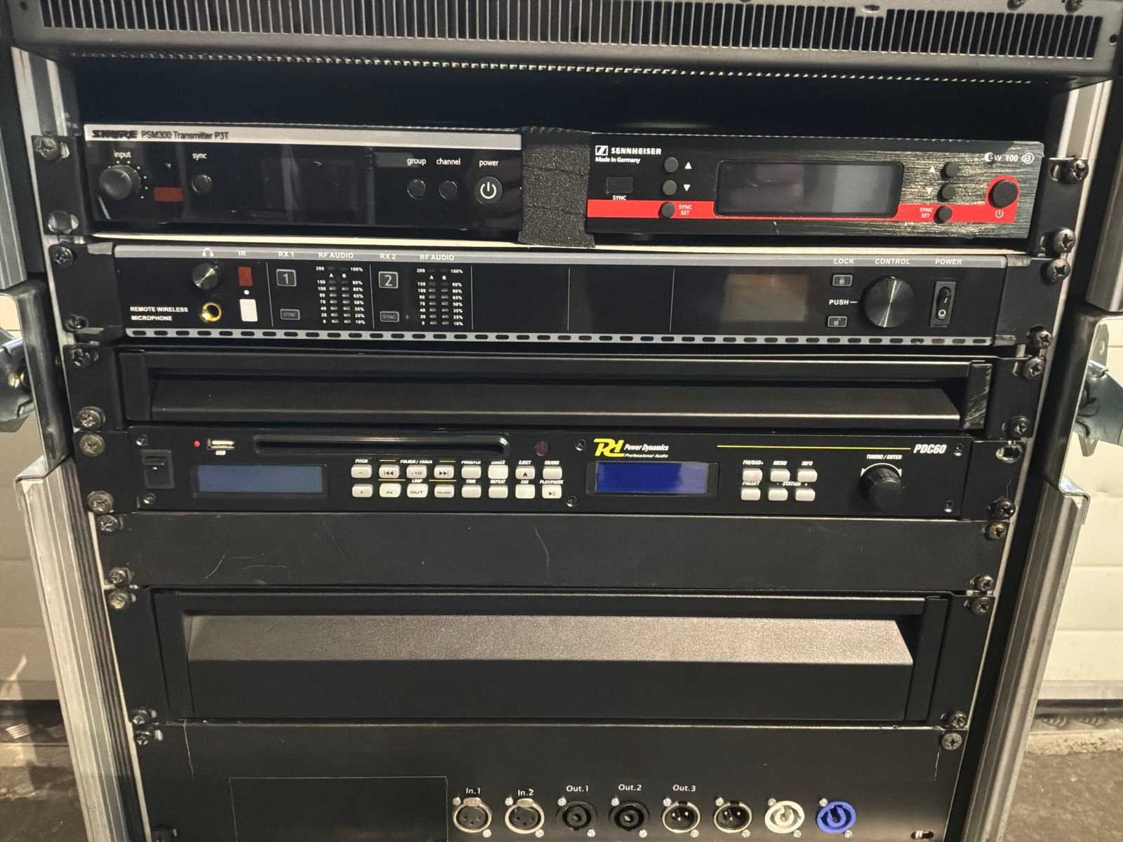 Voorzien van: Dynacord PowerMate 1000, Shire PSM300, Senheiser EW100 G3, Powerdynamics mediaspeler, QSC PLD versterker. 2 x senheiser E835 handhelds, 2 x Shure P3RA draadloos monitorsysteem. Ingebouwd in flightcase. Lengte: 67cm Breedte: 54cm Hoogte: 126cm