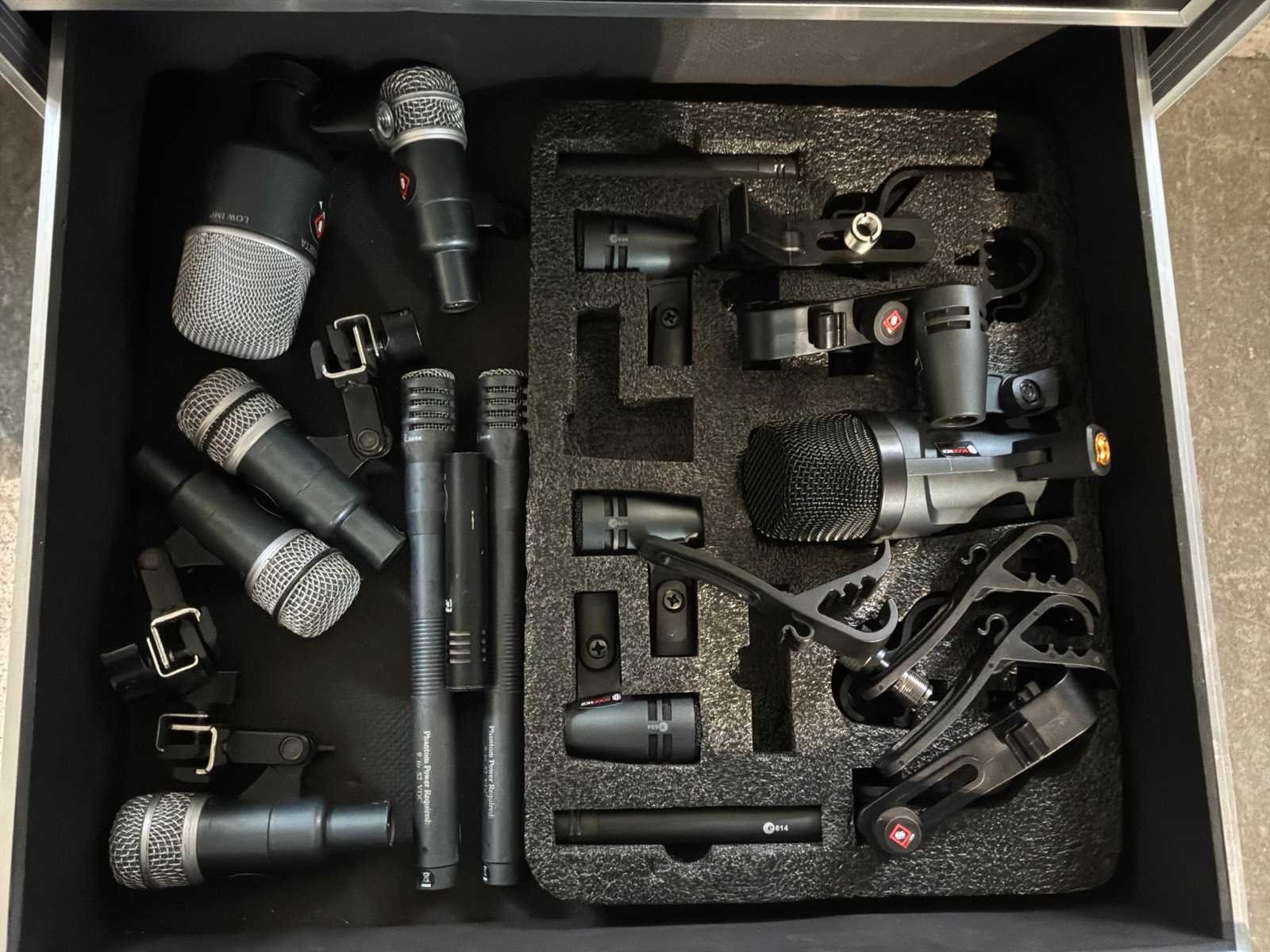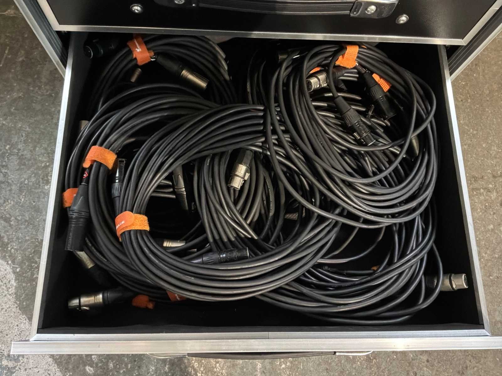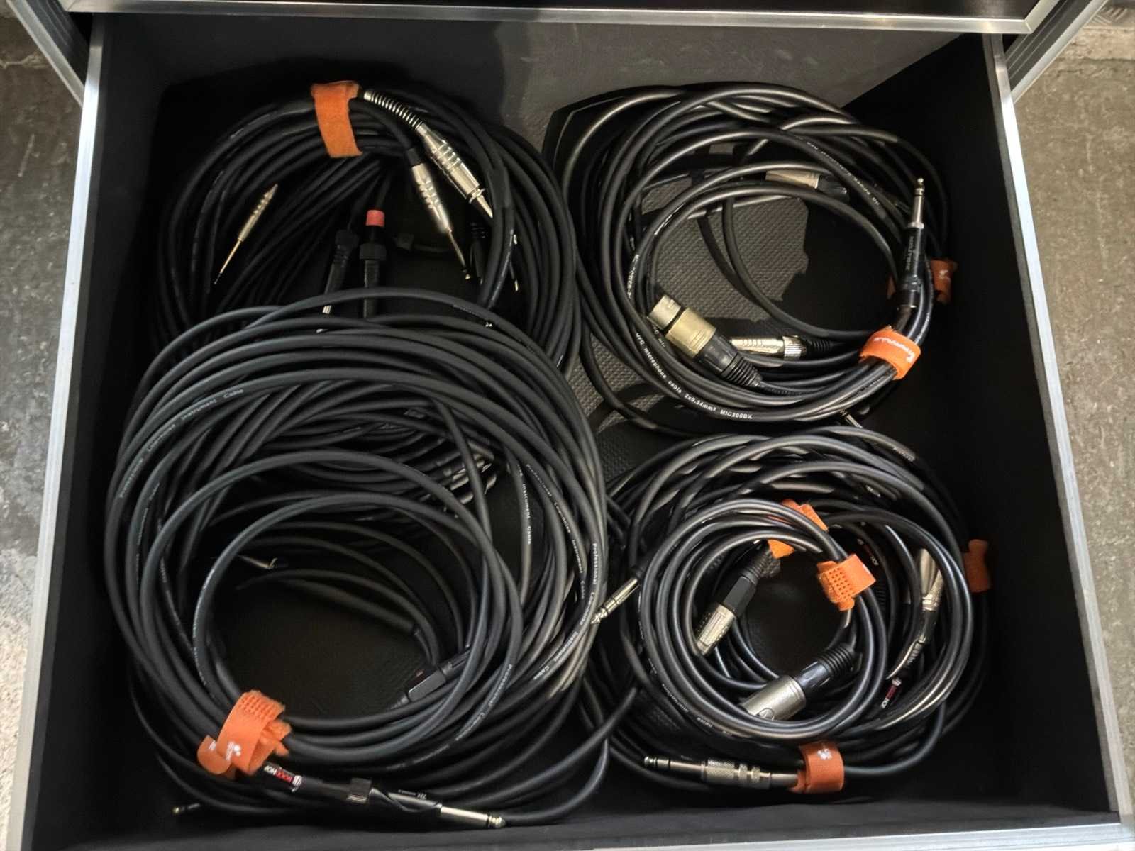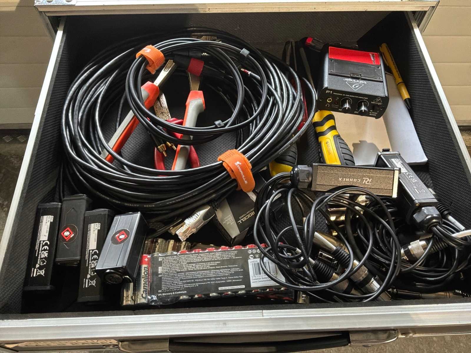Voorzien van: diverse kabels, Shure microfoons (6x), 5 x Klark Tecnik DI, 2x Powerdynamics DI, 1x Behringer monitormixer, 2x drummicrofoonset 1x merkloos, 1- t.bone. 1X shure beta 91A, 2x Senheiser e906, diverse verkoopkabels, XLR kabels, 1x stageblok 10 kanaals. Lengte: 54cm Breedte: 54cm Hoogte: 110cm