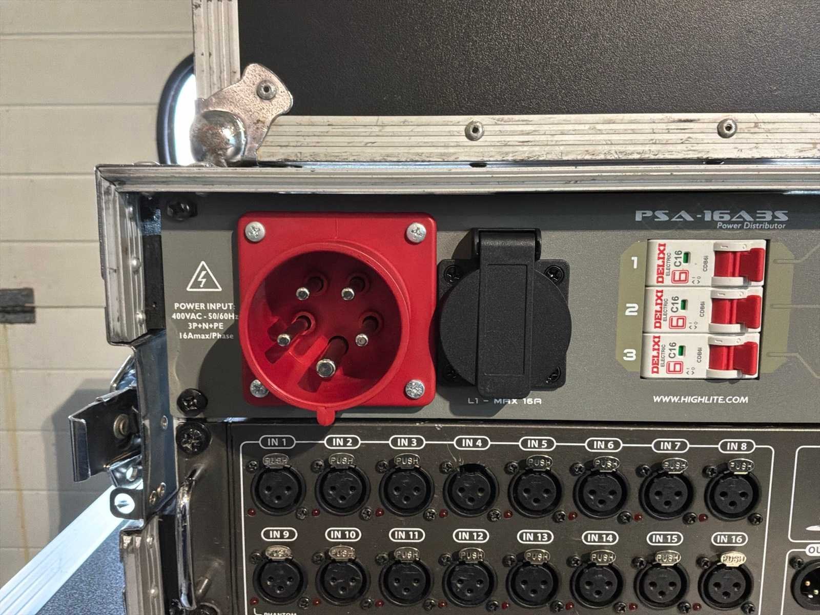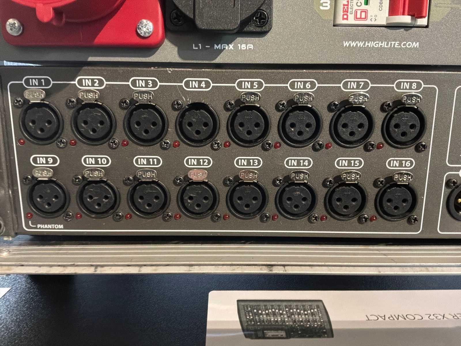 Inclusief Behringer S16 stageblok, showgear PSA 16A 3S stroomvoorziening. In flightcases ingebouwd. Merk: Behringer Type: X32 compact Serienummer: S170601929AAP Aantal kanalen: 32 Aantal kanalen inkomend: 16 Aantal kanalen uitgaand: 8 Aantal flexibele kanalen: 8 Aantal aes/ebu uitgangen: 2 Met flightcase: true