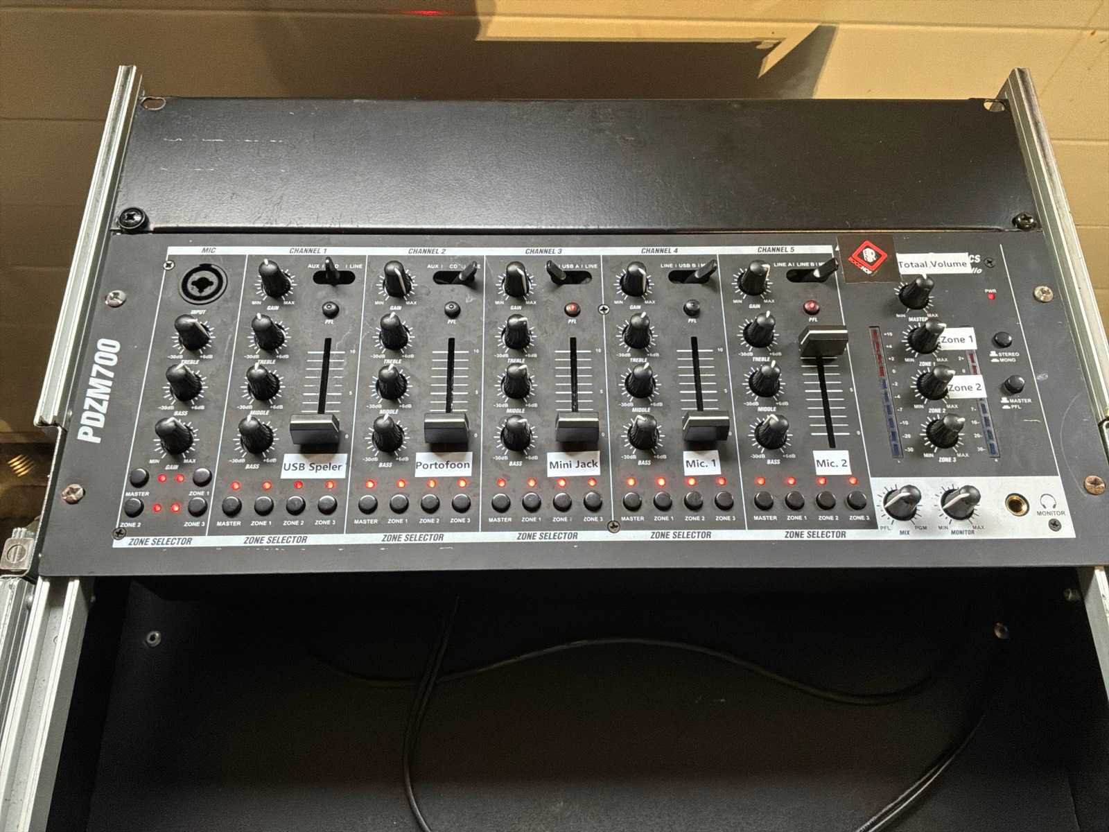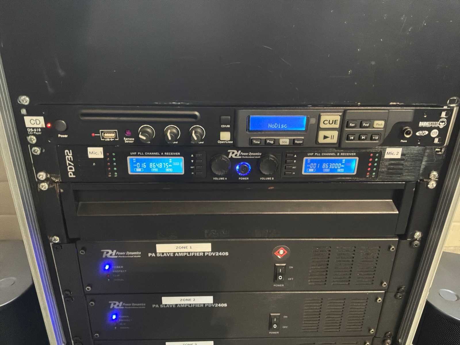 100V systeem, 3x PDV240S versterker, 1x PDZM700 mengtafel, 1X Darkshade mediaspeler, draadloos microfoonsysteem 4x handheld 3x ontvanger. 4 QSC 100V Luidspreker. Merk: Power dynamisch Aansluiting: 230V Totale afmeting L: 680mm Totale afmeting Breedte: 530mm Totale afmeting Hoogte: 107mm