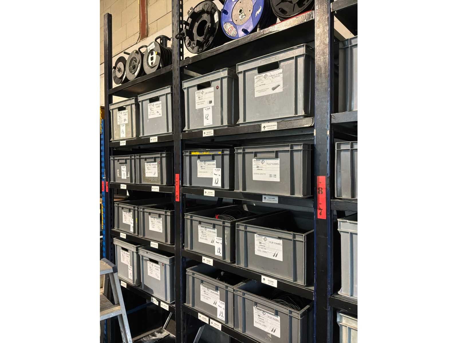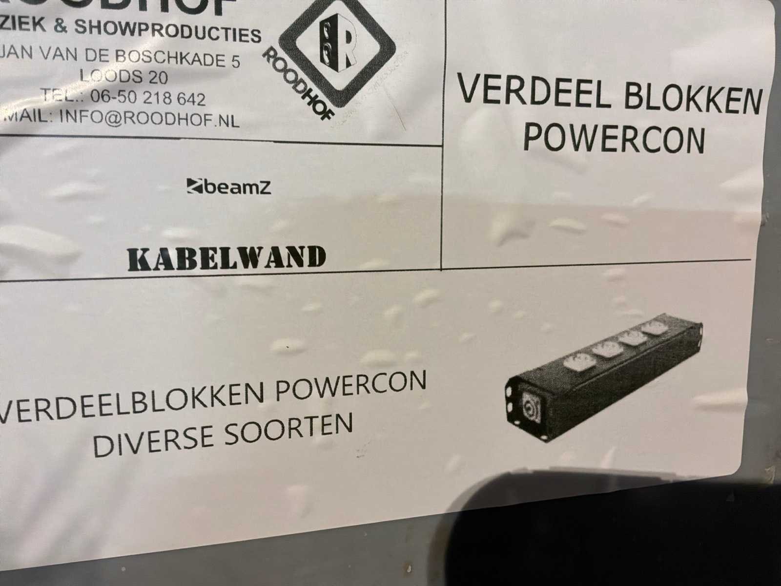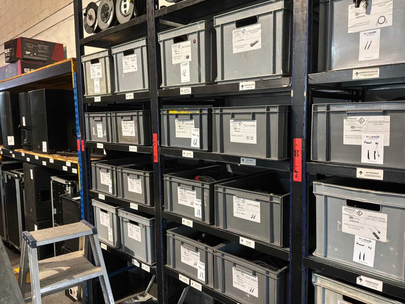 Verpakt in 8 kratten en 3x haspel. Waaronder: diverse verlopen CEE, Powercon verdeelblokken, Jack kabels, rca kabels, XLR kabels.