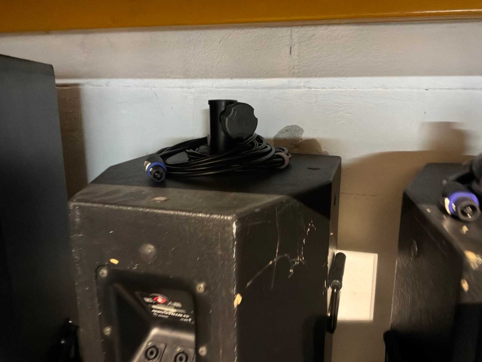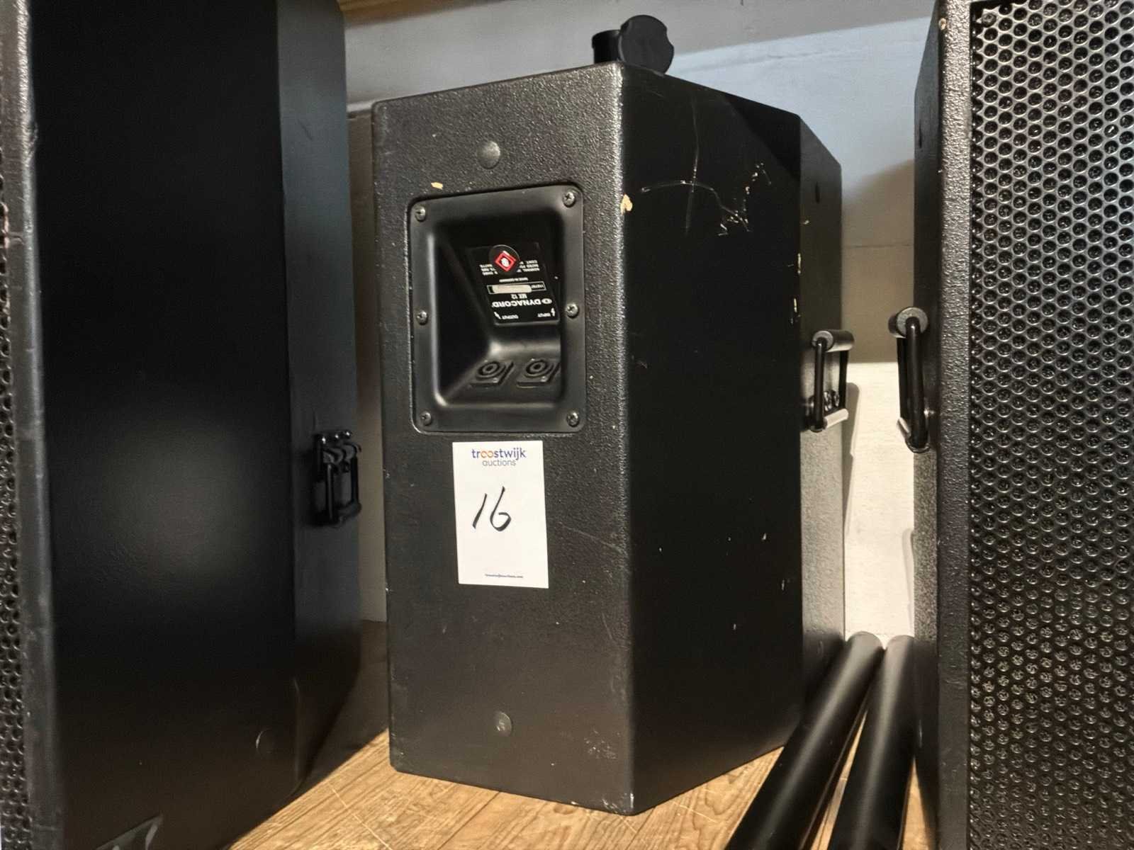Voorzien van: tussenpalen en koppeling. Merk: Dynacord Type: MX12 Capaciteit.: 8O Vermogen: 300W Totale afmeting L: 430mm Totale afmeting Breedte: 360mm Totale afmeting Hoogte: 510mm