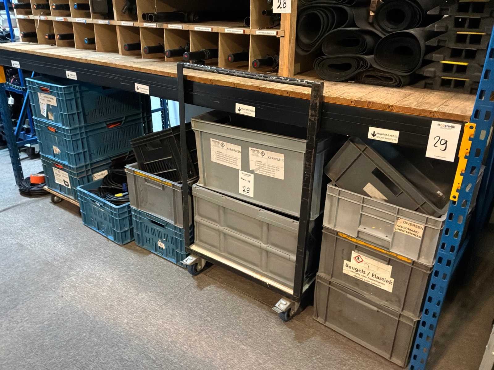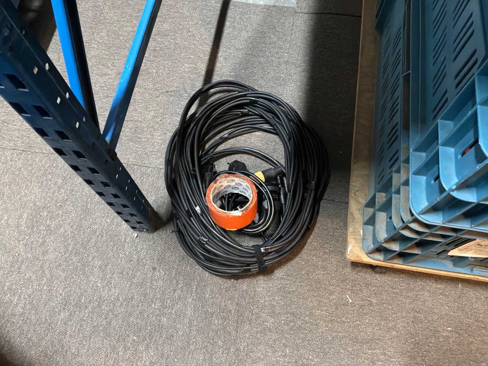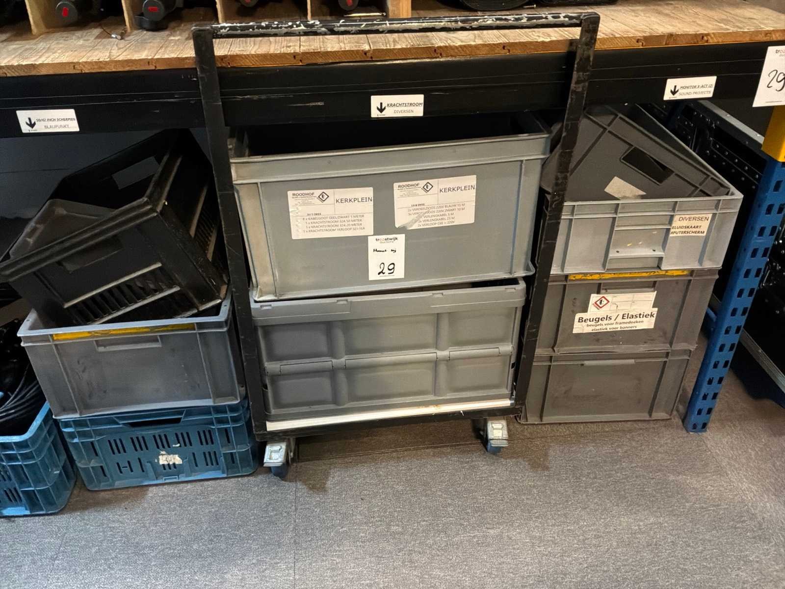 100 volt bekabeling(3x kist) diverse bekabeling (1x kist) lege kisten (12x), transportwagen (1x)