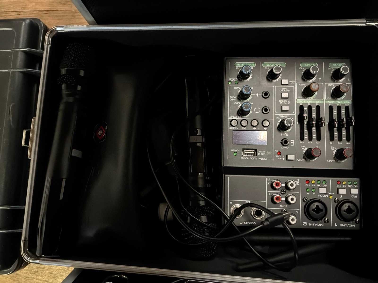 Inclusief mengtafel, 2 microfoons. Geen software aanwezig