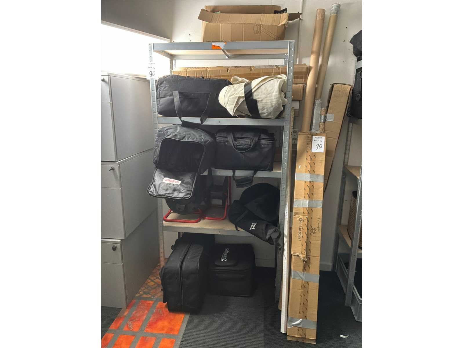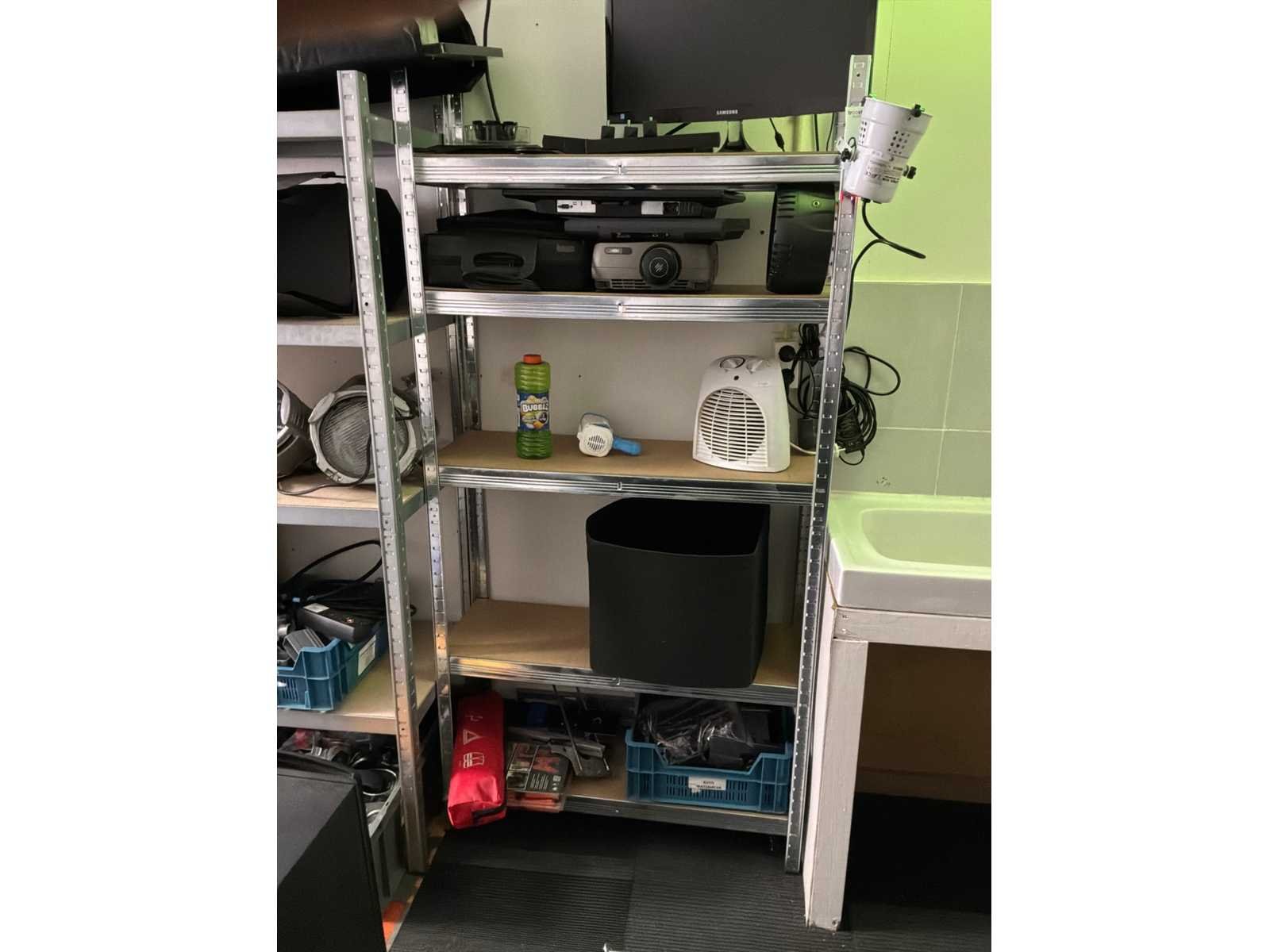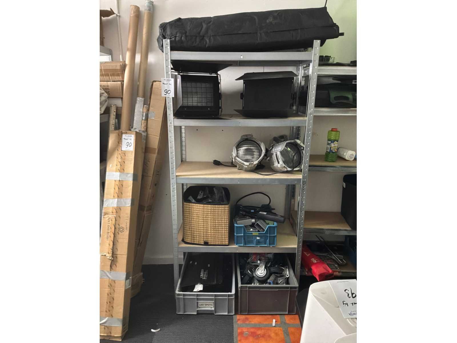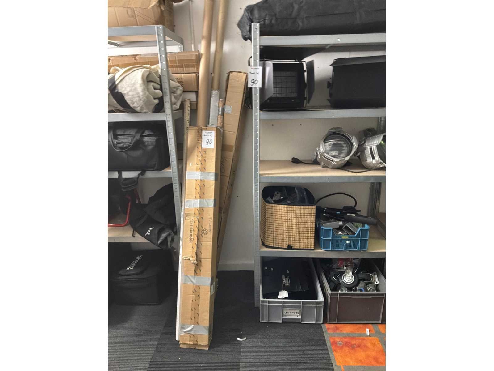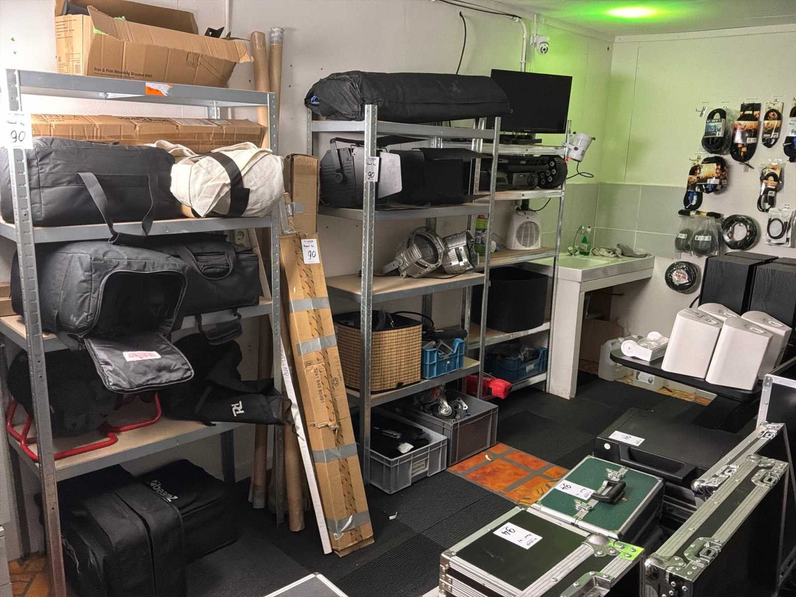 Waaronder: monitor, beugels, beamer, chassisdelen, lampen, beursmateriaal, doeken en tassen, haspel. Inclusief stelling.