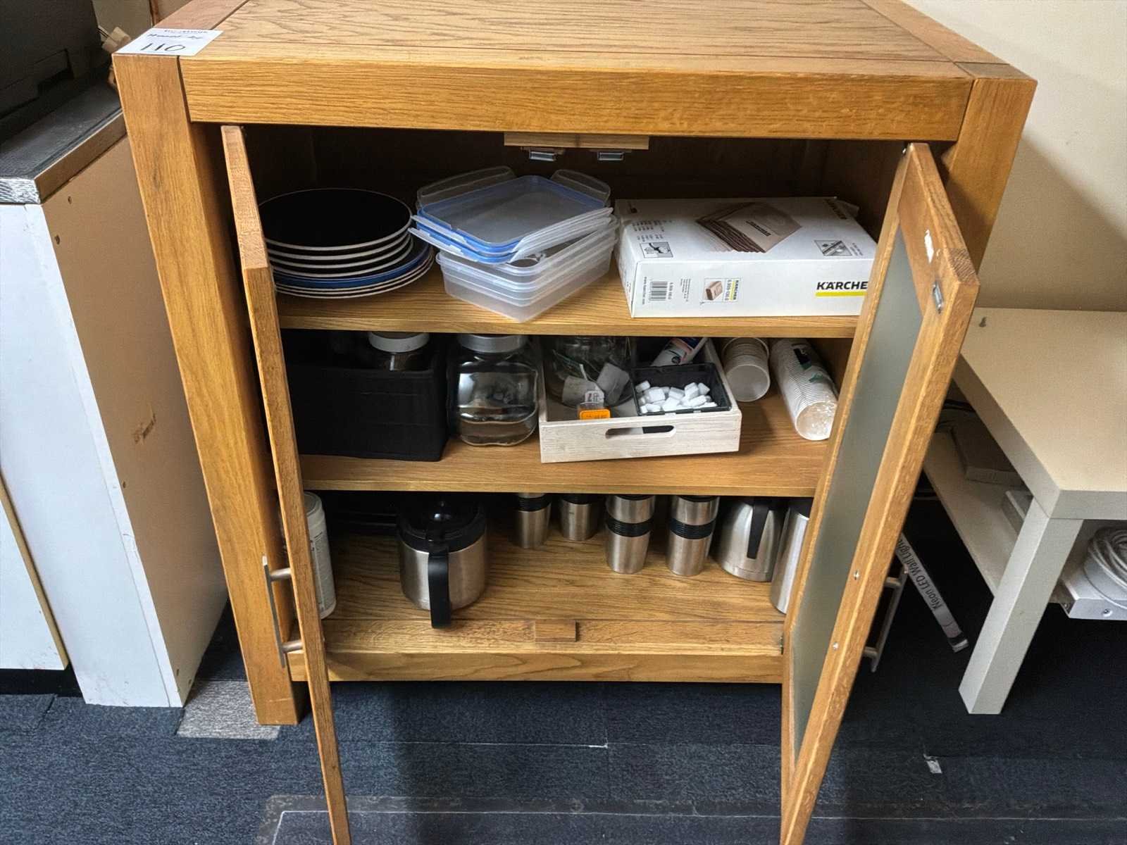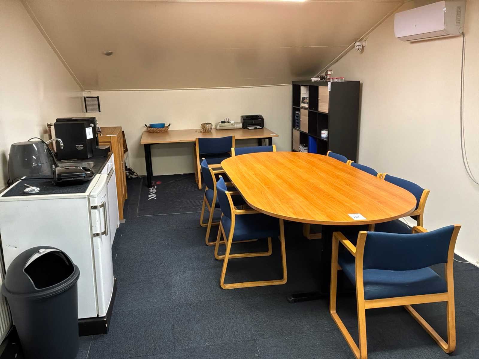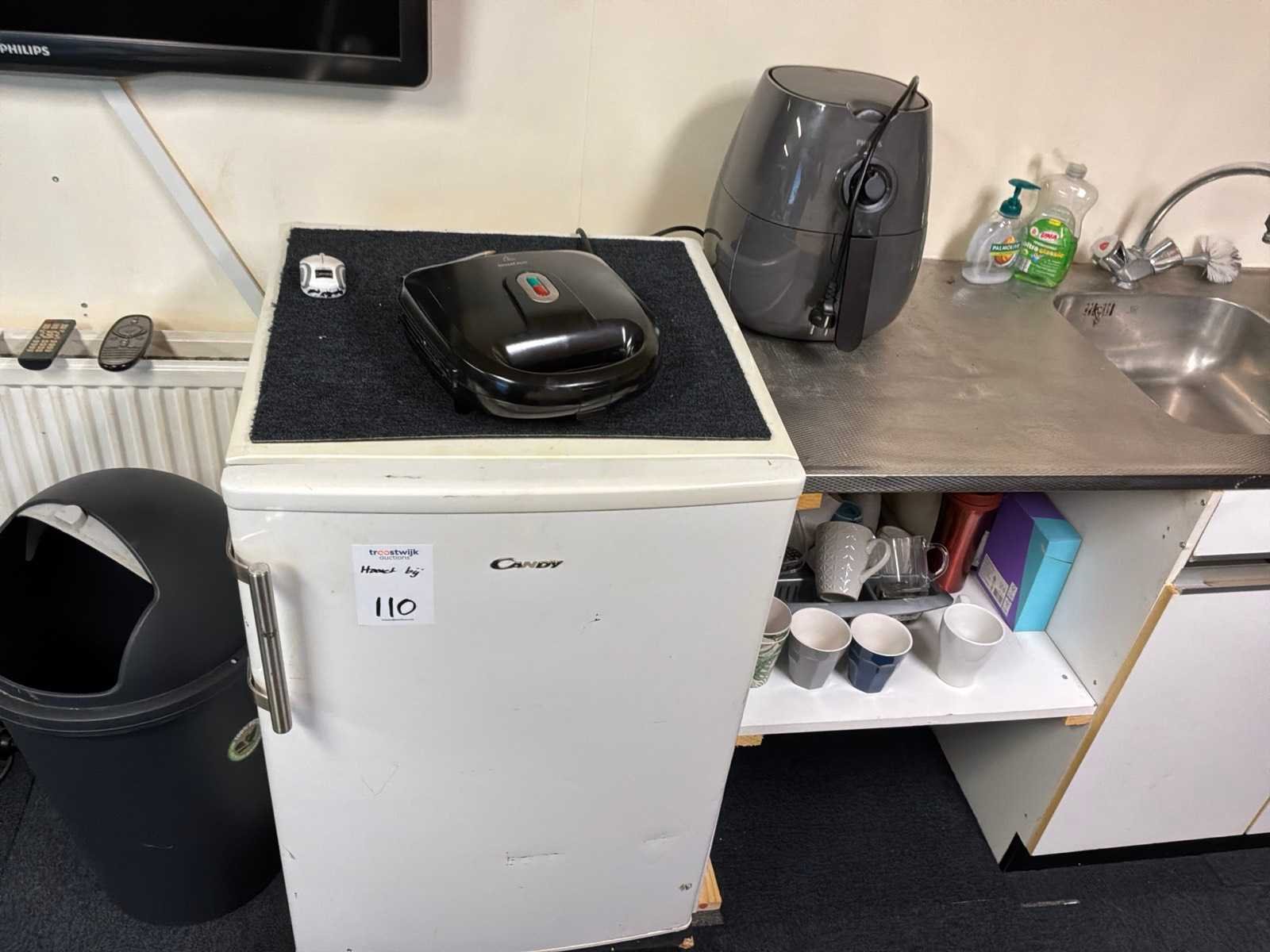 Waaronder: 1x Phillips televisie, 1x Candy koelkast, 1x tosti ijzer, 1x Phillips airfryer, 1x opbergkast met inhoud, 1x salontafel met inhoud en radio, 1x bureau met stoel, lamineerapparaat, printer, vakkenkast met inhoud, 1x vergadertafel met 7 stoelen, servies uit de keuken.
